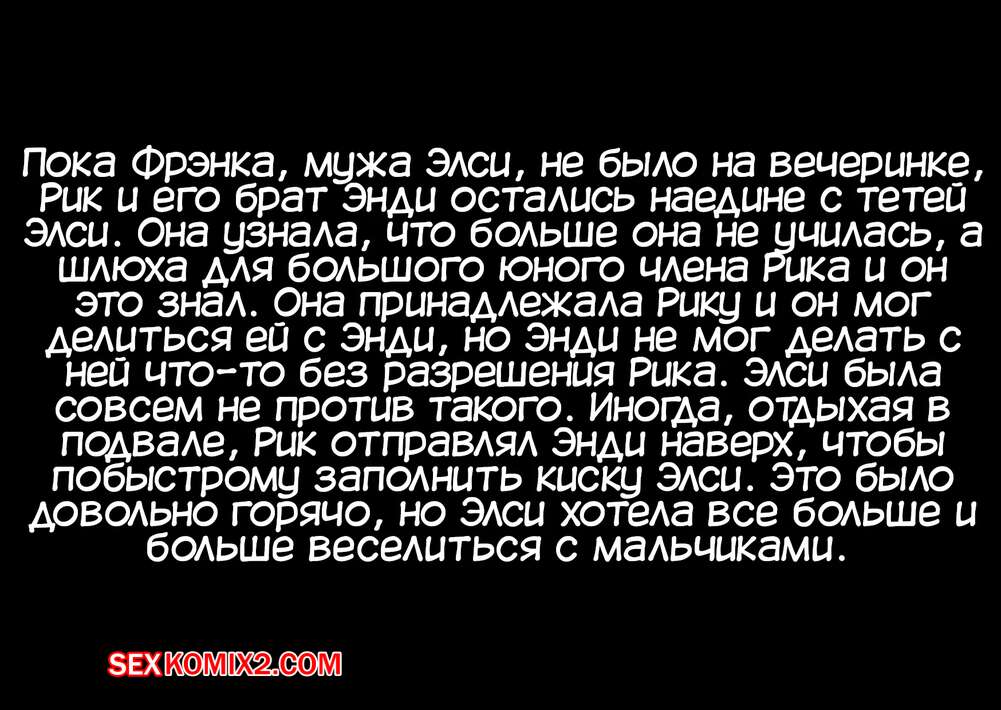 Порно комикс Тетя Элси. Часть 4. Aunt Elise Mature3DComics Рик и Энди устроили сюрпризи для Элси и пригласили ее сына Дэрила присоединиться к веселью. Парни раздели красотку и выебали ее во все дырочки, заполнив своей горячей спермой.