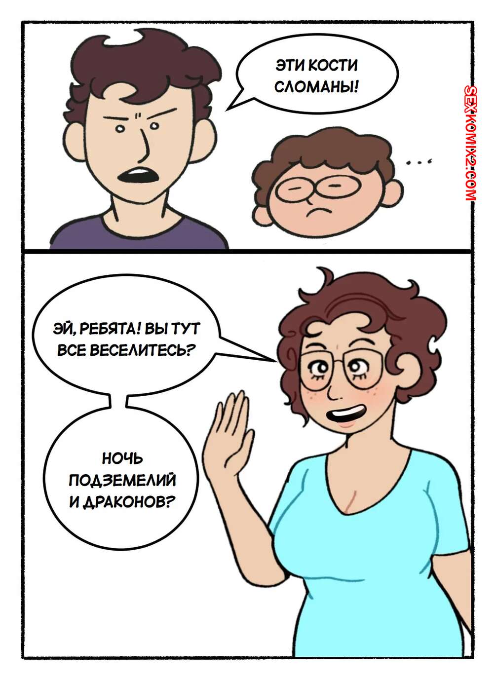 Порно комикс Мама. Не прерывай нашу кампанию DnD. Часть 1. DeadEndDraws Парень пригласил своих друзей, чтобы поиграть в DnD. Они увлеклись игрой, но им помешала мамка парня, которая решила повеселиться с сыном и его друзьями. Милфа разделась и возбудила парней своим телом, после чего стала сосать их члены.