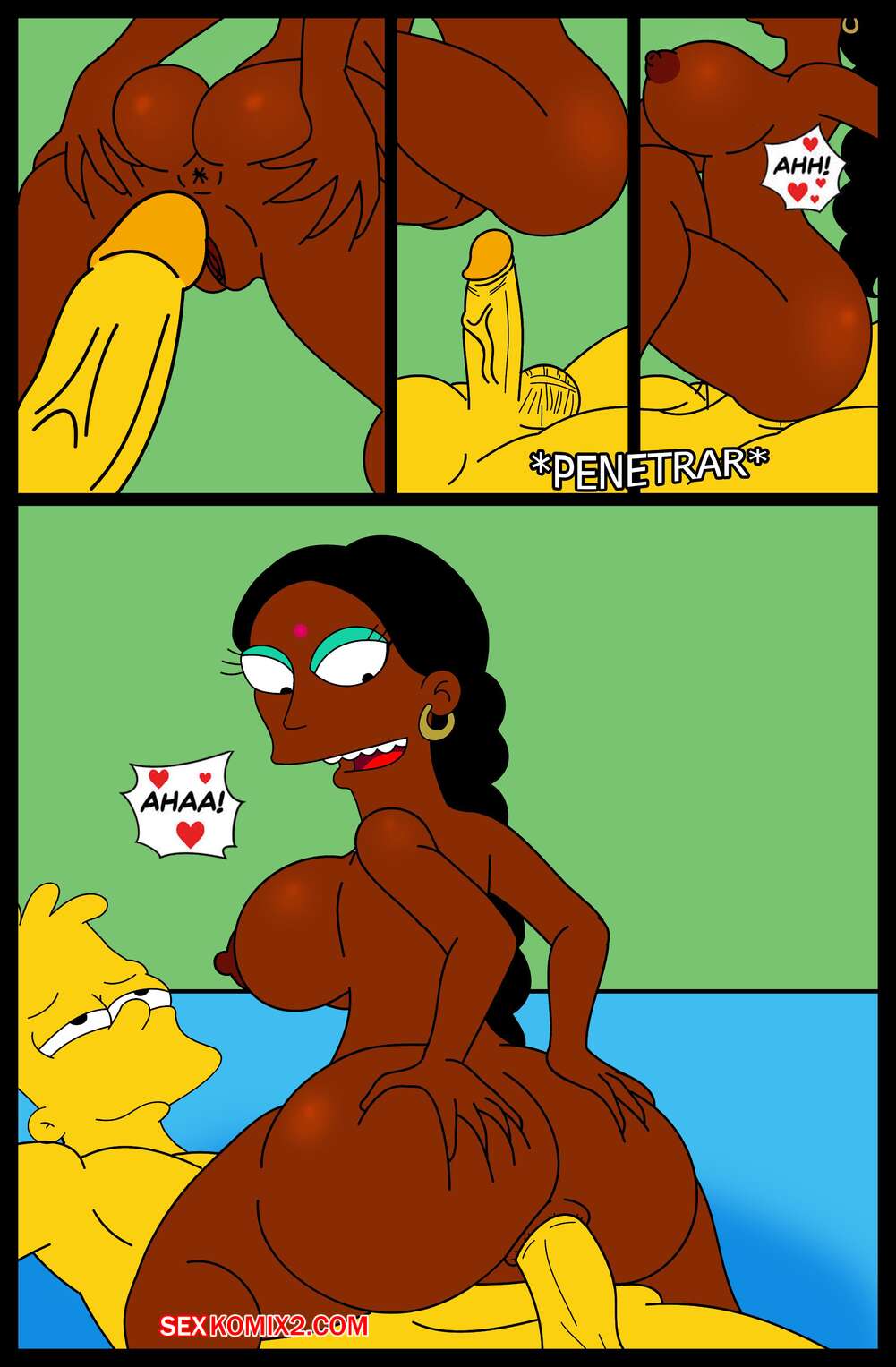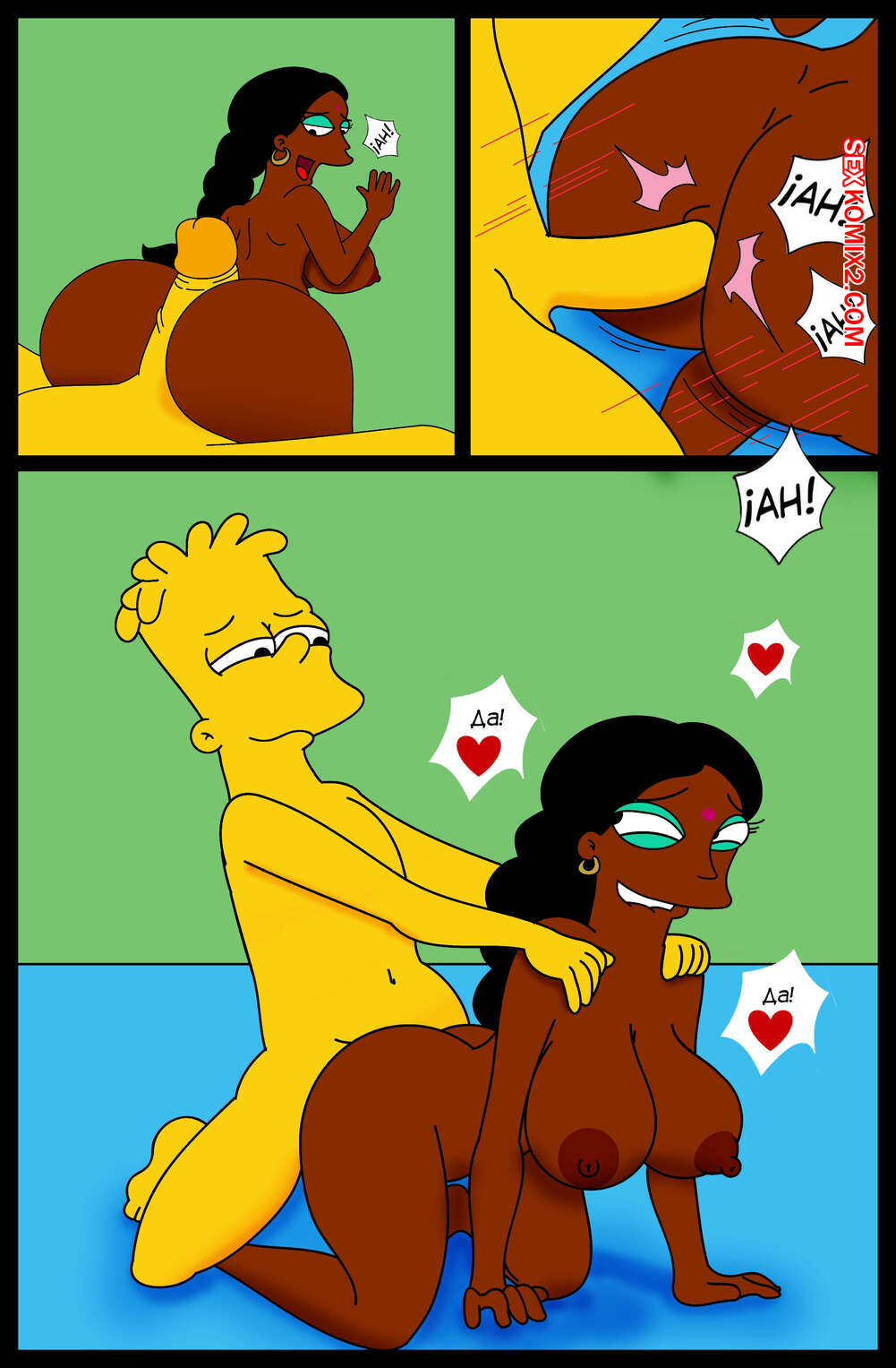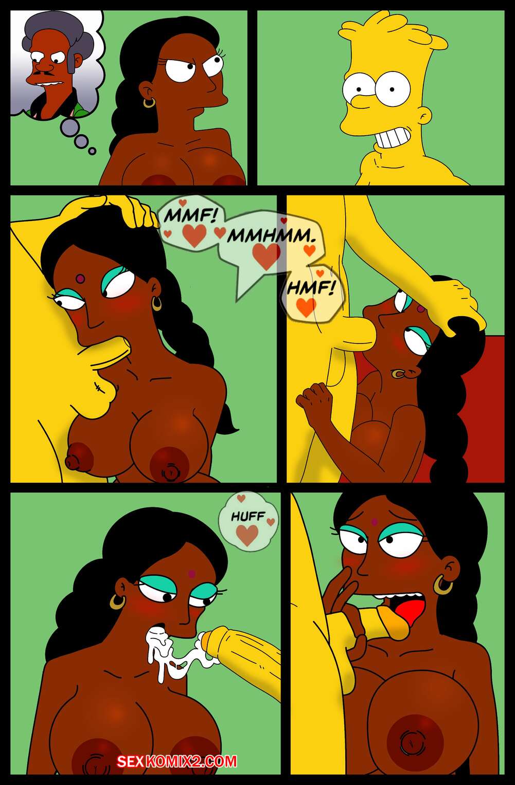 Порно комикс Simpson XXX Bart X Manjula. Ferozyraptor Барт подрабатывал в магазине, где на него положила глаз сексуальная милфа. Она пригласила парня к себе и отсосала его член, после чего дала ему выебать свою пизденку.