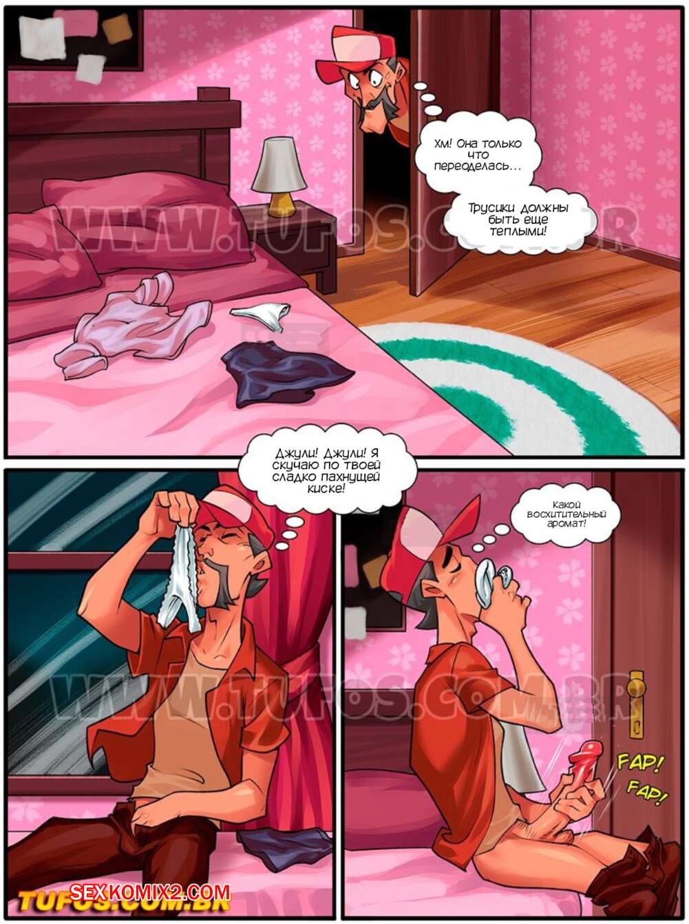 Порно комикс Факультет. Часть 13. Tufos Джули застала своего отчима за дрочкой ее трусиками и это возбудило девушку. Она стала сосать большой хуй мужика, но за этим делом их увидел Брэд. Девушка дала двум парням выебать себя во все дырочки, после чего они кончили ей на лицо.