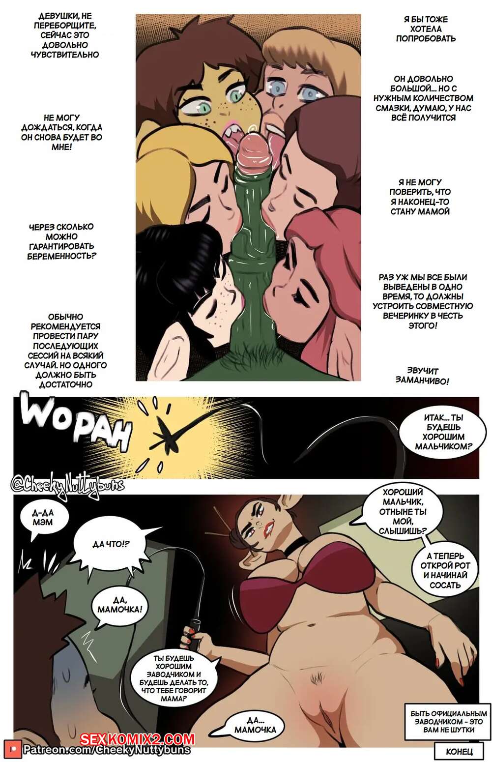 Порно комикс Помощь в спаривании. Часть 2. Mating Help. Cheeky Nuttybuns Горячие красотки пригласили своего дружка, желая с ним повеселиться. Они увеличили хуй парня и стали ему отсасывать, после чего дали ему себя хорошенько выебать.