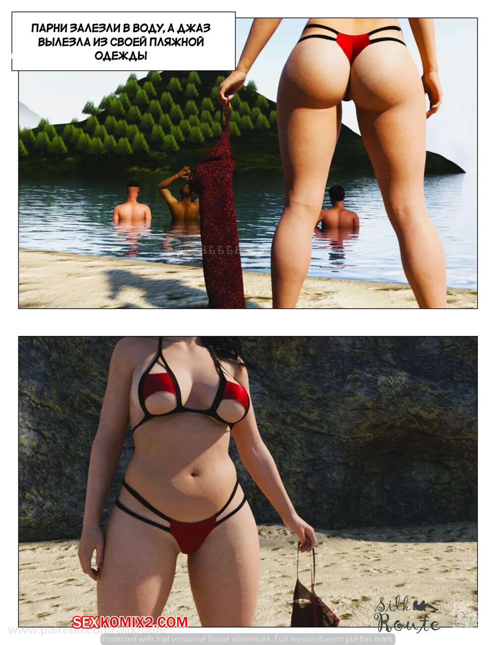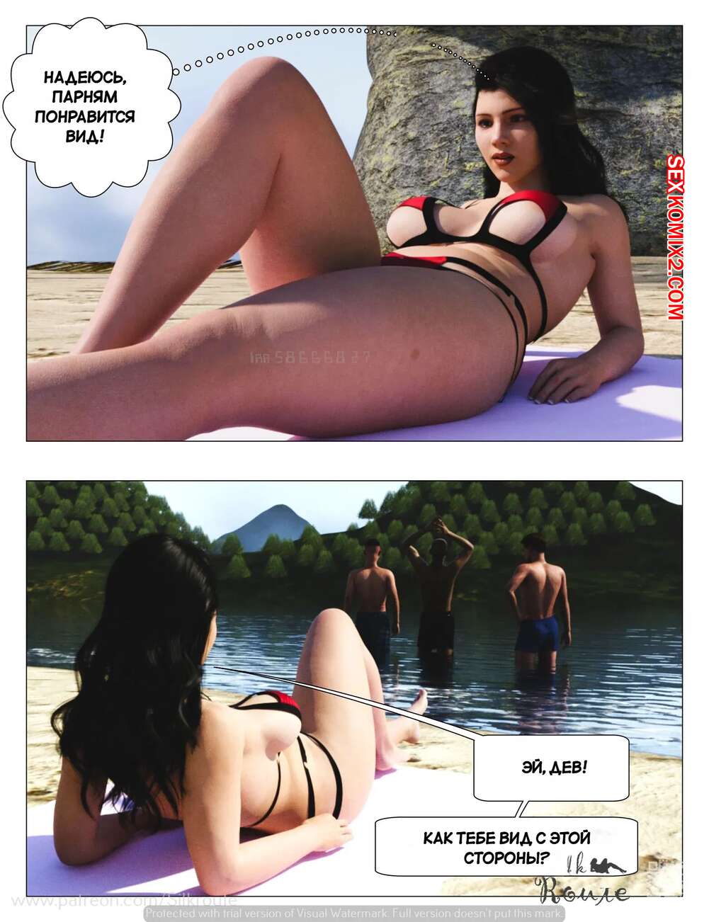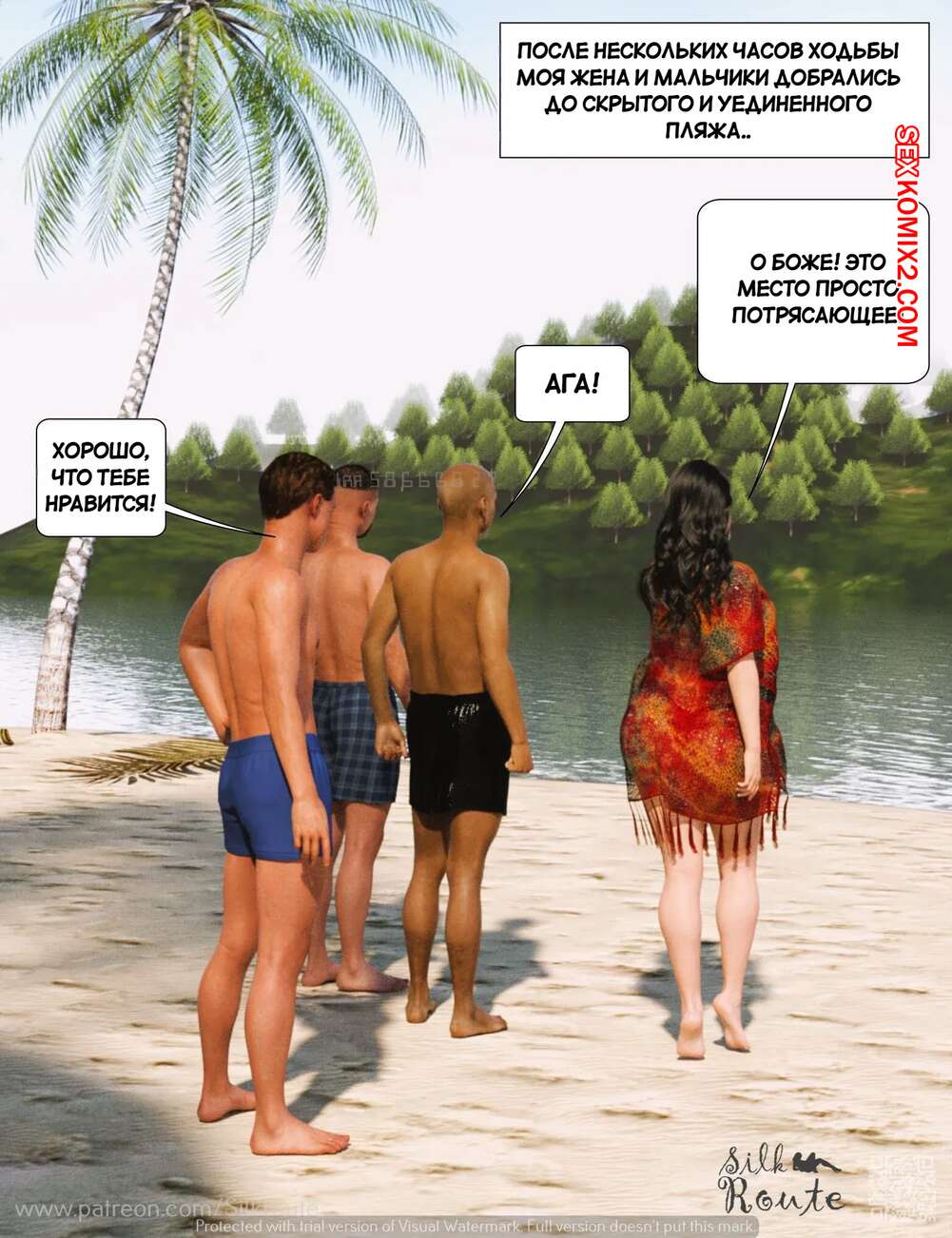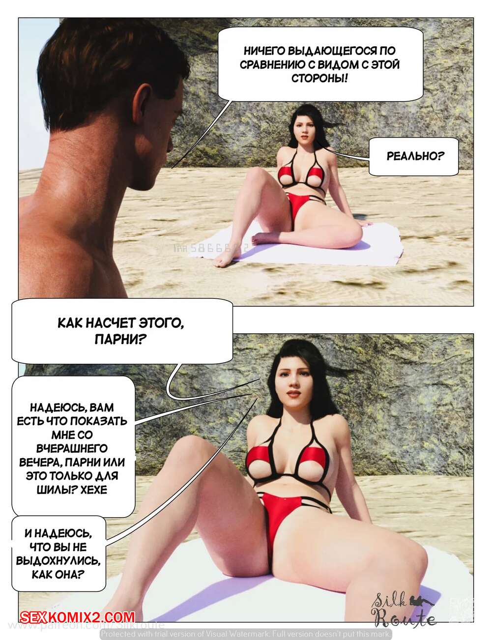 Порно комикс Отпуск. Часть 1. Vacation. Silk Route, Ira Raman Горячая милфа с шикарным телом приехала с мужем в отпуск на курорт. Во время отдыха на пляже, красотка привлекла внимание нескольких парней и решили с ними повеселиться, начав сосать их члены.