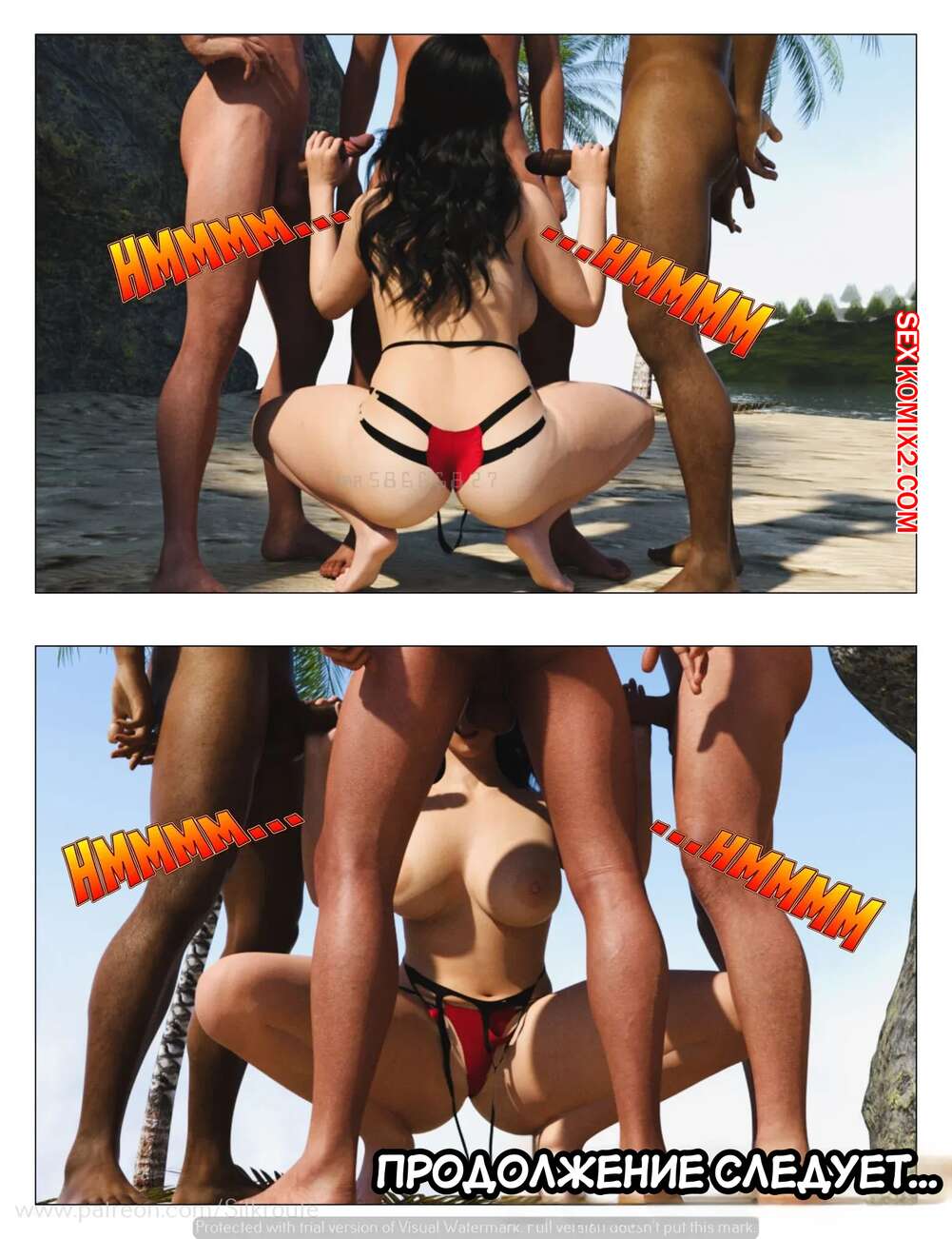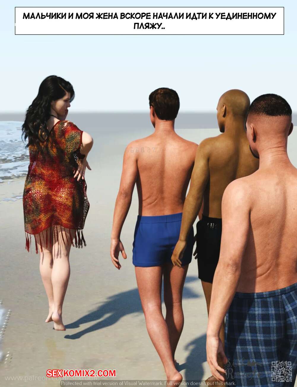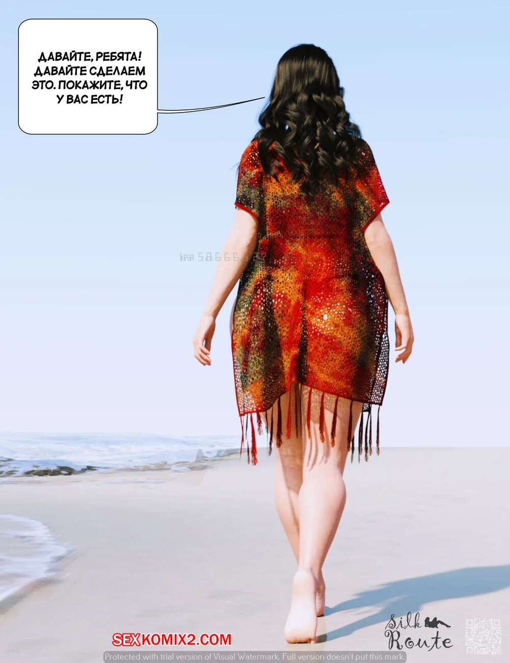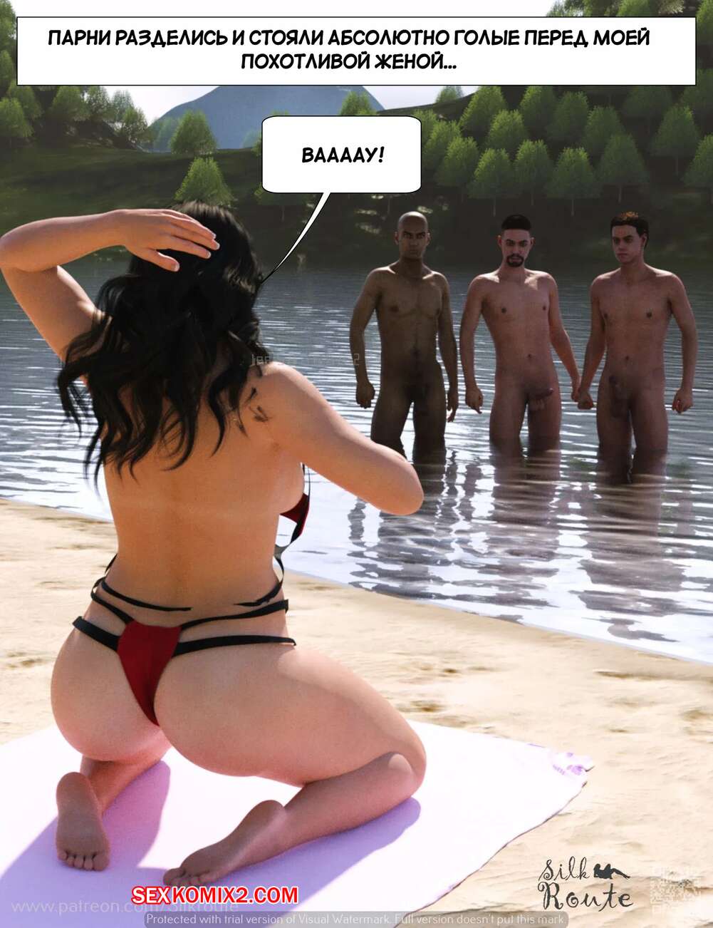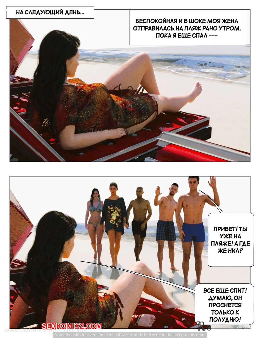 Порно комикс Отпуск. Часть 1. Vacation. Silk Route, Ira Raman Горячая милфа с шикарным телом приехала с мужем в отпуск на курорт. Во время отдыха на пляже, красотка привлекла внимание нескольких парней и решили с ними повеселиться, начав сосать их члены.