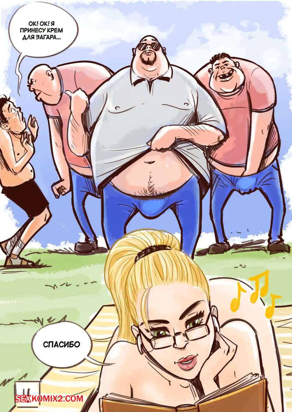 Порно комикс Хорошее место. Nice Place. Disarten Горячая блондинка отправилась со своим парнем в хорошее место, чтобы позагорать. Шикарное тело девушки привлекло внимание нескольних парней, который выебали блондиночку прямо на глазах ее любимого.