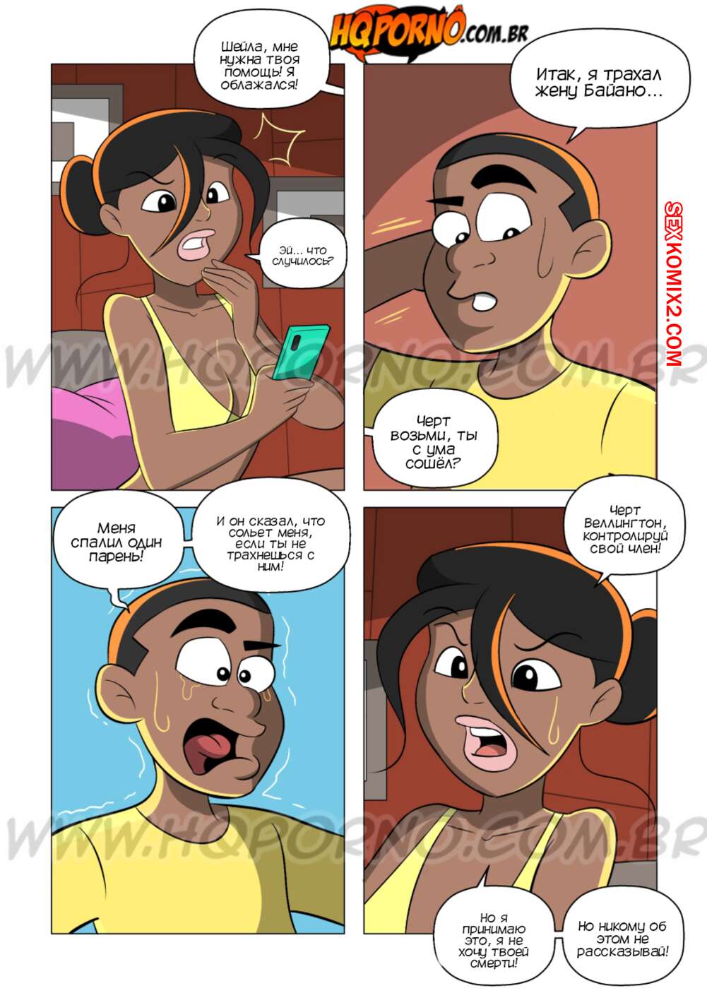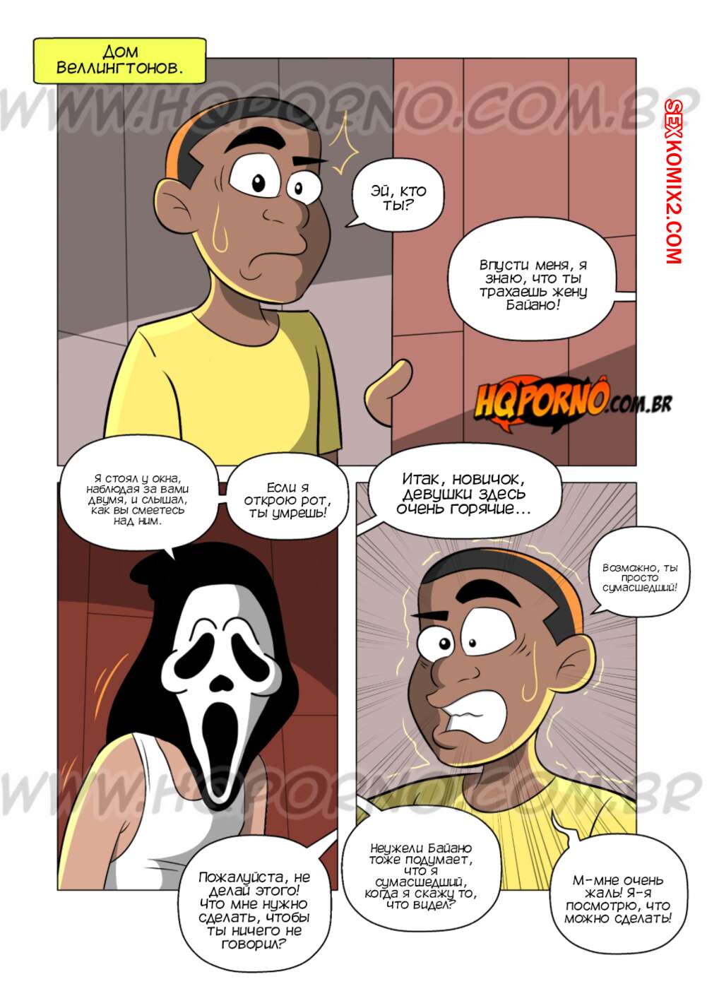 Порно комикс Семейка черных. Часть 11. Familia Black. HQporno Парень в маске стал шантажировать Веллингтона, чтобы трахнуть его сестру и мамку. Красотки беспокоятся на паренька, поэтому соглашаются и трахаются с парнем в маске.