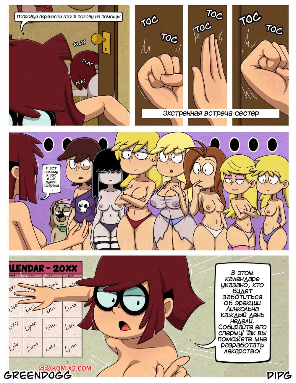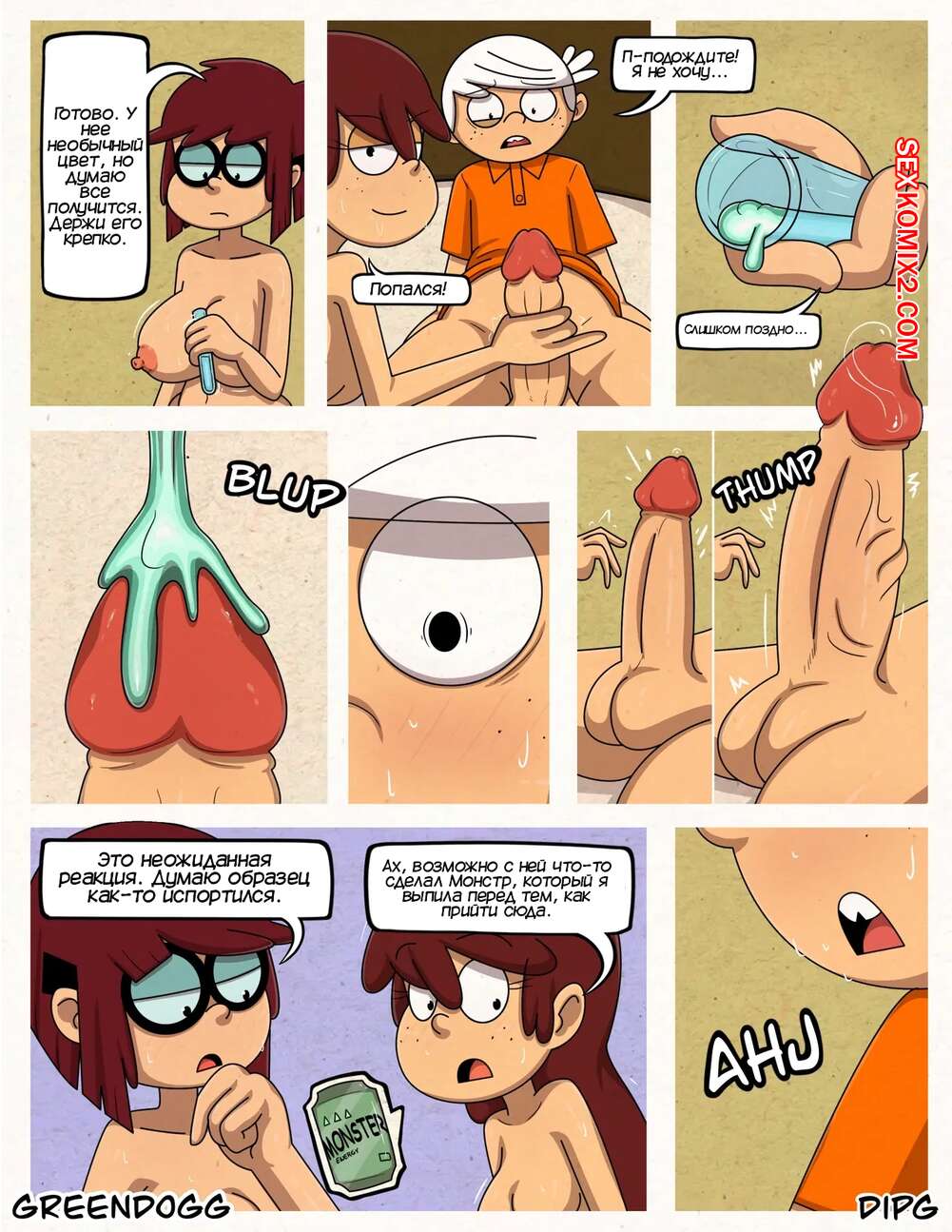 Порно комикс Шумный дом. Сексуальный инстинкты. Sexual Instincts. Greendog Горячая брюнетка вышла из душа голой и решила повеселиться с Линкольном. Она уложила парня на кровать и стала дрочить его член, желая получить его горячую сперму.