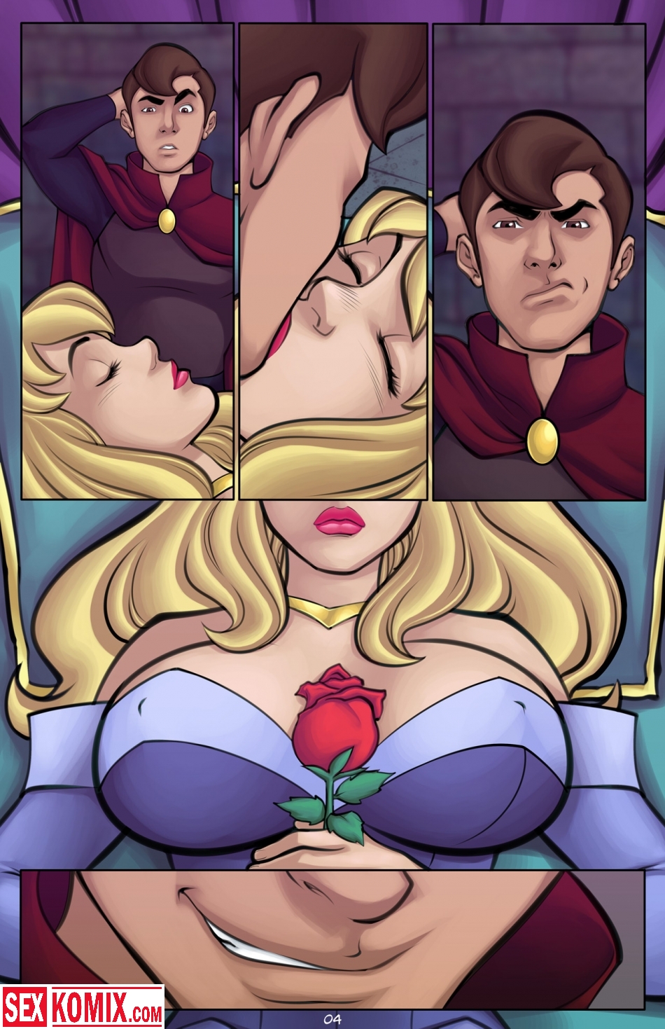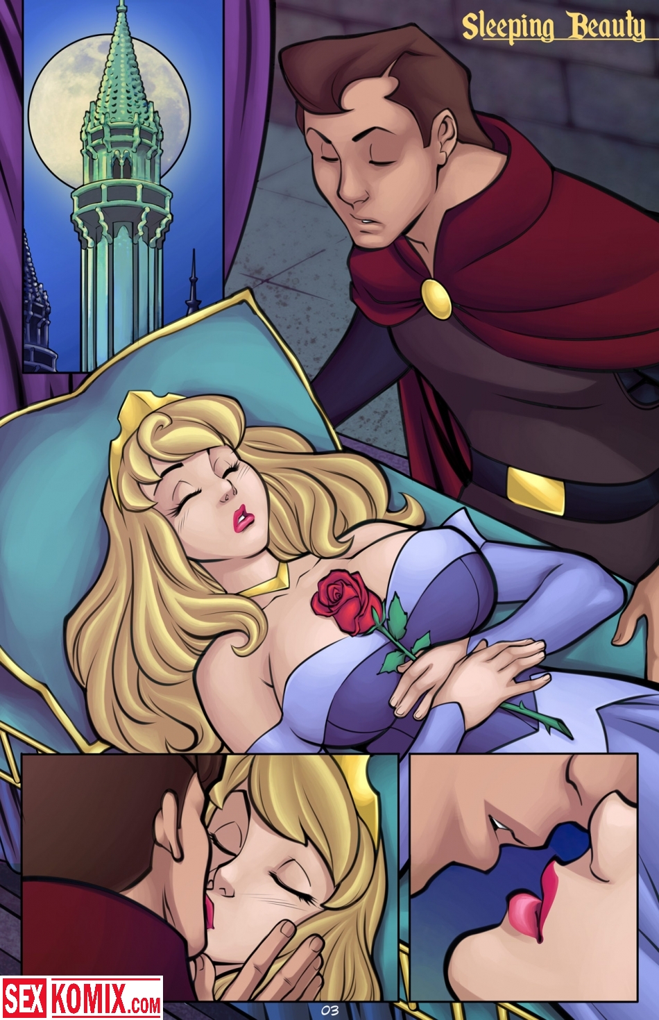 Порно комикс «Спящая красавица». Молодой принц побеждает злого монстра и поднимается в самую высокую башню. Там расположена темница в которой стоит хрустальный гроб, а в нем лежит спящая красавица. Это заколдованная принцесса, и пробудить её может только поцелуй настоящего принца. Молодой человек подошёл к девушке и поцеловал её, но она не проснулась. Он понял, что рассказ этот не обычный, а порнографический, и это заклятье можно снять только хорошим сексом! Он стащил с красотки трусики, оголил ей сиськи и вдул свой член с сочную киску.