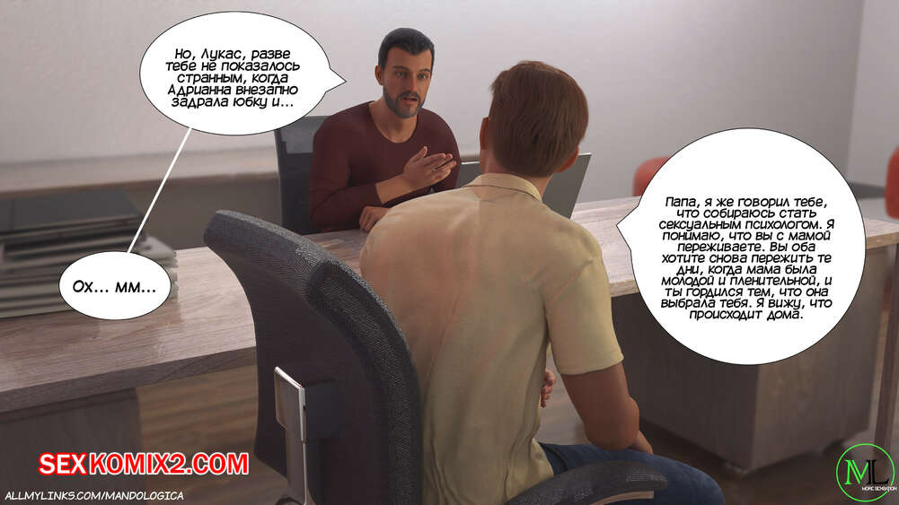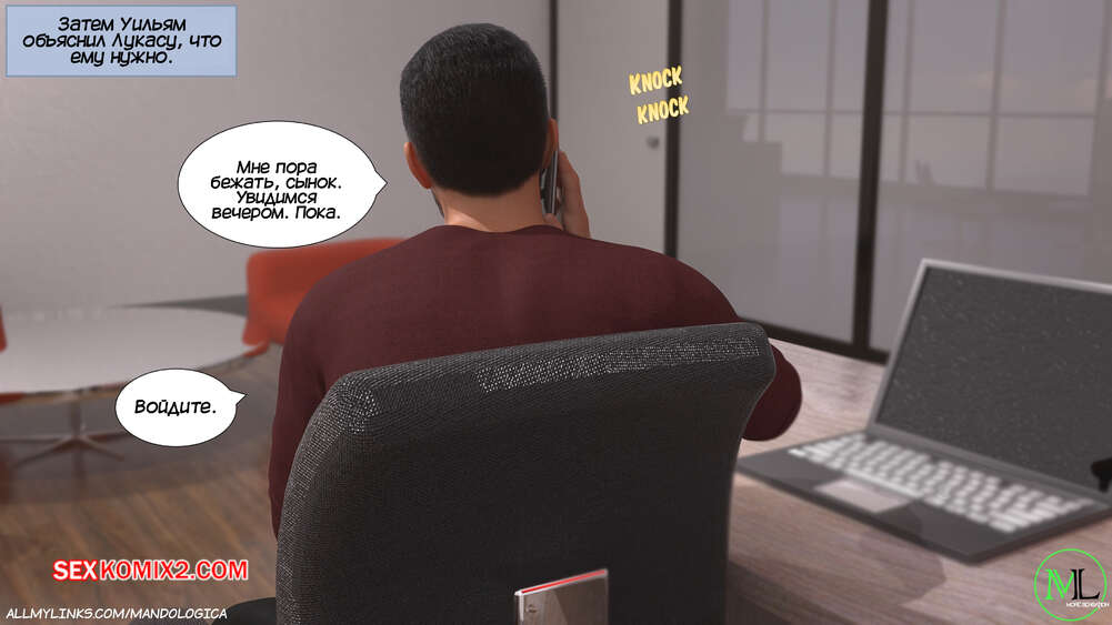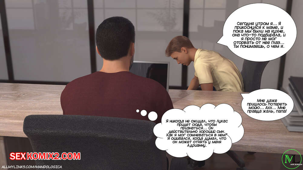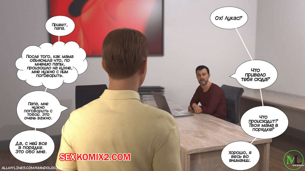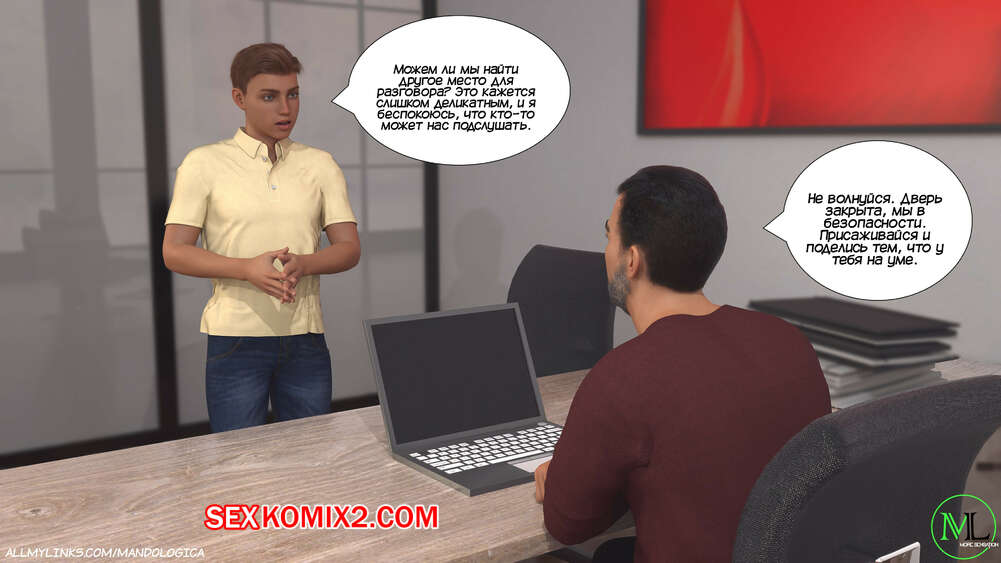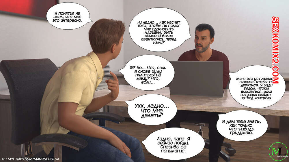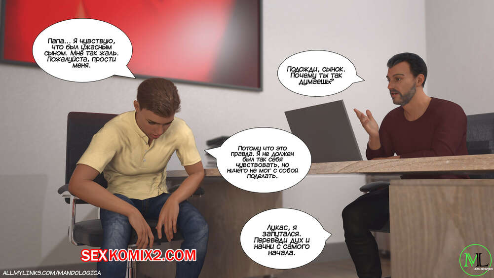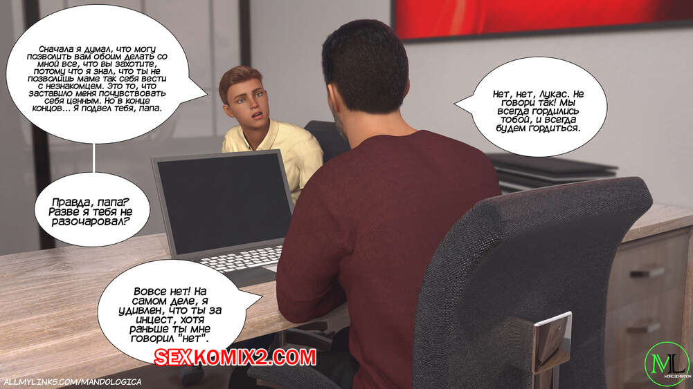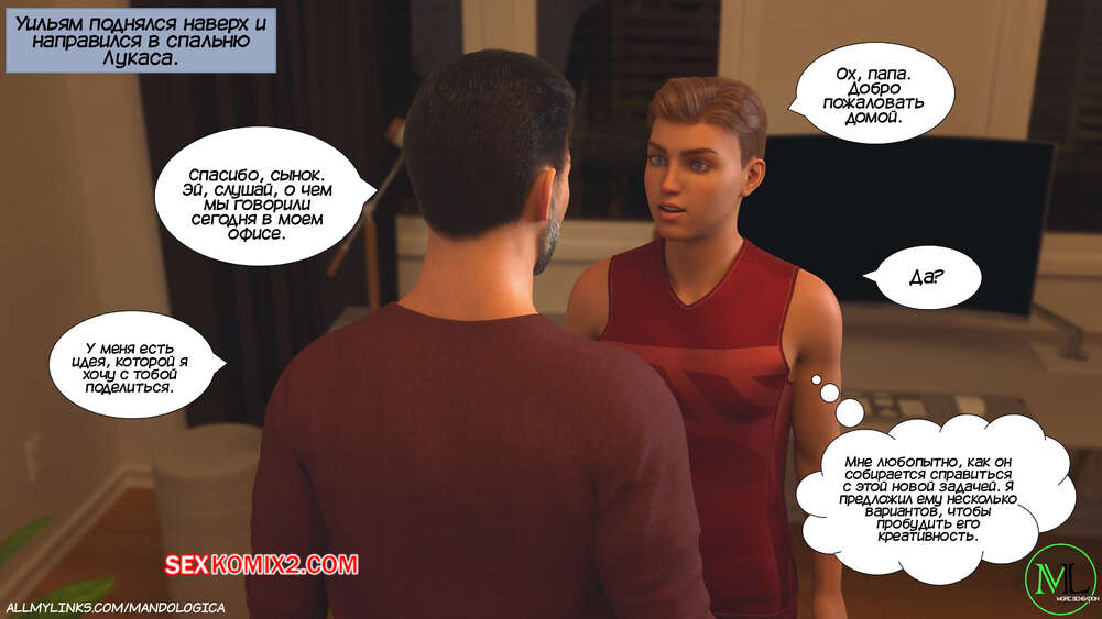 Порно комикс Разрушение границ. Часть 10. Breaking Boundaries. MandoLogica Уильям размышлял на работе о произошедшем утром. Его не устраивает его положение в процессе заданий от организации. Лукас понимает это, поэтому отправился в офис к отцу, чтобы успокоить его.