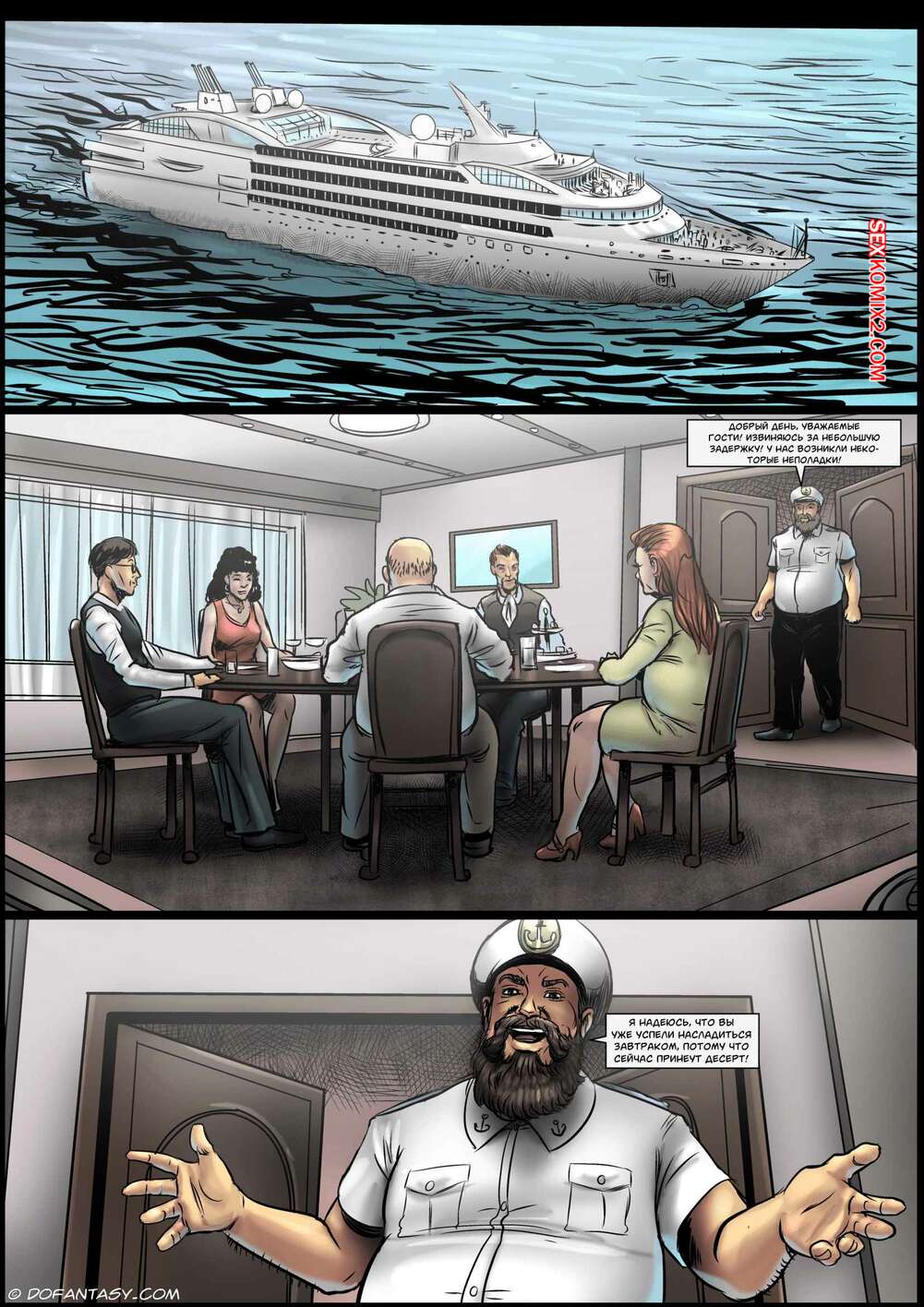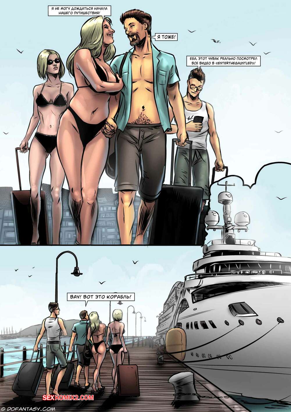 Порно комикс Путешествие удовольствия. Celestin Два друга с женами отправились в путешествие на корабле. Там красотки привлекли внимание богатых мужиков, которые схватили девушек для своих сексуальных игр.