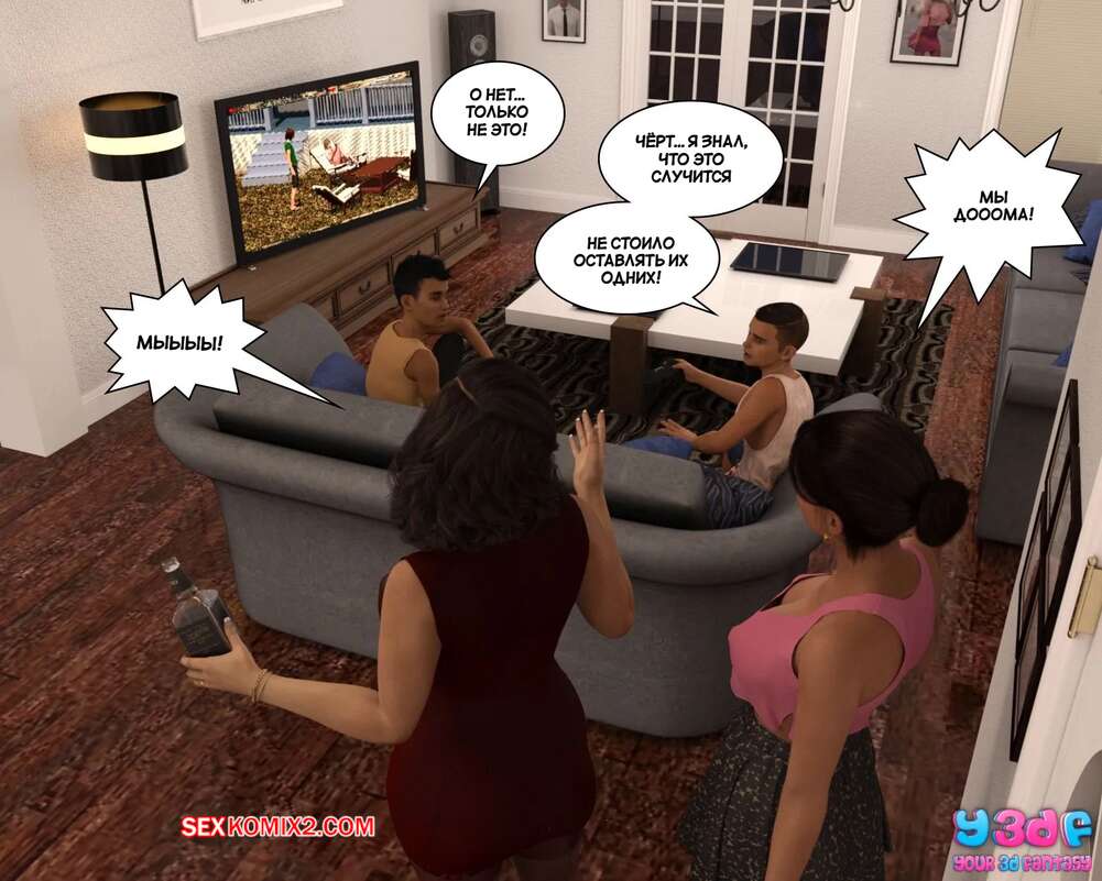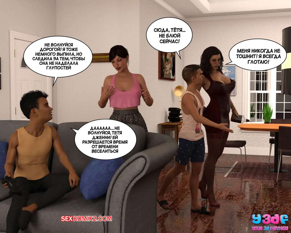 Порно комикс Загар. Часть 5. The Tan. Y3DF Горячая милфа вернулась с подругой домой пьяной, после тусовки. Красотка была очень возбуждена, поэтому стала сосать хуй сына и дала ему себя хорошенько выебать, пока подруга спала на кровати рядом.