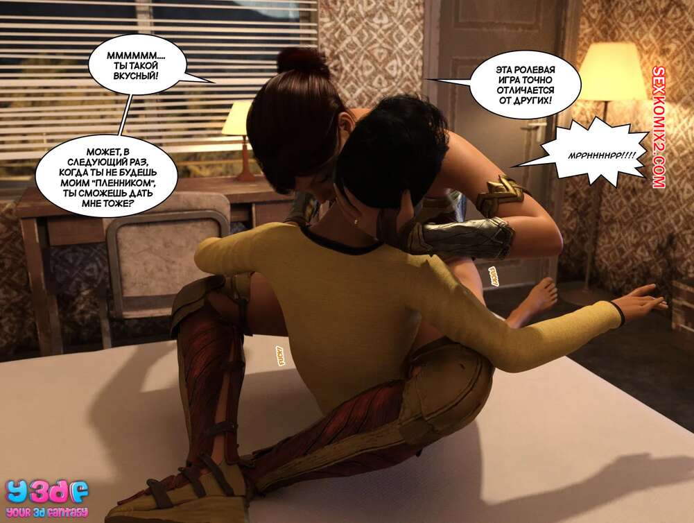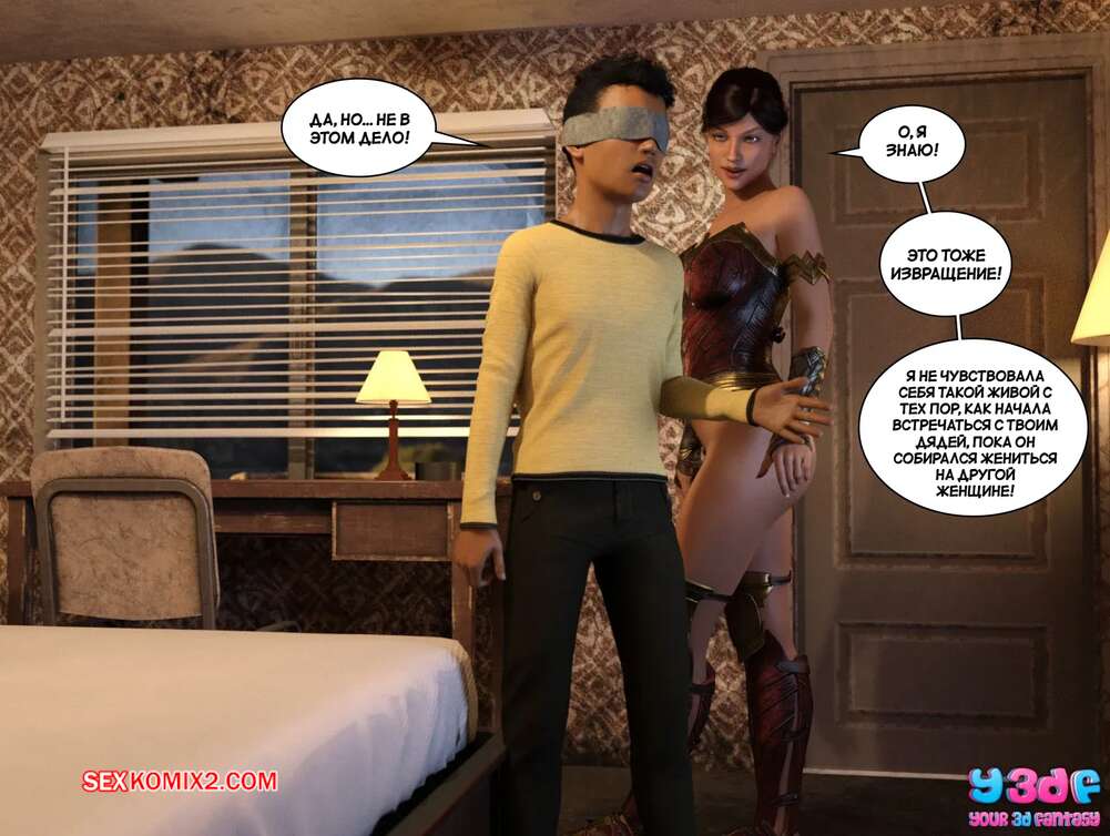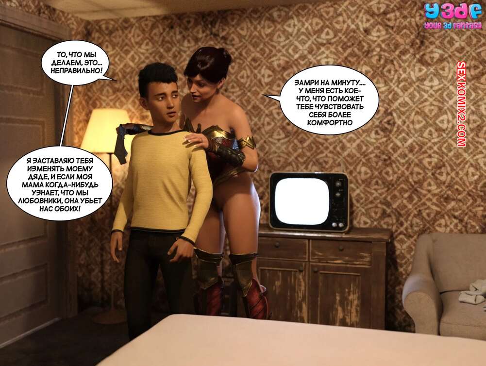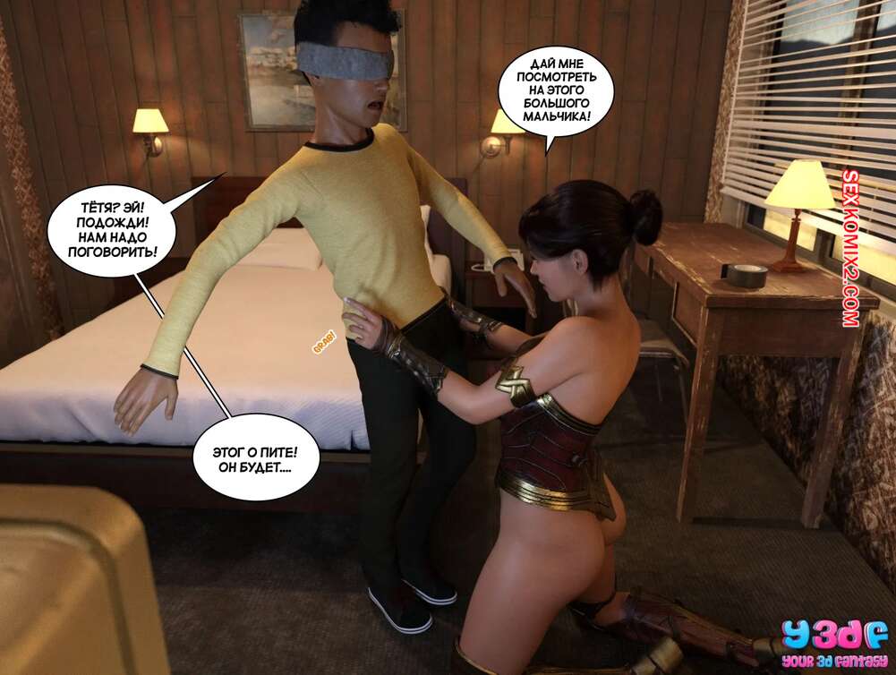 Порно комикс Плохой загар. Часть 3. The Bad Tan. Y3DF Горячая милфа привезла своего сына в мотель, желая устроить ему сюрприз. Красотка надела секси костюм Чудо Женщины и возбудила парня, после чего дала ему себя хорошенько выебать.