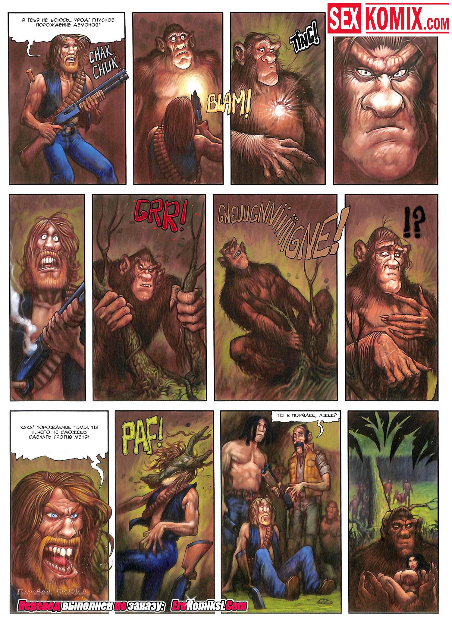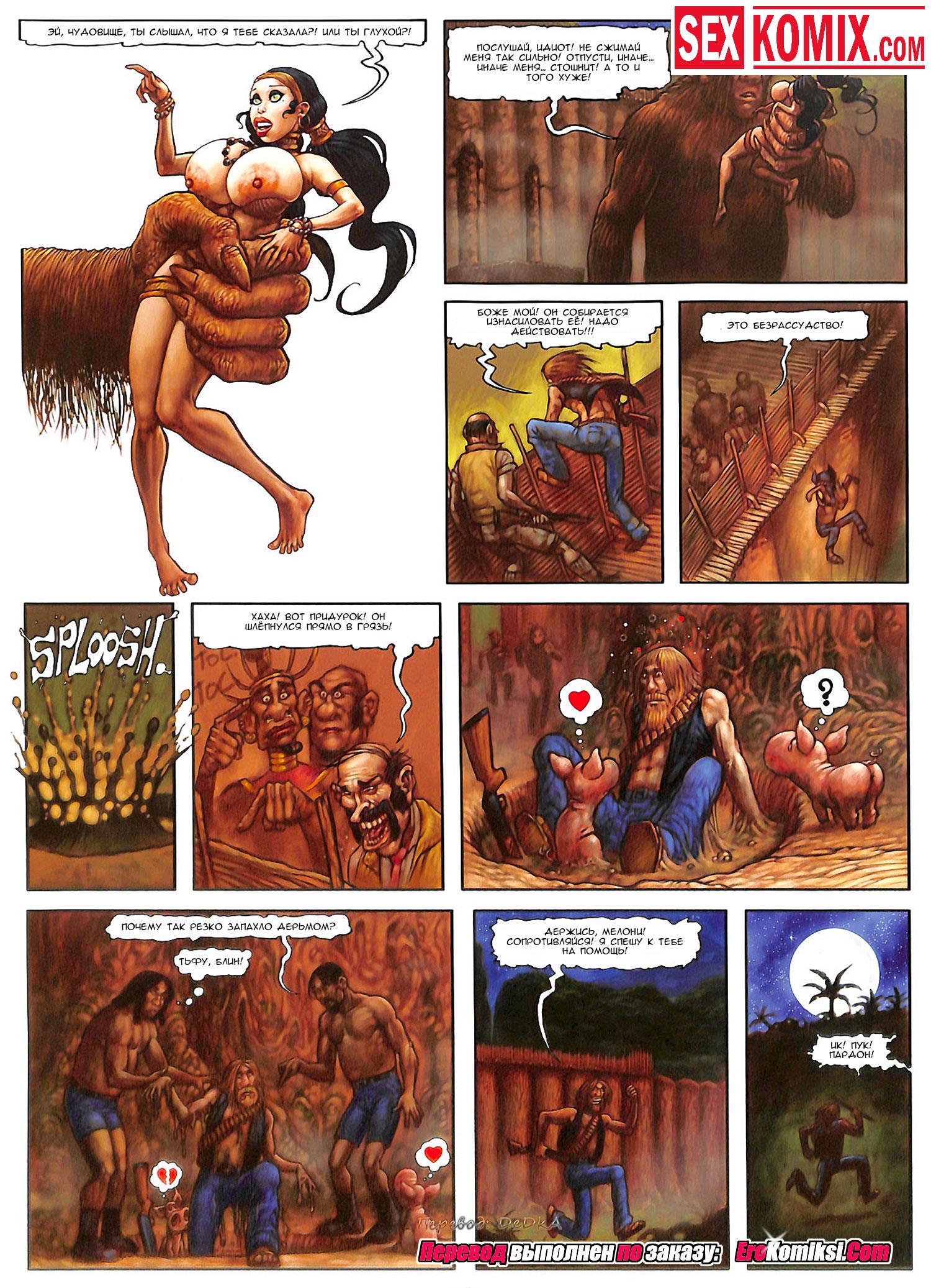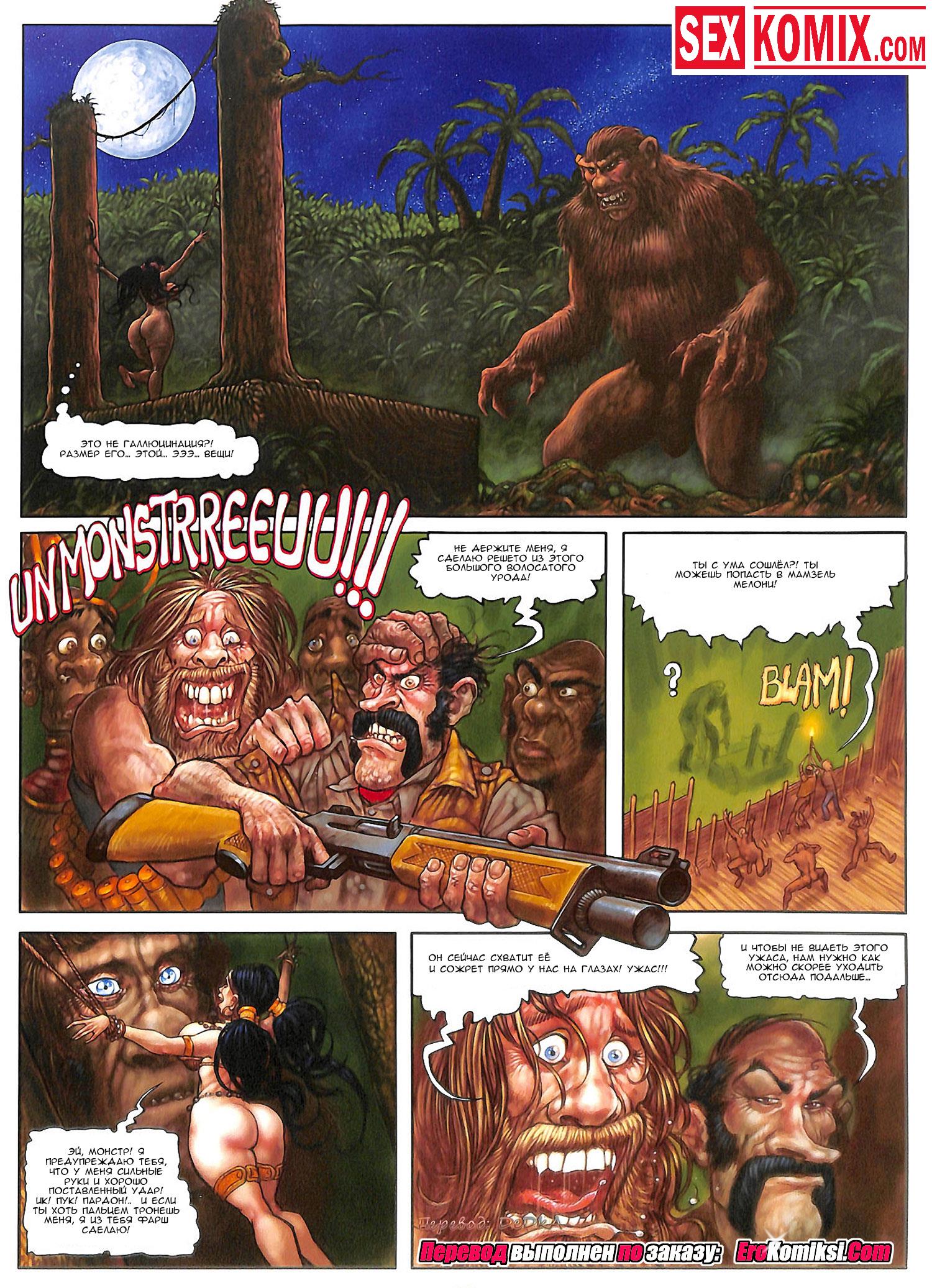 Порно комикс «Мелони Свит. Таинственный остров. Часть 3. Встреча с монстром». В этом комиксе для взрослых вы увидите продолжение приключения фантастической брюнетки по имени Мелони. Аборигены которых она встретила на острове, привязали её к столбу для жертва приношения гигантскому монстру, великан пришёл за своей добычей и очень был рад такому подарку. Он унес девушку в свой лес и Мелони узнала, что этот монстр очень добрый и все молодые девушки которых ему приносили в жертву, спокойно живут вместе с ним. Он их взял для сексуальных утех, но чернокожие его перестали возбуждать. А когда он увидел нашу красотку, у великана сал его гигантский член. Но во беда, член на столько огромный, что бедняжку бы порвало, поэтому он трахнул сочные дырочки своей пленницы с помощью пальцев.