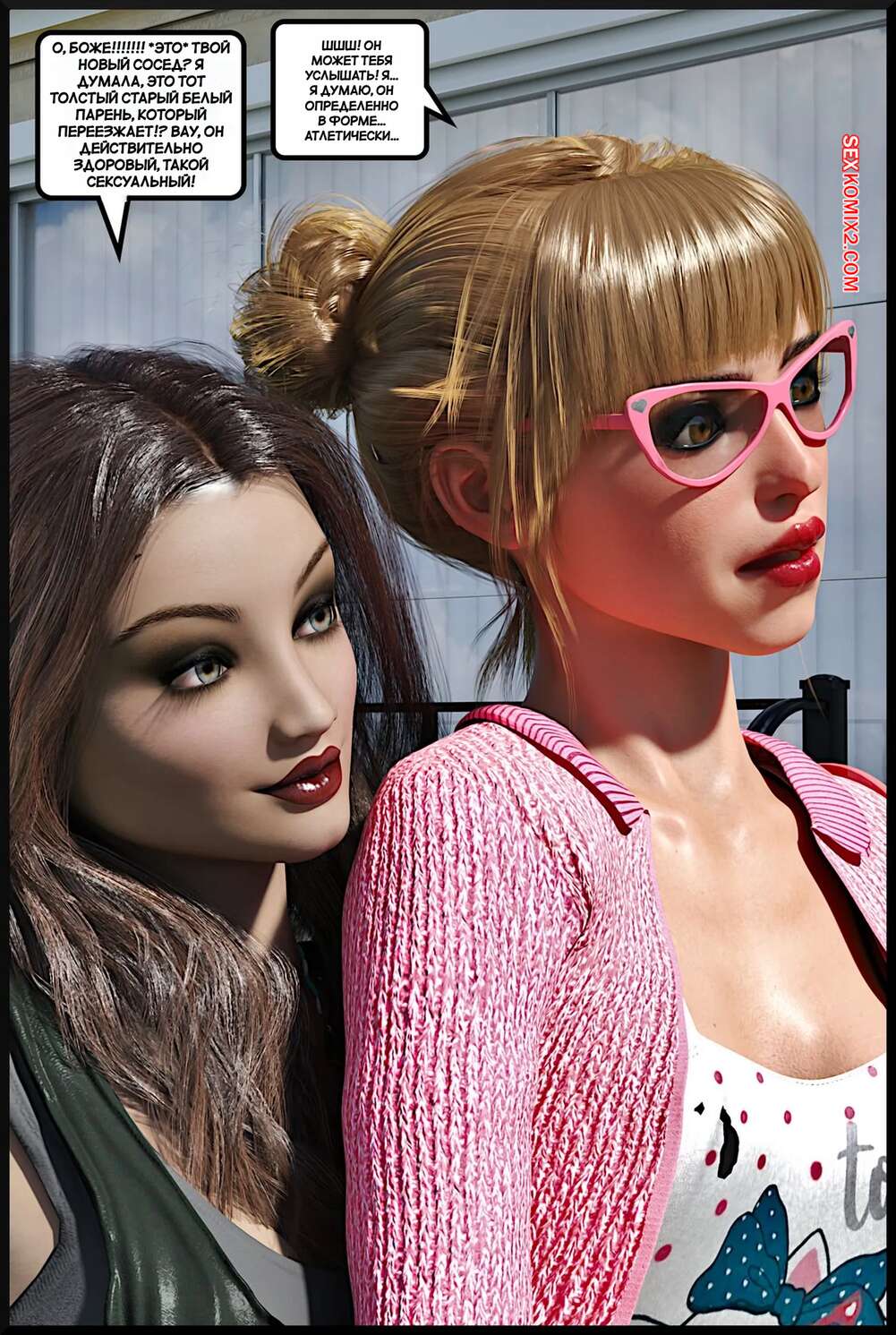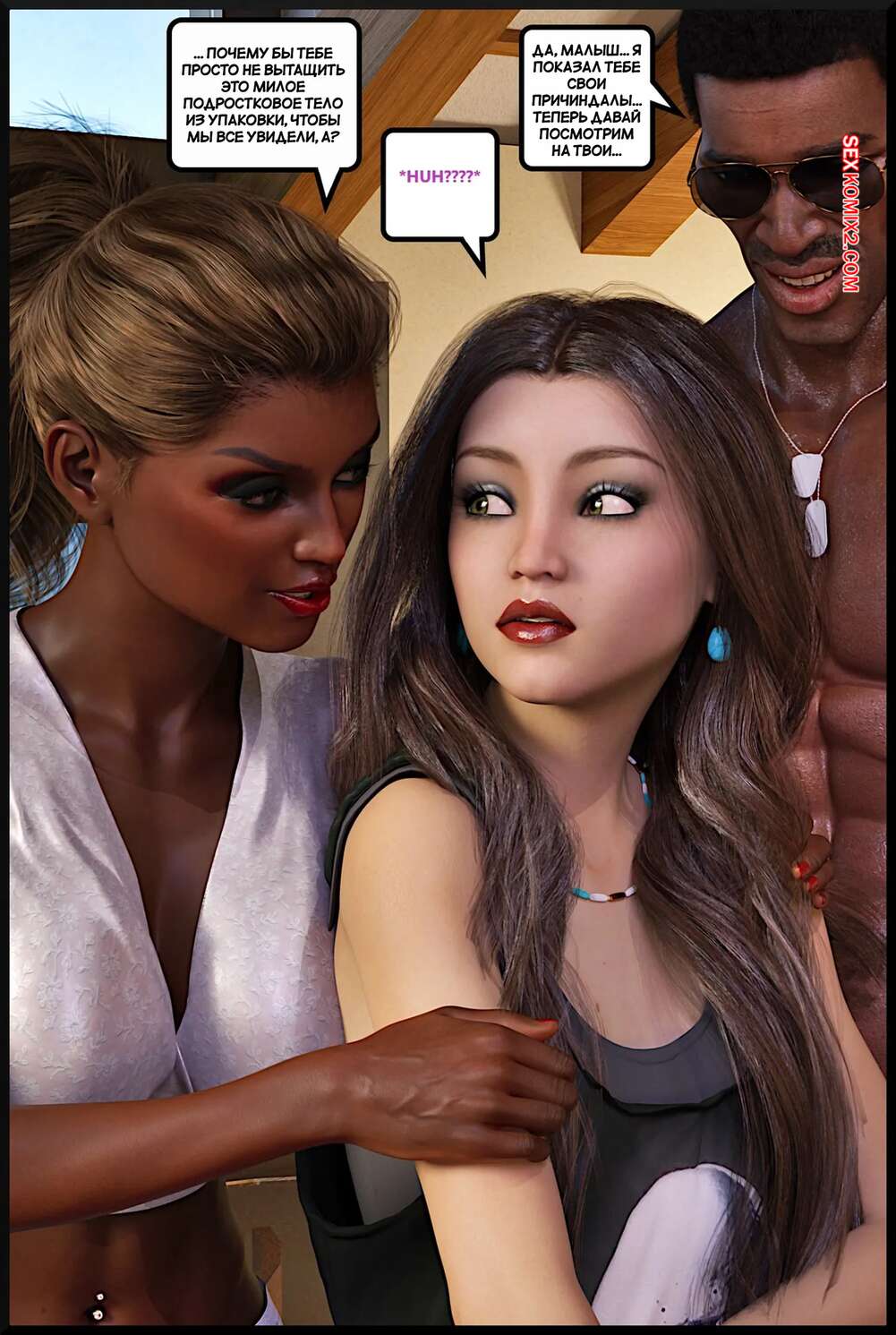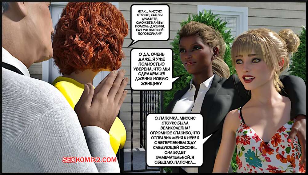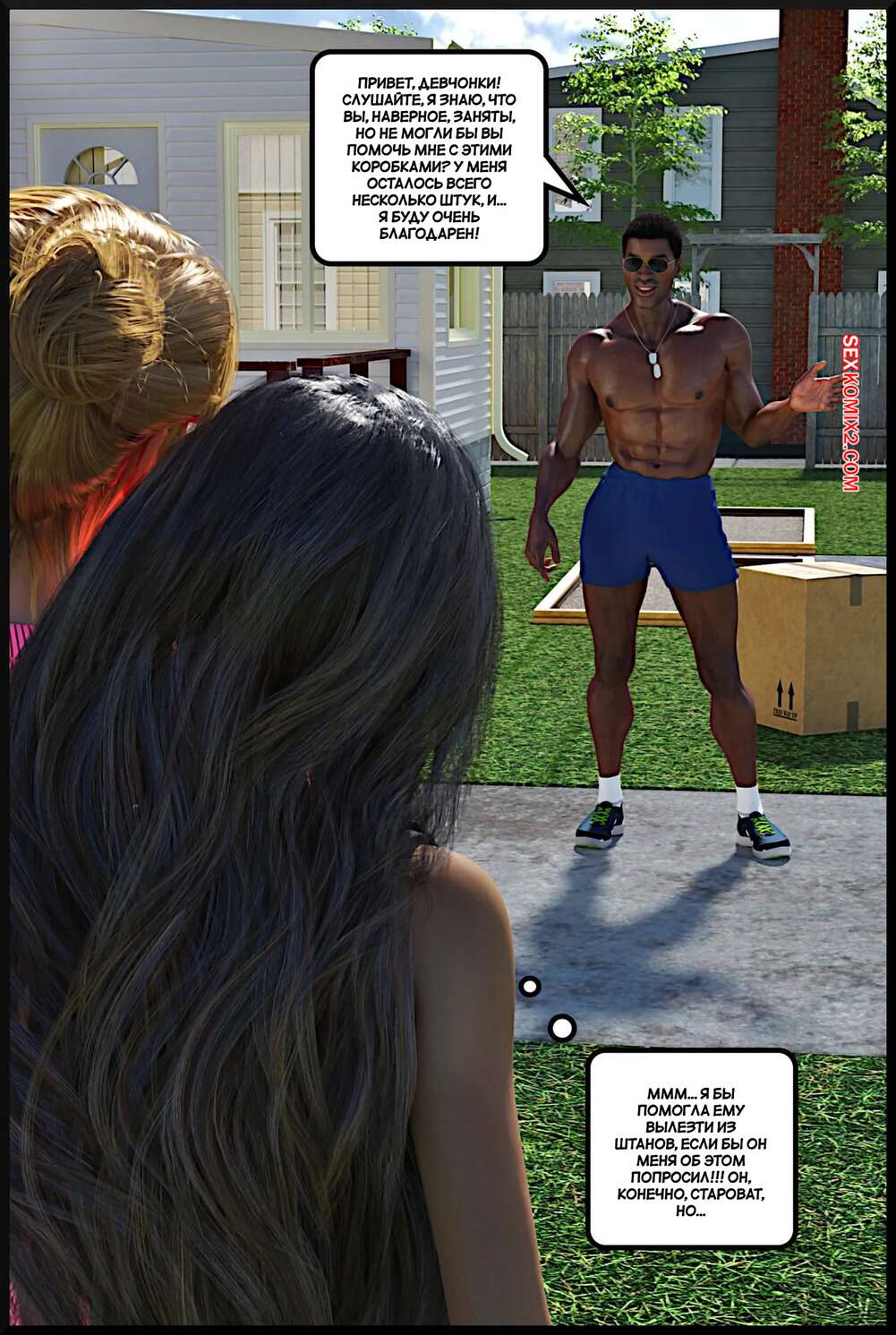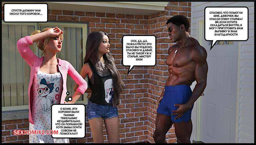 Порно комикс Современная семья. Modern Family. Alison Hale Горячие красотки знакомятся со своим темнокожим соседом. Он соблазняет их большим членом, поэтому девушки с удовольствием сосут хуй парня и дают ему себя выебать.