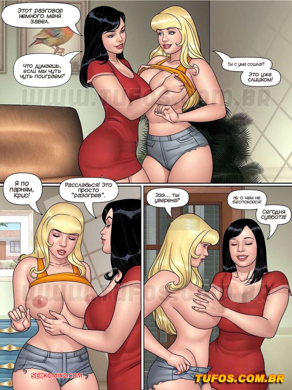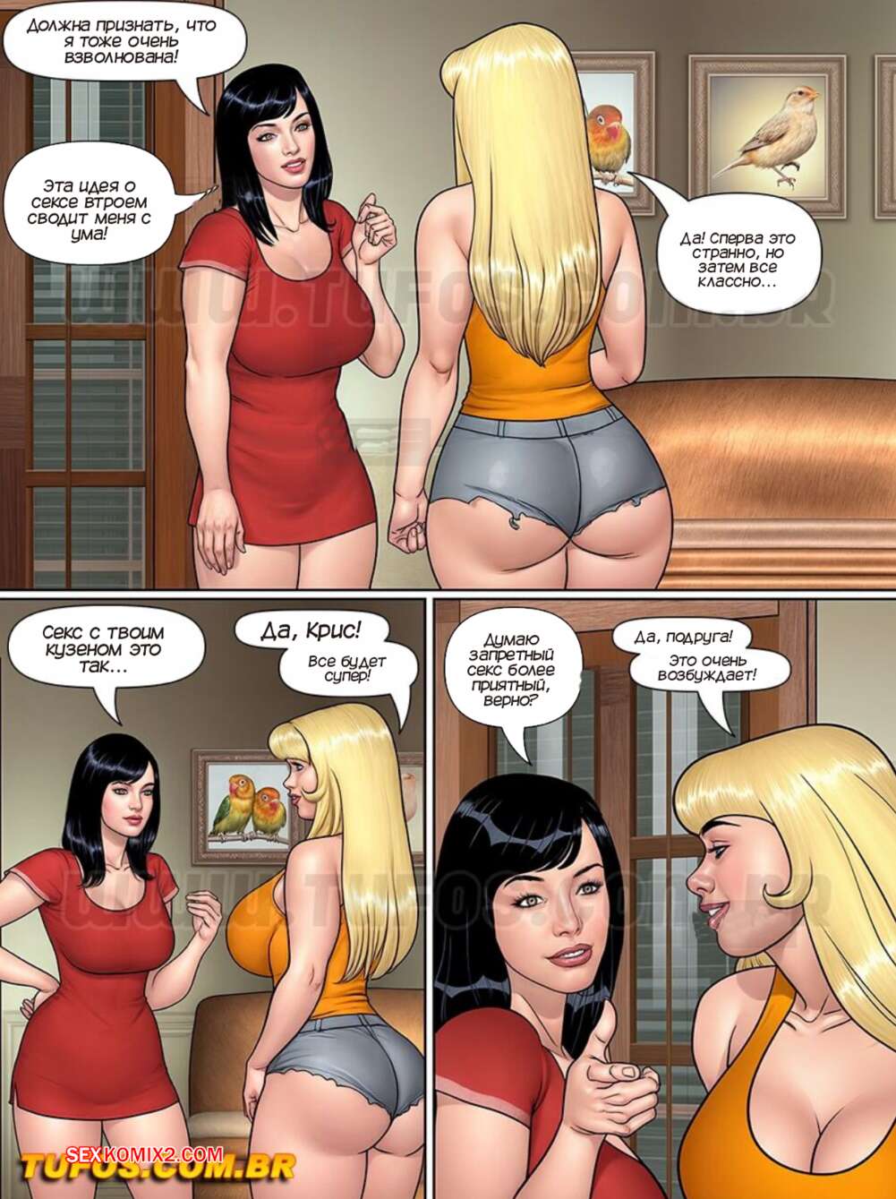 Порно комикс Возбужденная кузина. Часть 7. Um tesao de priminha. Tufos Две горячие красотки пригласила парня к себе и встретили его голыми. Девушки встали на колени и отсосали большой хуй парня, после чего он сперва выебал Присциллу, а затем и занялся пизденкой Крис.