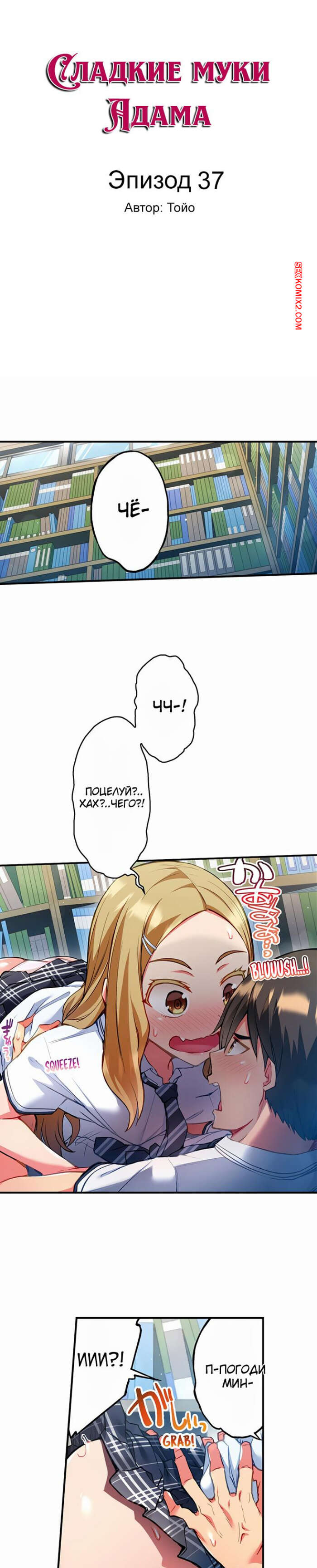 Порно комикс Сладкие муки Адама. Часть 37. Modaete yo, Adam kun. Toyo Парень с девушкой трахались в библиотеке, но красотке не понравились комментарии паренька о том, что она плохо целуется. Девушка уложила парня на пол и решила ему доказать, что она классно целуется.