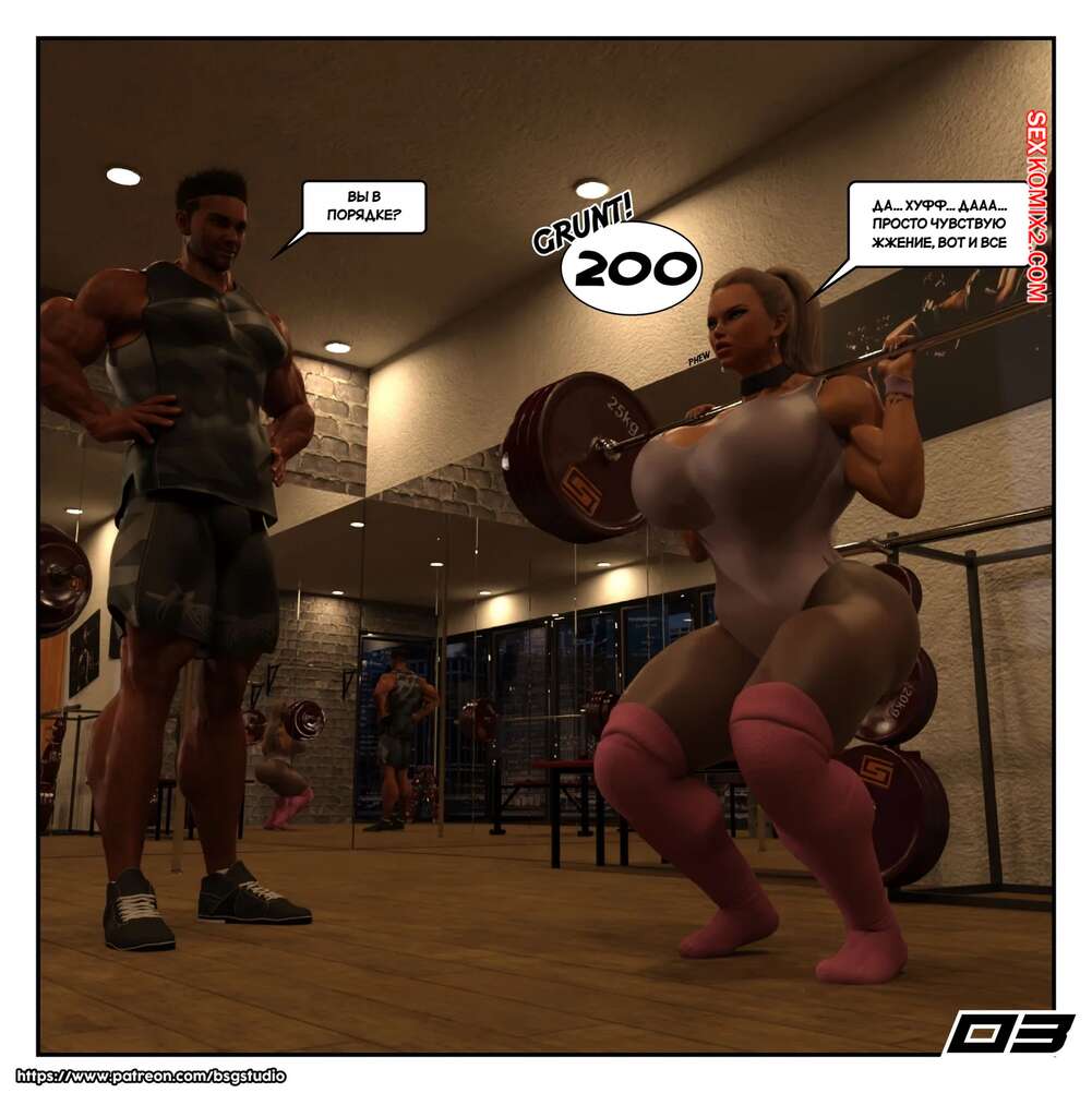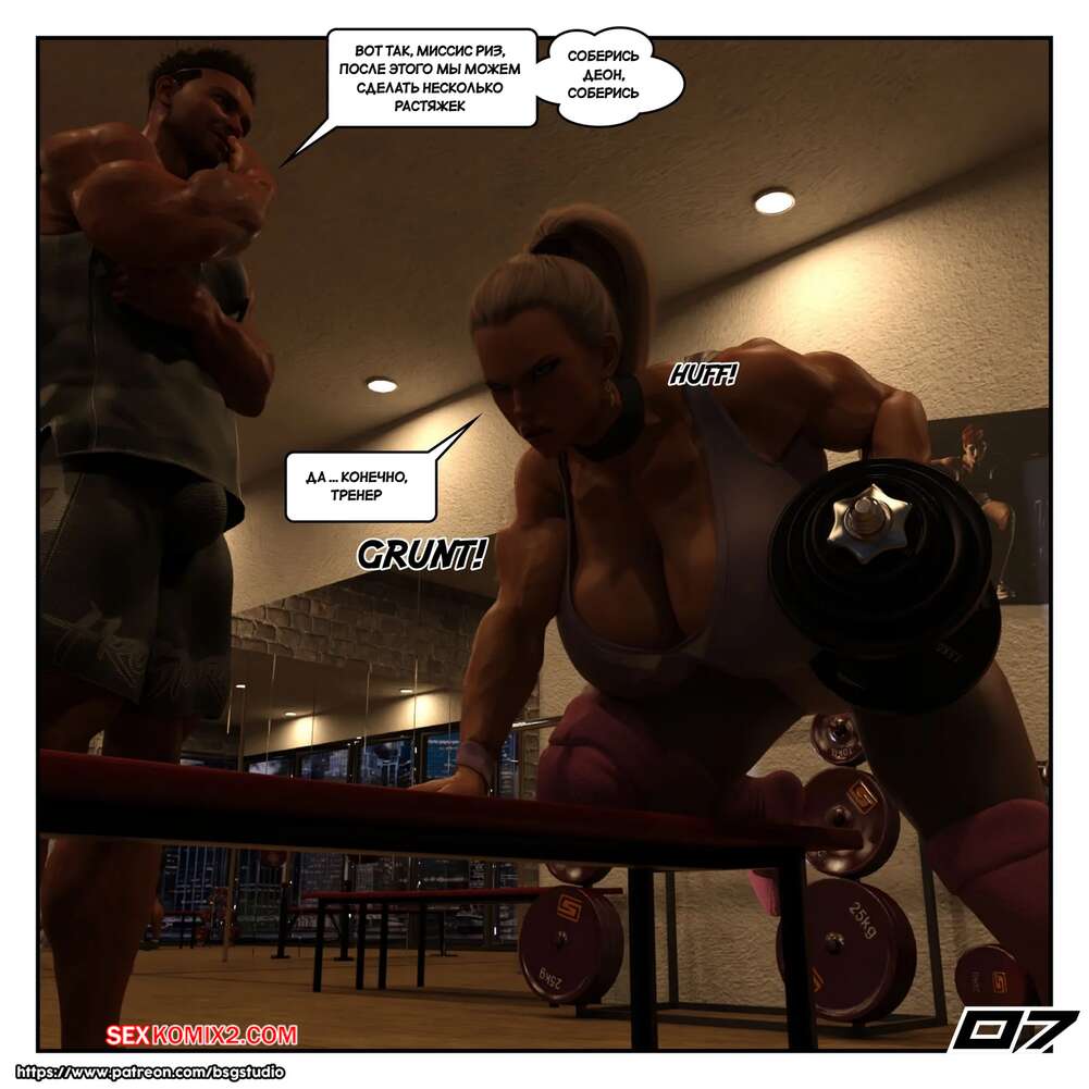 Порно комикс Похоть в спортзале. Gym Lust. Bsgstudio. Горячая милфа занимается в спортзале с персональным тренером и заметила на себе его похотливые взгляды. Красотка стала соблазнять парня и отсосала его член, после чего дала себя выебать.