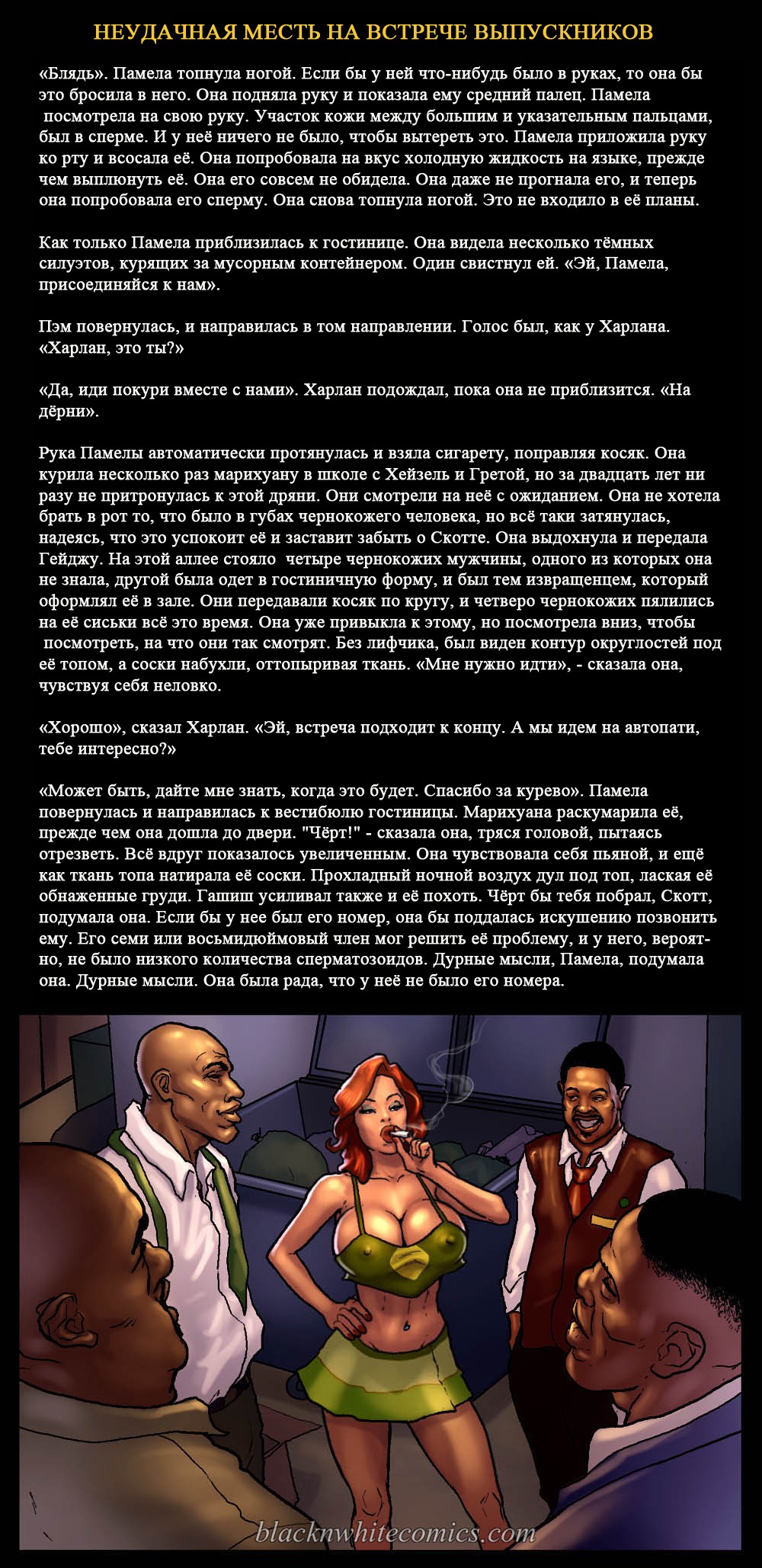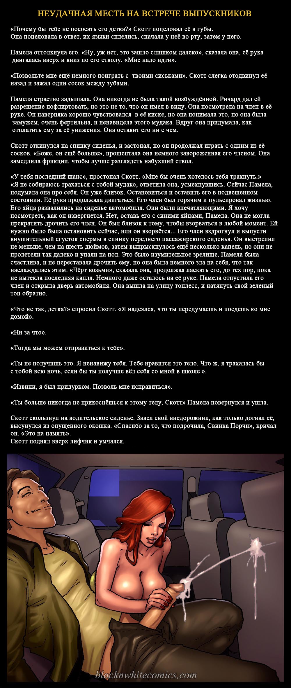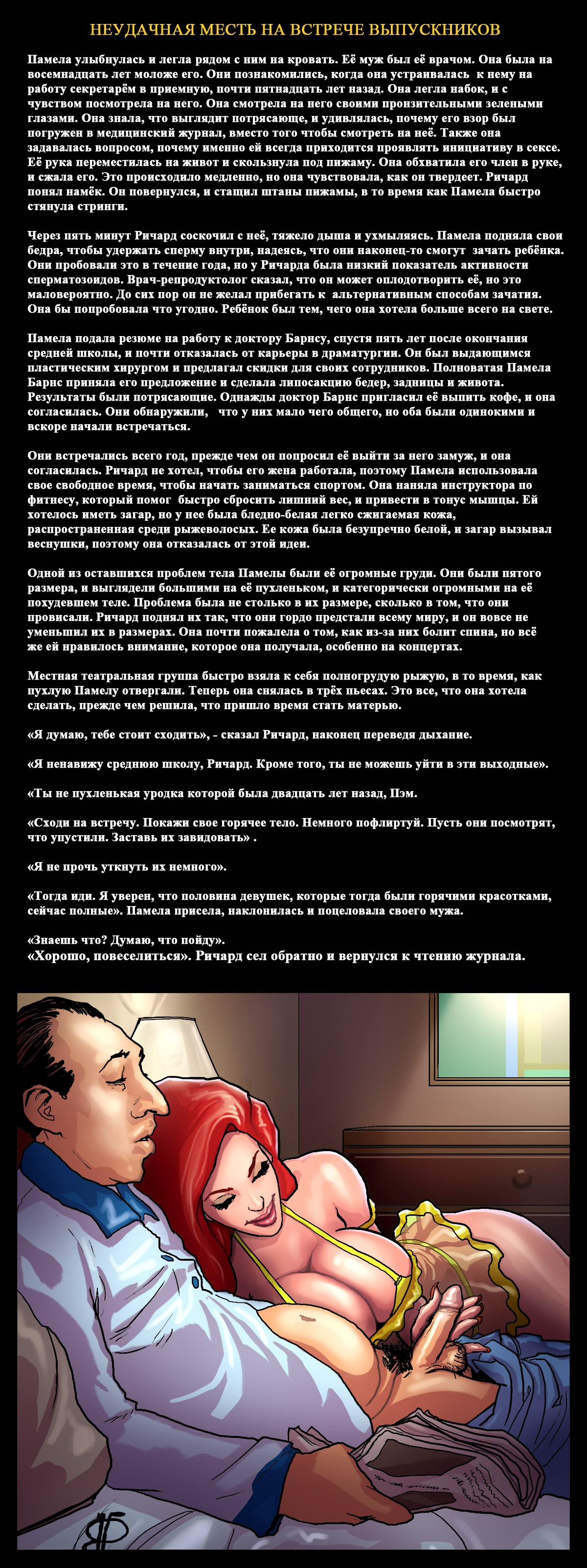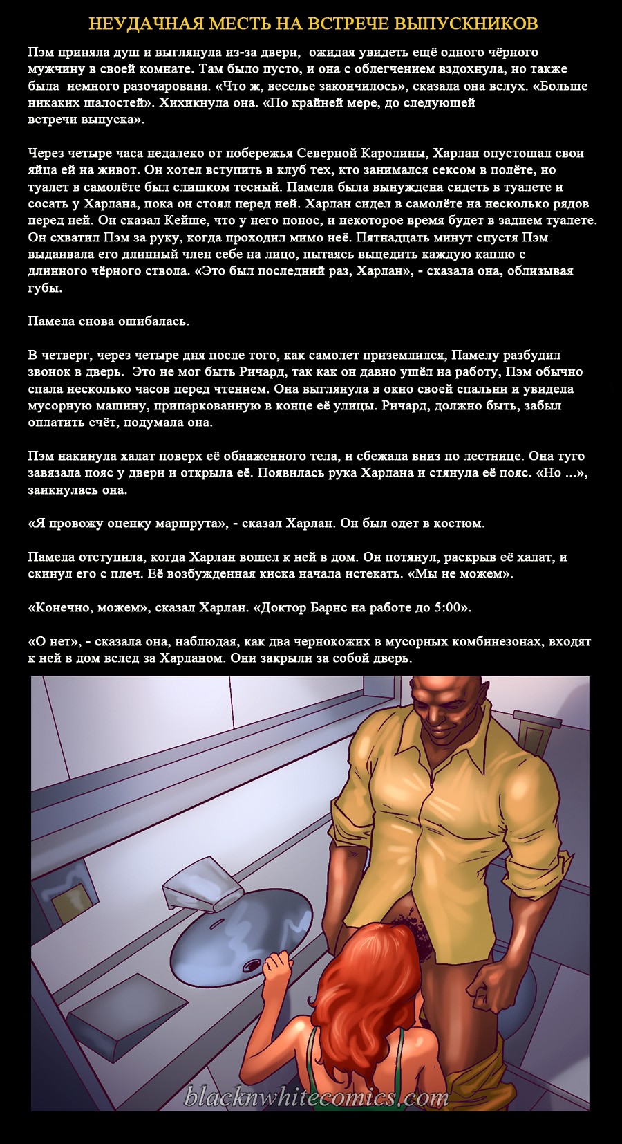 Порно комикс «Неудачная месть на встрече выпускников». Этот комикс для любителей подробностей истории, очень подробно описываются сцены. Очень сексапильная девушка с большими сиськами, случайно встречает своего знакомого в самолете. У неё на это парня старая обида за то, что он издевался над ней. Девушка уже давно хотела отомстить этому чернокожему негодяю, и теперь выдался такой шанс. Она решила разлучать его с женой и начала соблазнять парня своим шикарным телом. И всё у неё получилось, они занимались сексом и их застукала жена.