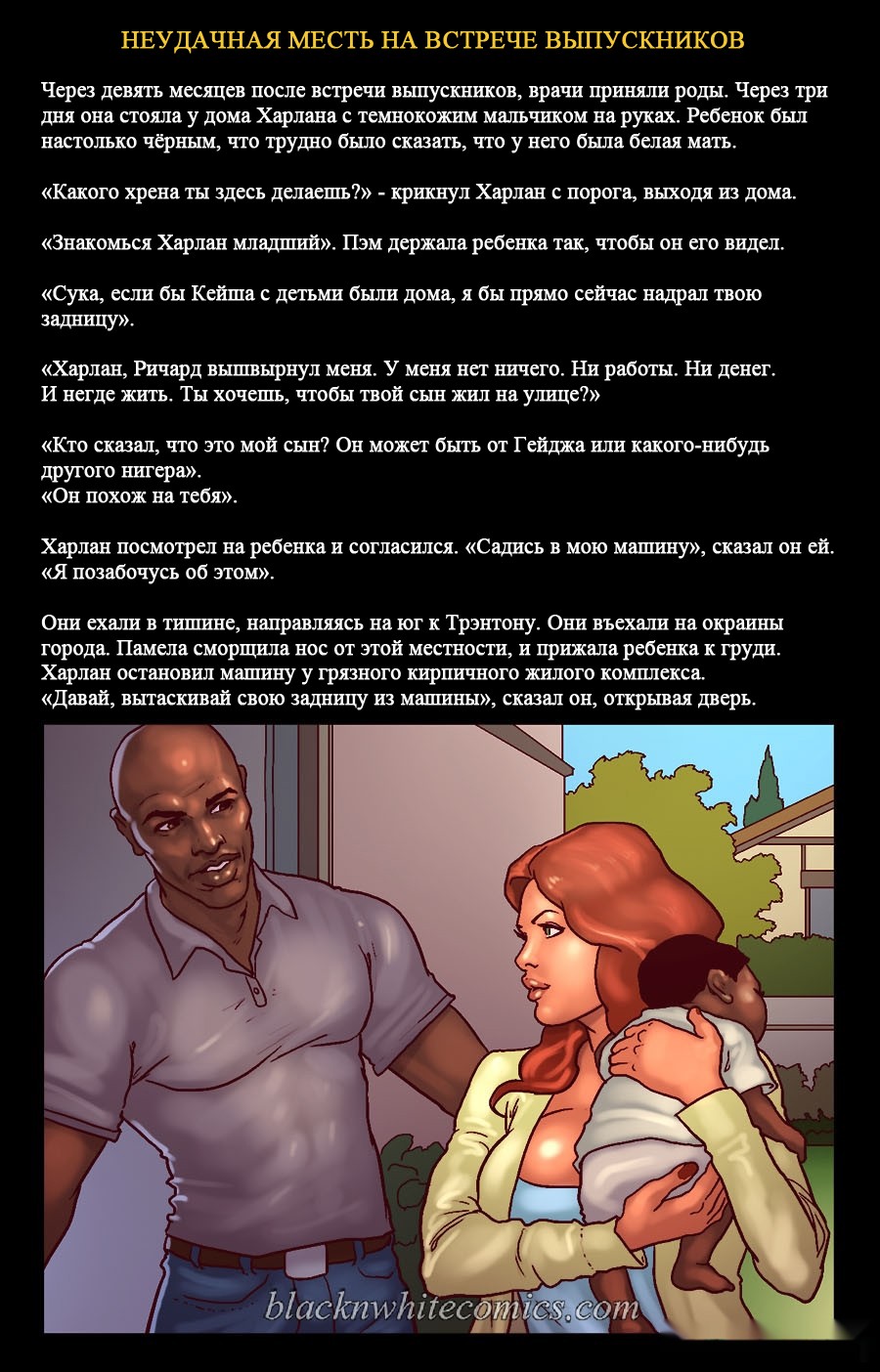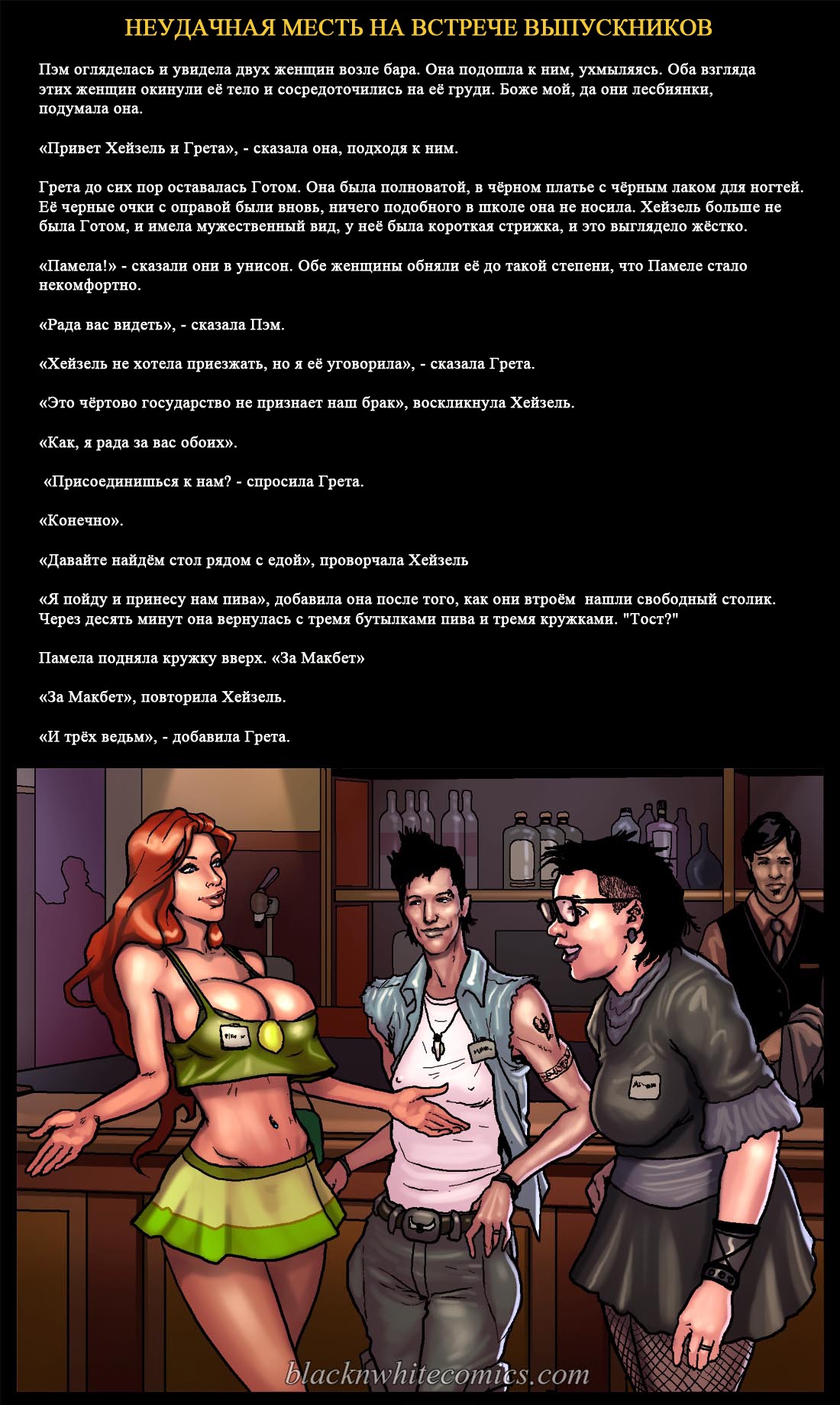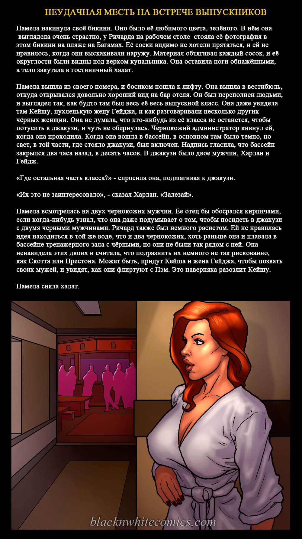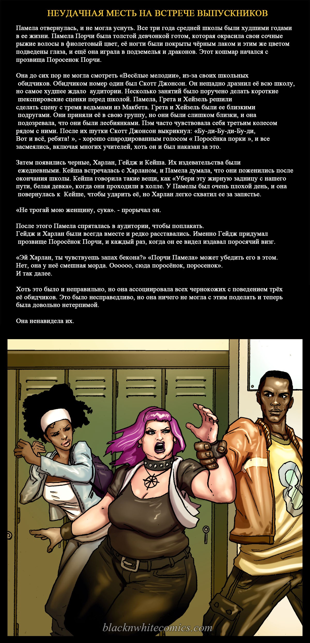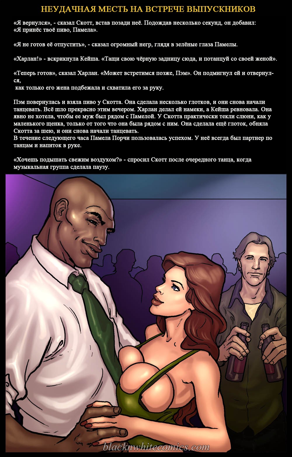 Порно комикс «Неудачная месть на встрече выпускников». Этот комикс для любителей подробностей истории, очень подробно описываются сцены. Очень сексапильная девушка с большими сиськами, случайно встречает своего знакомого в самолете. У неё на это парня старая обида за то, что он издевался над ней. Девушка уже давно хотела отомстить этому чернокожему негодяю, и теперь выдался такой шанс. Она решила разлучать его с женой и начала соблазнять парня своим шикарным телом. И всё у неё получилось, они занимались сексом и их застукала жена.