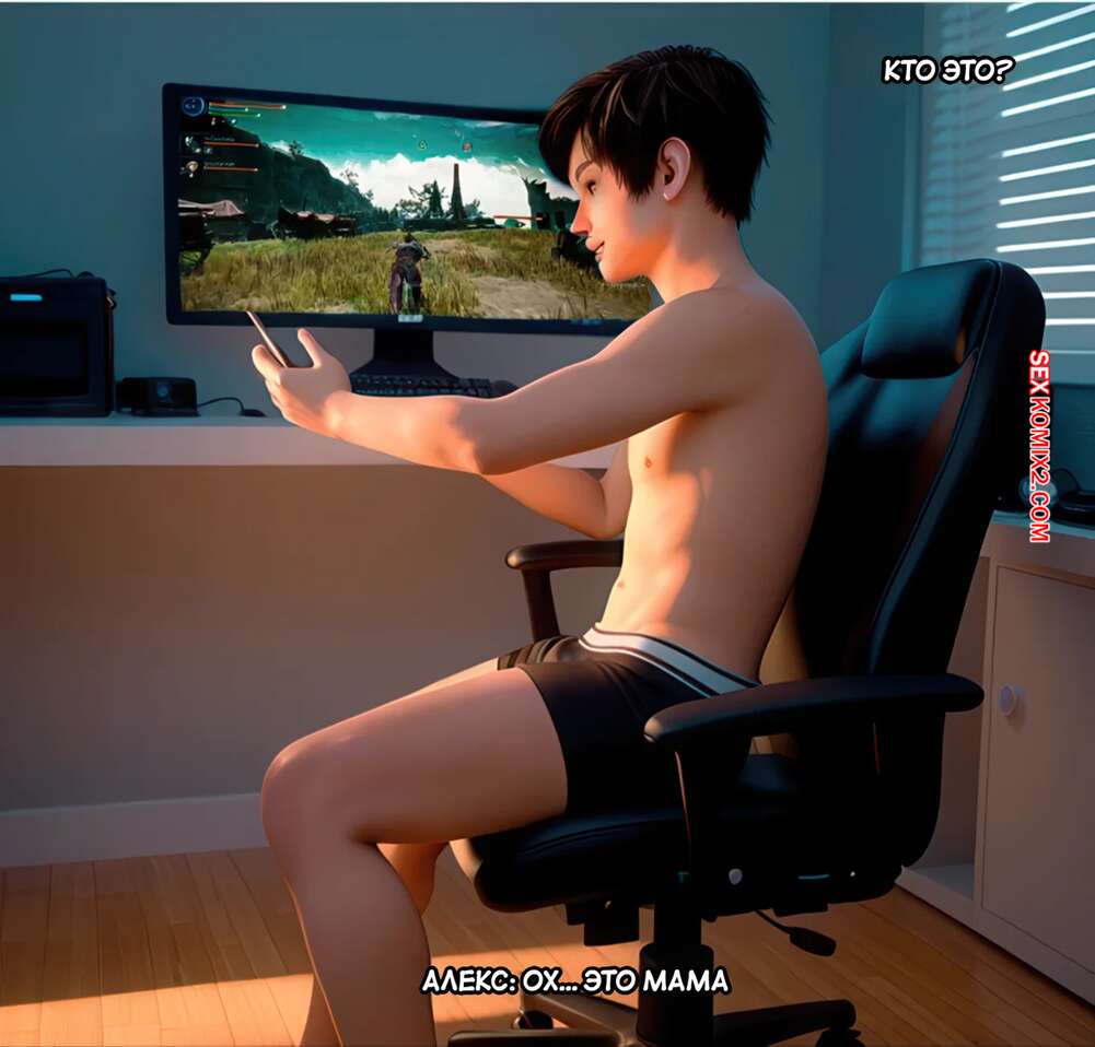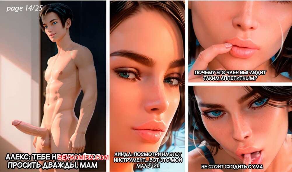 Порно комикс Материнские насмешки. Часть 1. Mothers Tease. Lucozade. Горячая милфа скучала дома и решила немного развлечься. Она позвала сына к себе в комнату и надела для него сексуальное черное белье. Парень быстро возбудился и красотка достала его член, чтобы помочь ему кончить.