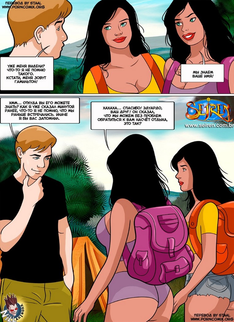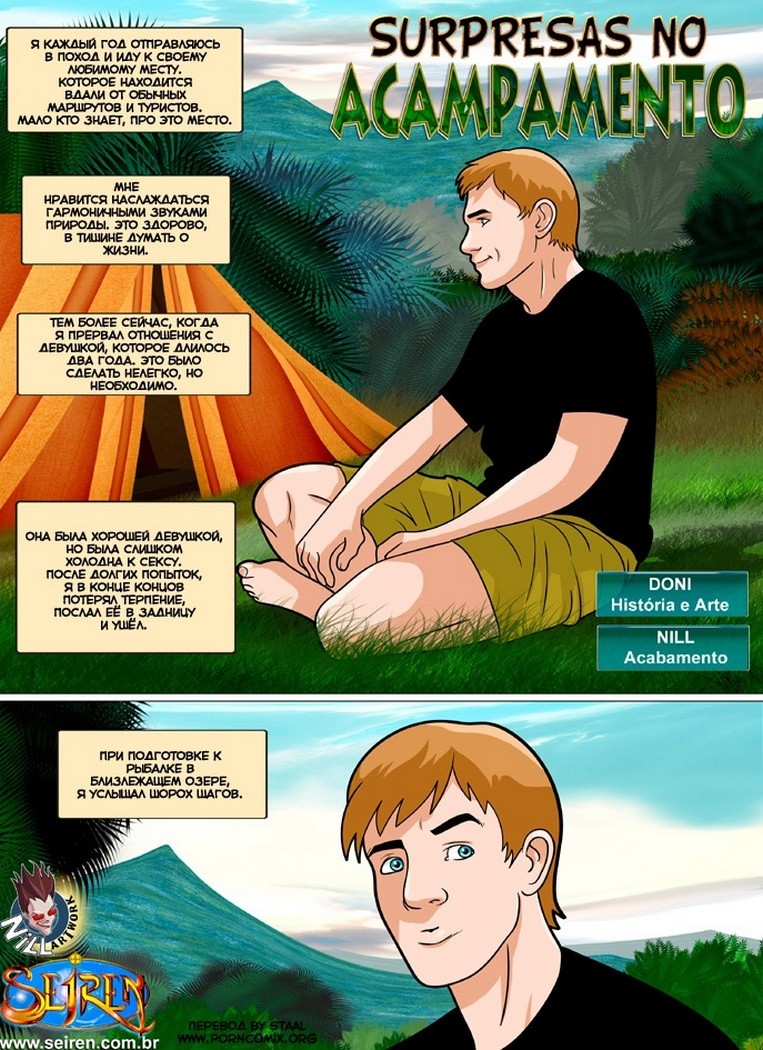 Порно комикс «Сюрприз на кемпинге». Молодой паренёк приехал на озеро. Что бы порыбачить в тишине, разложил палатку на своём любимом месте и уже готовился к ловле рыбы. Но к нему обратились две молодые и очень горячие девушки, они давно за ним наблюдали и хотели искупаться рядом, так как на улице было очень жарко. Он немного растерялся, возможно они ему помешают ловить рыбу, но когда увидел, что девушки пошли купаться абсолютно голыми, парень возбудился. Ему захотелось присоединиться к двум красоткам, да и они были не против.