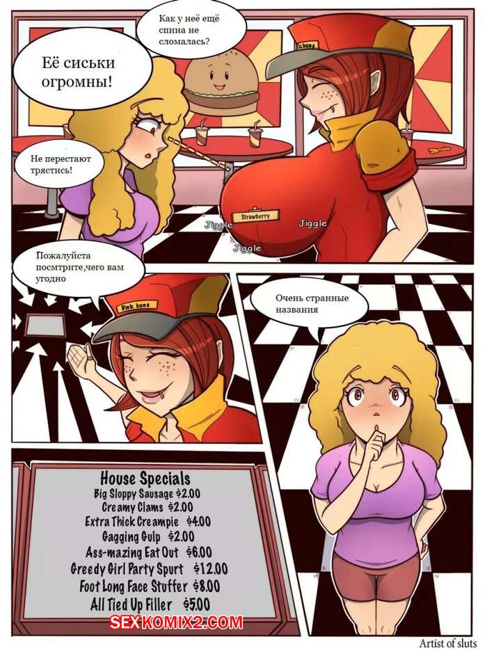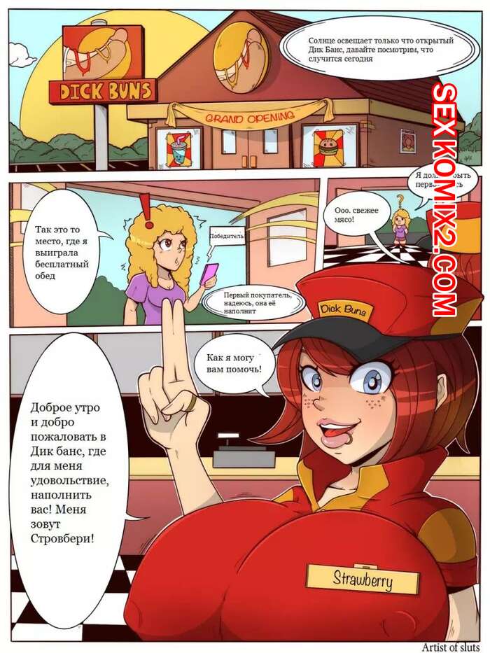 Порно комикс Трансы. Закусочная Булочки с членом Девушка блондинка выиграла в конкурсе и пришла в закусочную за обедом, но там ее ждала только сисястая девушка с огромным членом. Она поставила блондинку на колени и стала ебать ее рот своим большим хуем, а затем наполнила ее желудок кучей своей спермы.