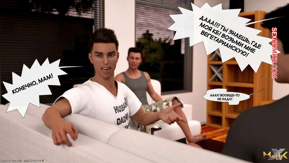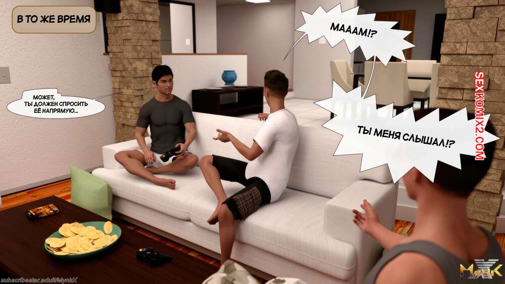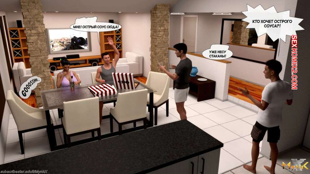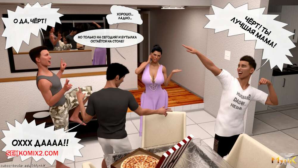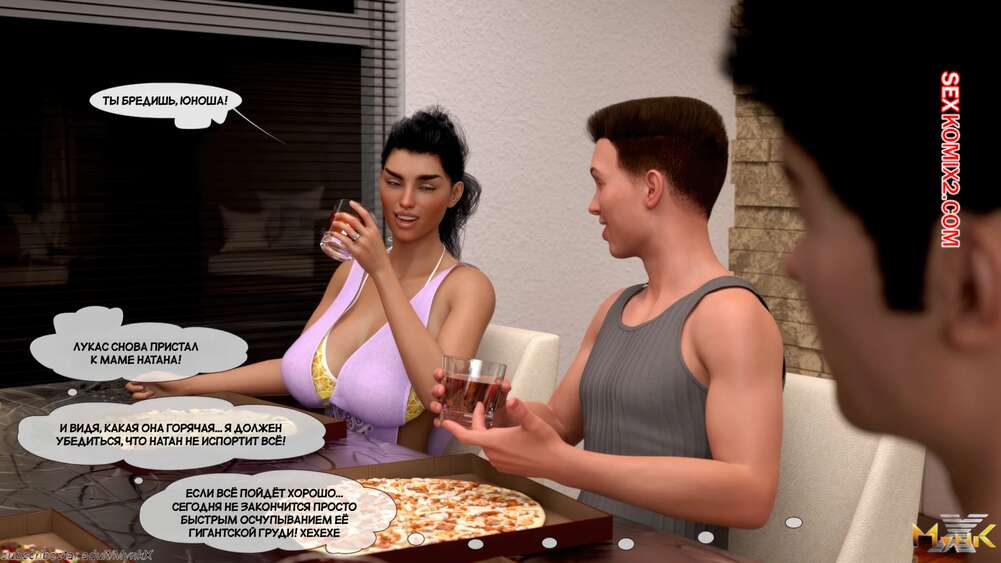 Порно комикс Кафе Фоли. Часть 2. Cafe Folies. Mynkx Молодые парни решили соблазнить горячую милфу и позвали ее посмотреть с ними фильм. Один из парней расположился с красоткой на диване и стал ласкать ее большие сиськи, возбуждая девушку.