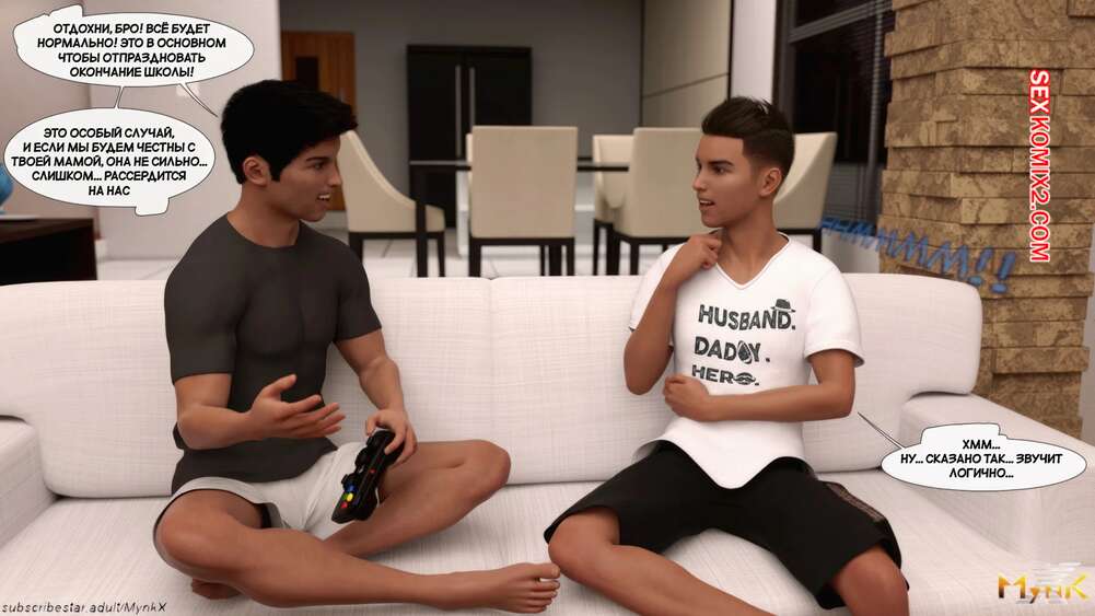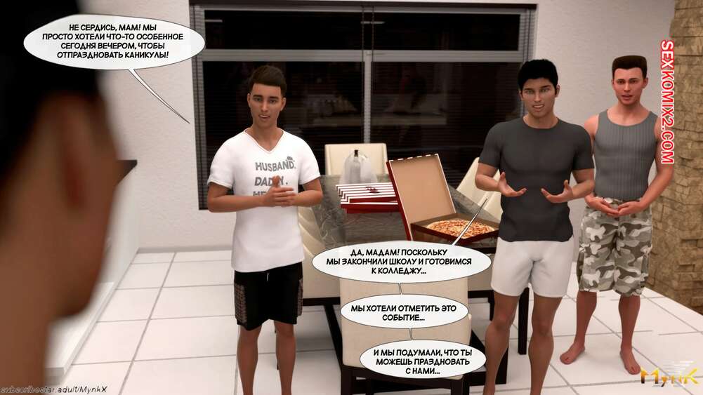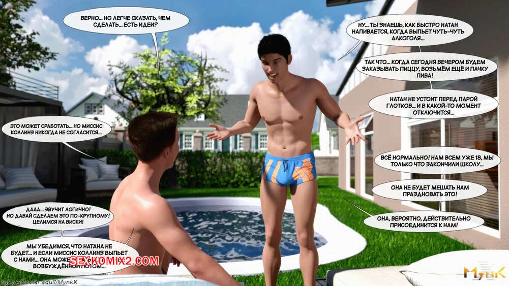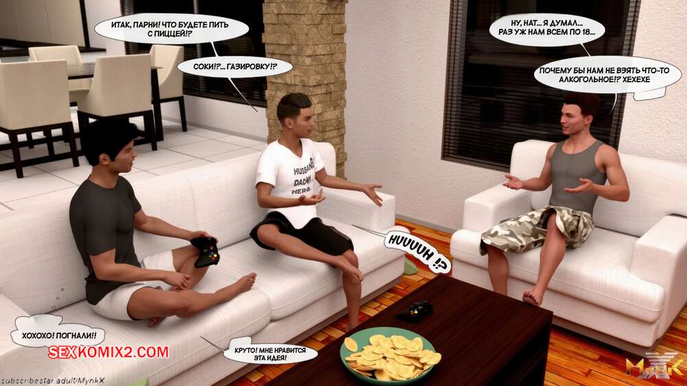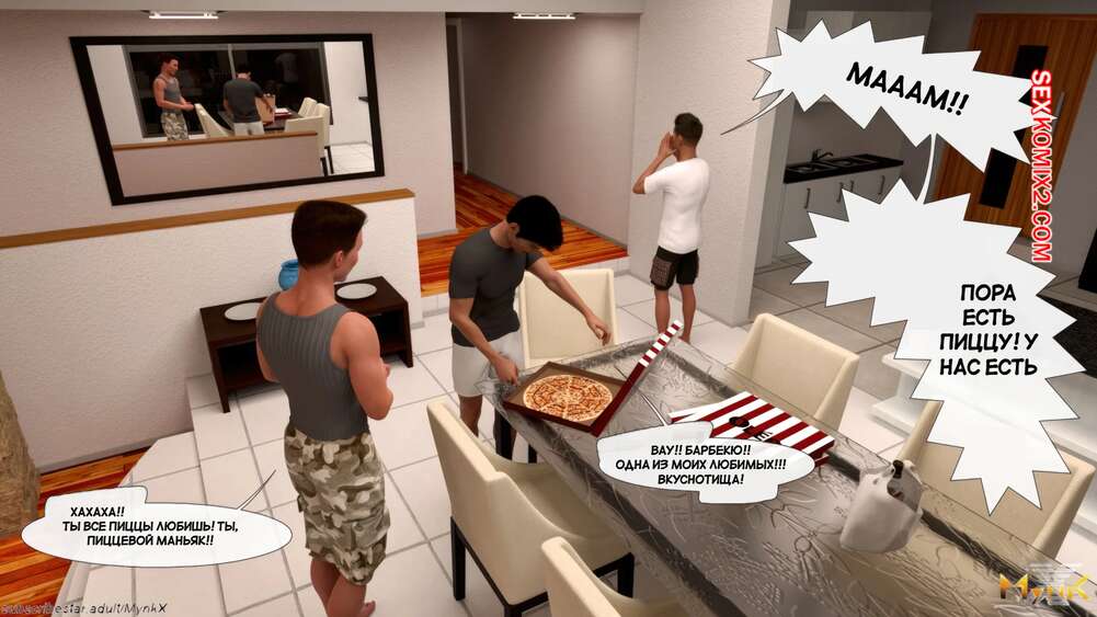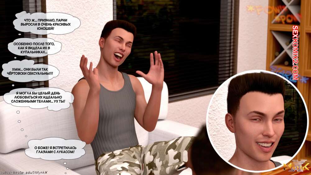 Порно комикс Кафе Фоли. Часть 2. Cafe Folies. Mynkx Молодые парни решили соблазнить горячую милфу и позвали ее посмотреть с ними фильм. Один из парней расположился с красоткой на диване и стал ласкать ее большие сиськи, возбуждая девушку.