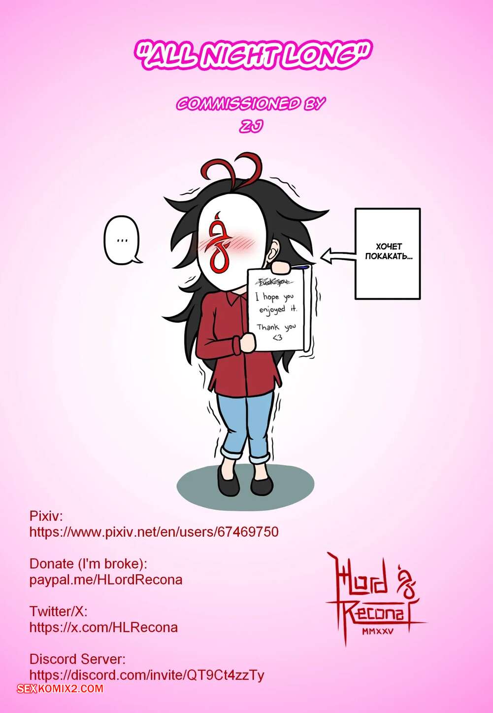 Порно комикс Всю ночь напролет. All Night Long. HLord Recona. Сексуальная милфа без ума от большого члена молодого парня. Она раздевается и хорошенько у него отсасывает, после чего раздвигает ножки и дает себя хорошенько выбать.