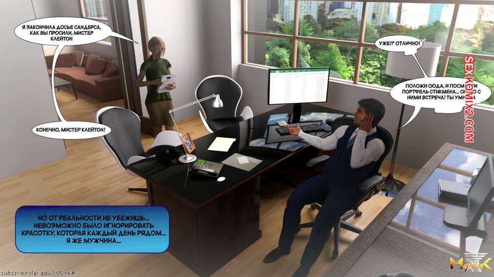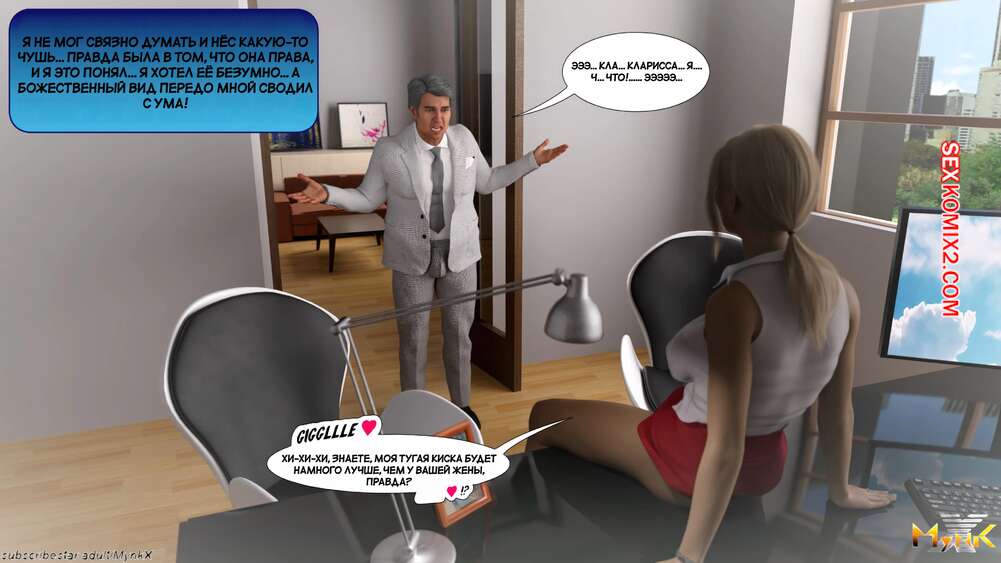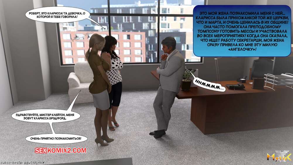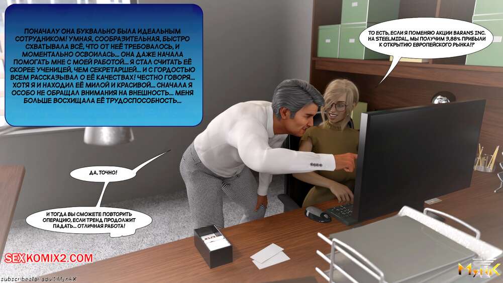 Порно комикс Молодая секретарша. The Young Secretary. Mynkx. Горячая блондинка работает в офисе и замечает на себе похотливые взгляды босса. Девушка хочет добиться повышения, поэтому она начинает к нему подкатывать, чтобы трахнуться с ним и получить дивиденты.