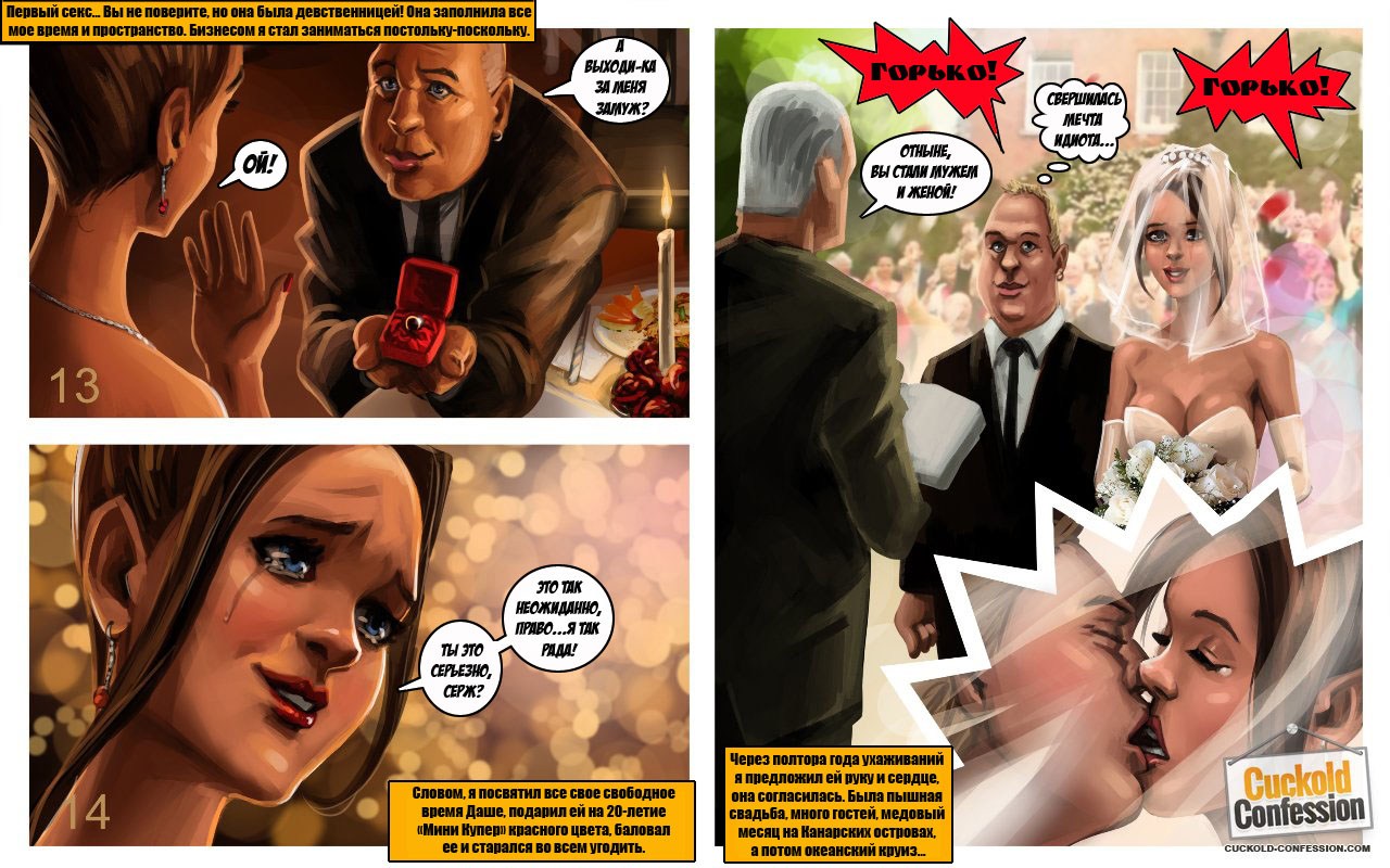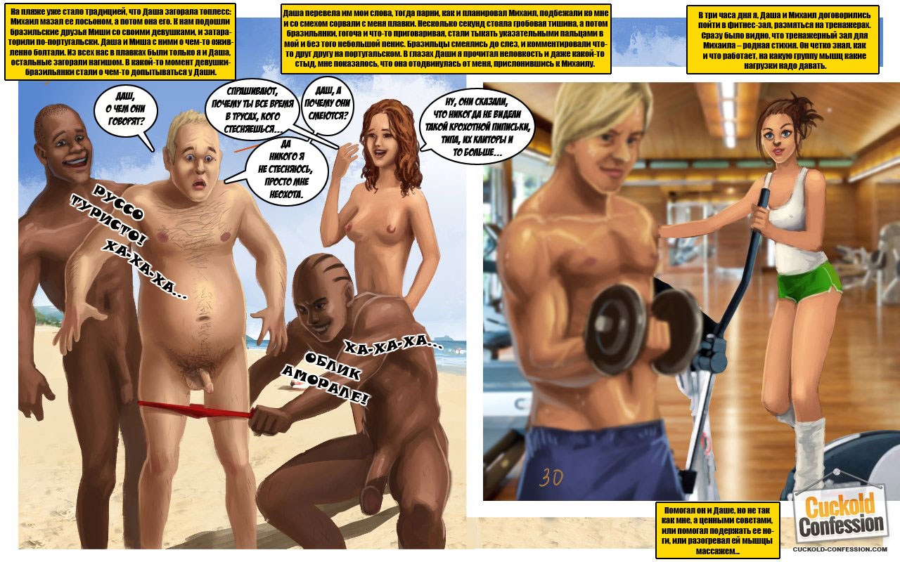 Секс комиксы против «Исповедь рогоносца». Молодая, сексуальная девушка замужем за богатым, но очень взрослым мужчиной он старше ее на 20 лет. Пара постоянно ездит туристические поездки за границу, и пока мужчина находится на работе, его молодая жена ходит на пляжи, там она знакомится с молодыми парнями. И в тайне от мужа занимается с ними сексом, но совершенно случайно муж узнает о том, что его жена ему изменяет. Его это не злит, а наоборот возбуждает, и следующий раз мужчина сам предлагает ей заняться сексом с незнакомым парнем. Но при этом хочет присутствовать, при этом процессе. Извращённое девушки очень нравится это предложение, и она с удовольствием соглашается.