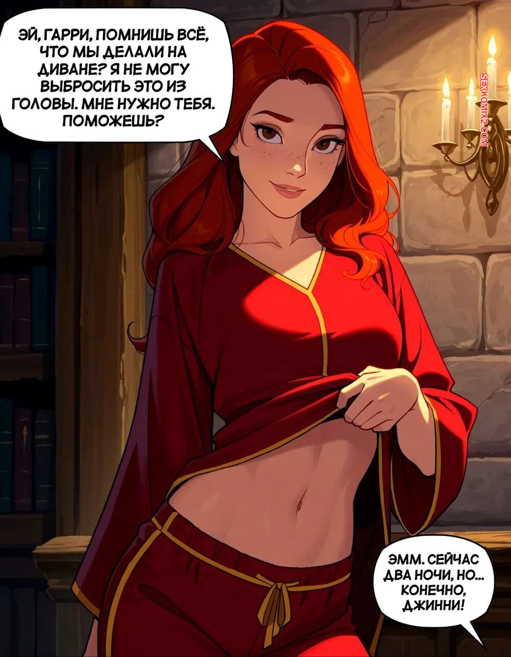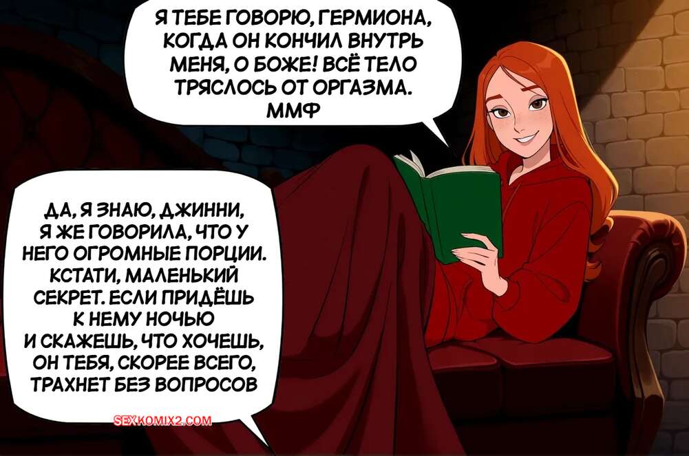 Порно комикс Гарри Поттер. Джинни хочет большего. Ginny wants more Рыжуля Джинни заигрывает с Гарри, желает пошалить. Красотка раздевается и соблазняет парня своим шикарным телом, после чего раздвигает ножки и дает себя хорошенько выебать.