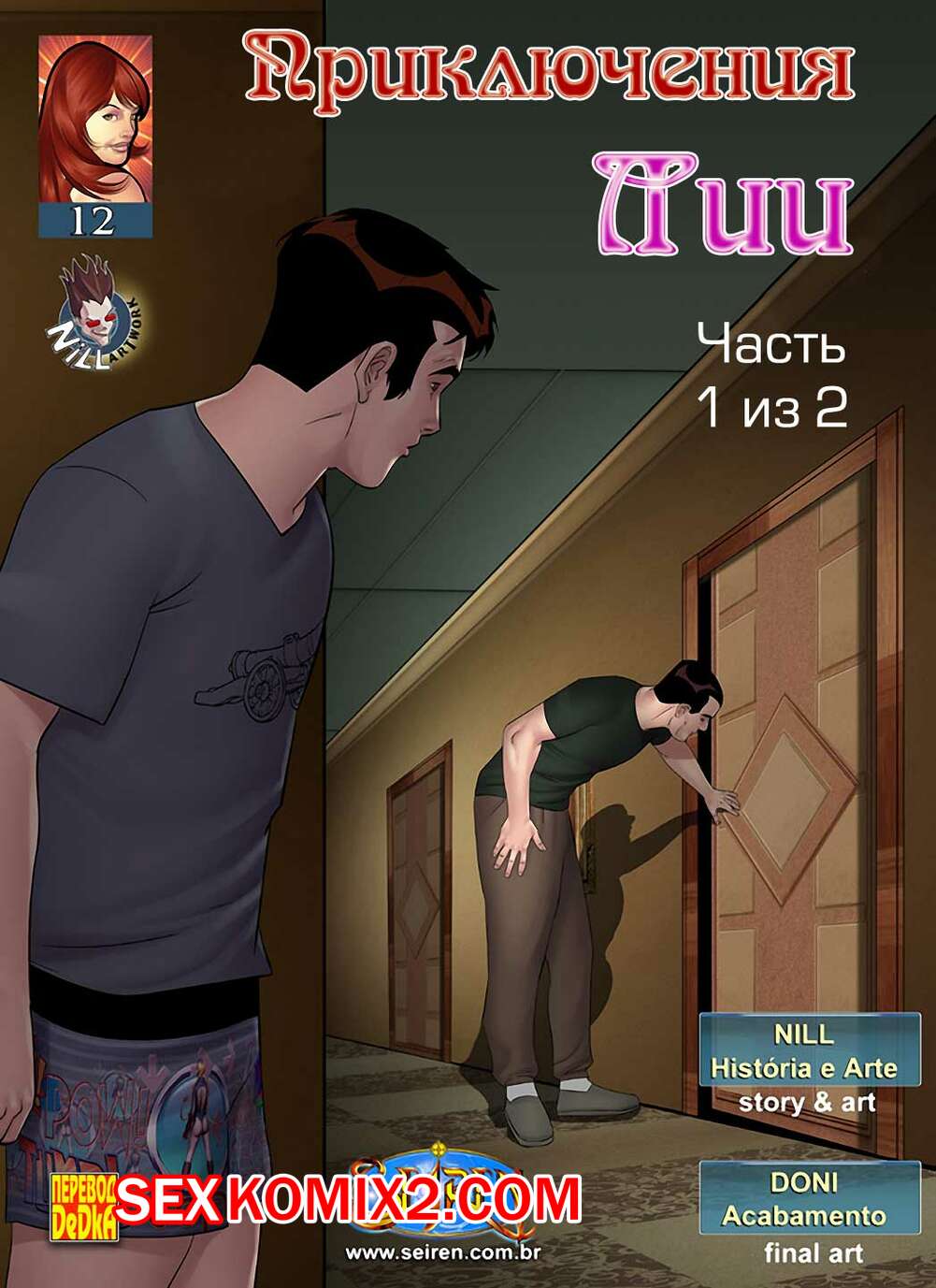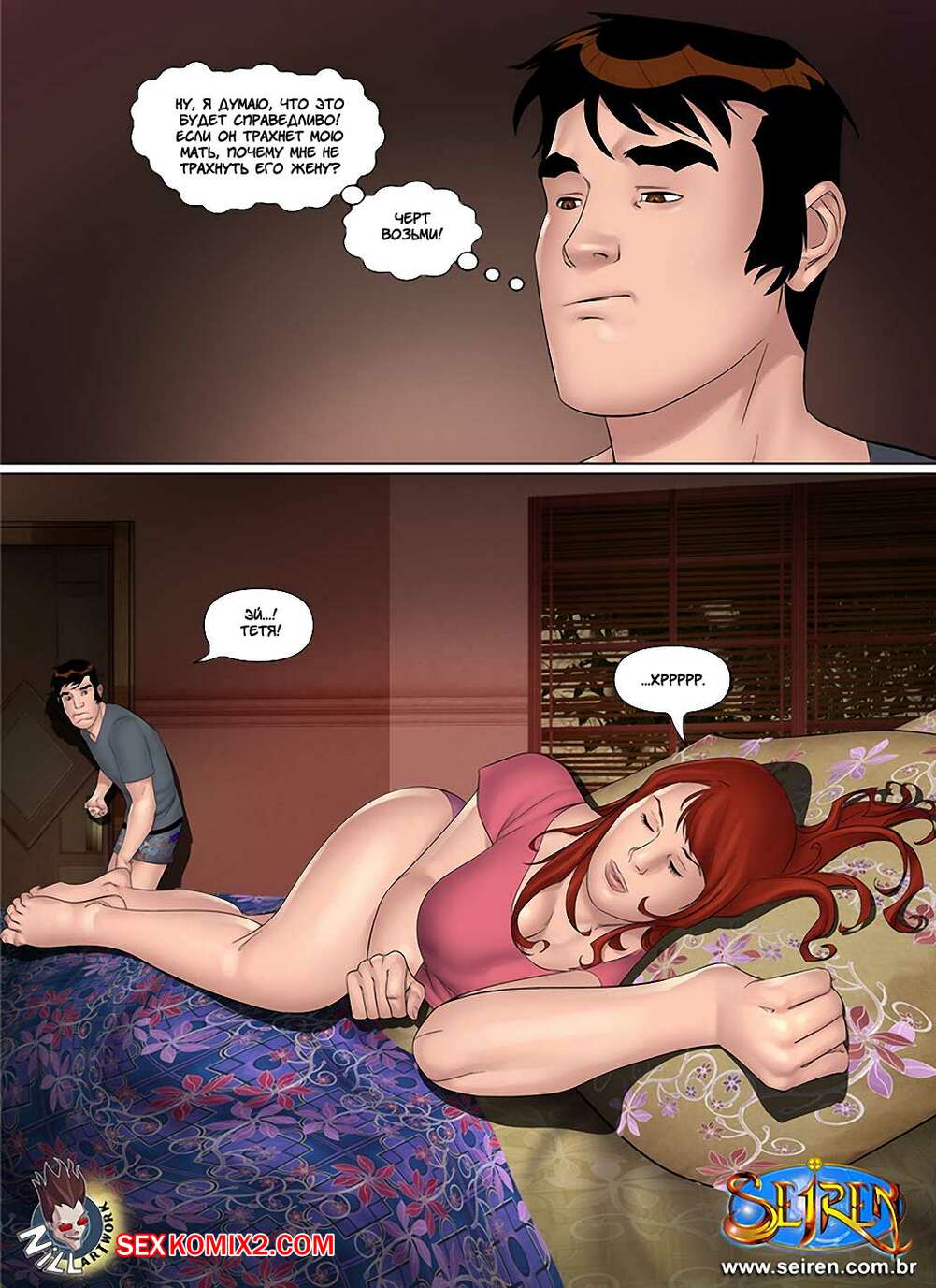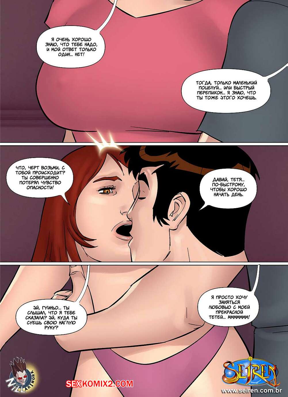 Порно комикс Приключения Лии. Часть 12. Эпизоды 1 и 2 Парнишка продолжает веселиться со своей горячей рыжей тетей милфой. Пока все заняты делами, он приходит к ней в комнату, где сучка делает ему афигенный отсос, после чего он ставит ее в разные позы и ебет в пизду и задницу.