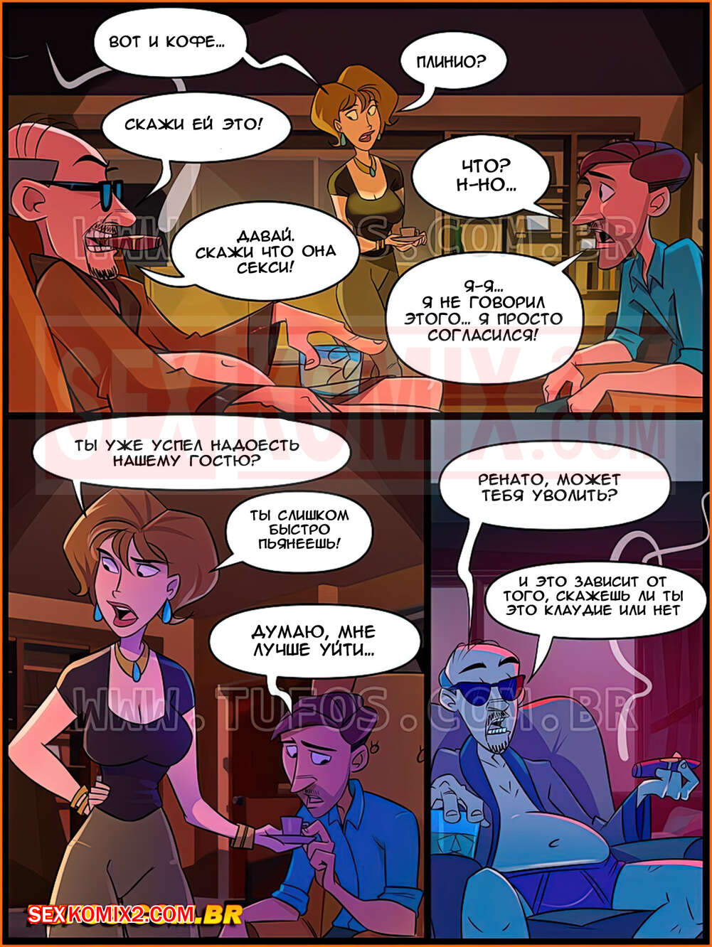 Порно комикс Дом мамы Джоаны. Часть 6. Жена начальника. Лошарик пришел к своему боссу в свой выходной и засмотрелся на задницу его жены. Резкий как удар серпом по яйцам начальник зацепился за этот взгляд и предъявил своему рабу, что он должен трахнуть сочную задницу его супруги. А он будет рядом на это смотреть и держаться за свой сморщенный хуй, периодически его подергивая будет давать указания куда и как ему совать в дырки его жены.