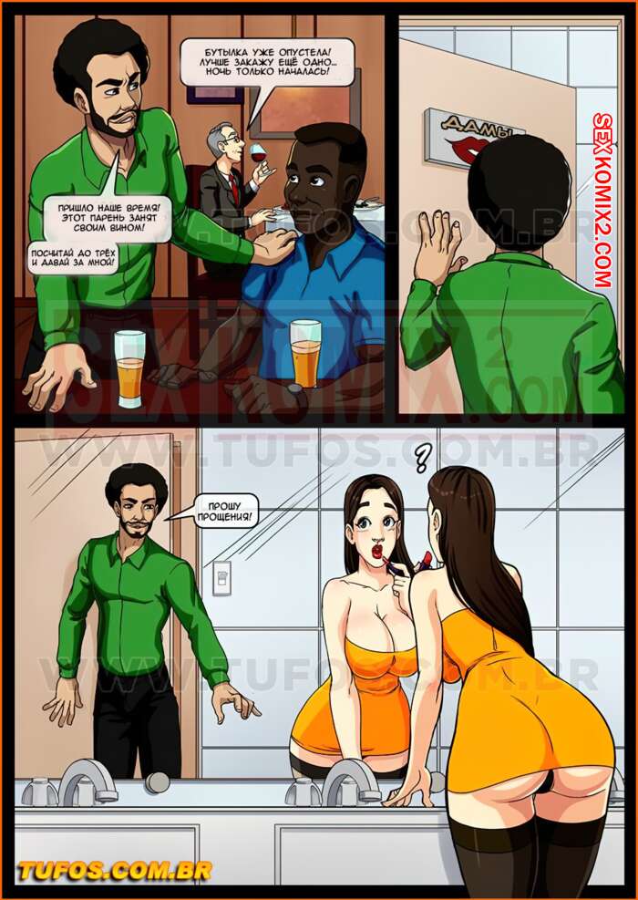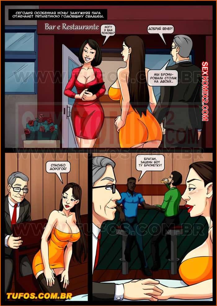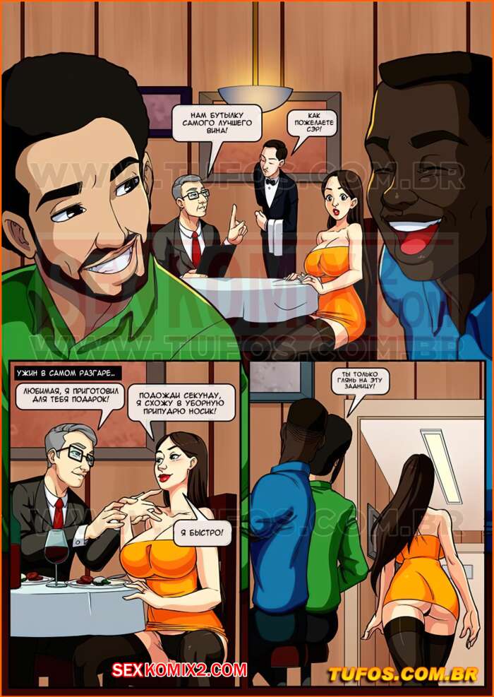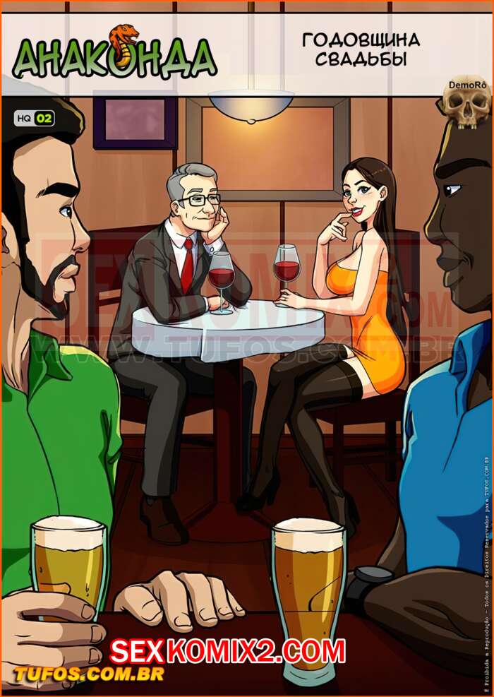 Порно комикс Анаконда. Часть 2. Годовщина свадьбы. Во время празднования годовщины свадьбы в ресторане девушка пошла в туалет, к ней зашли двое чернокожих парней и предложили секс втроем. Шлюшка сходу согласилась и принялась за дело.