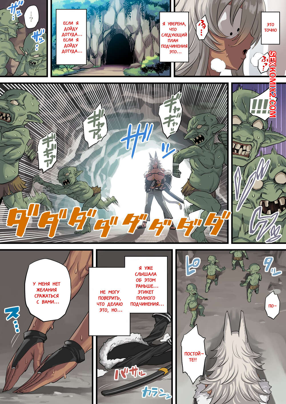 Порно комикс Гислен против Гоблинов Парочка гоблинов оказалась в лесу, пока шикарная сисястая красотка ласкала там свою пизду. Они быстренько сориентировались и принялись трахать эту шикарную сучку в два хуя.