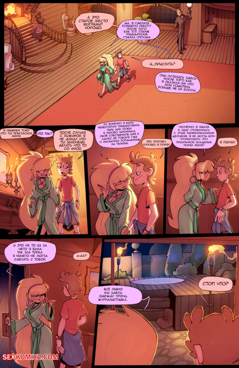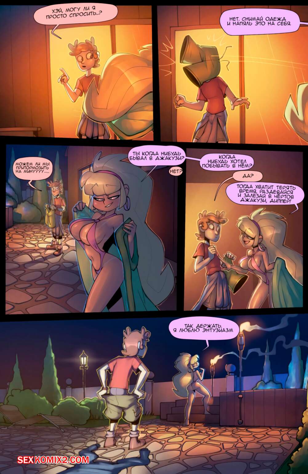 Порно комикс Гравити Фолз. Горячий источник. Hot tub Hijinx. Дипер увидел блондинку в горячем бассейне, она его заметила и позвала к себе. Парень возбудился, его член встал и красотка решила воспользоваться этим.