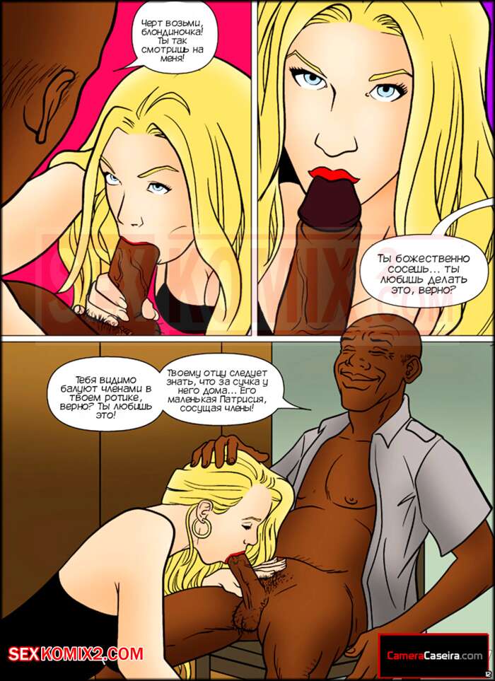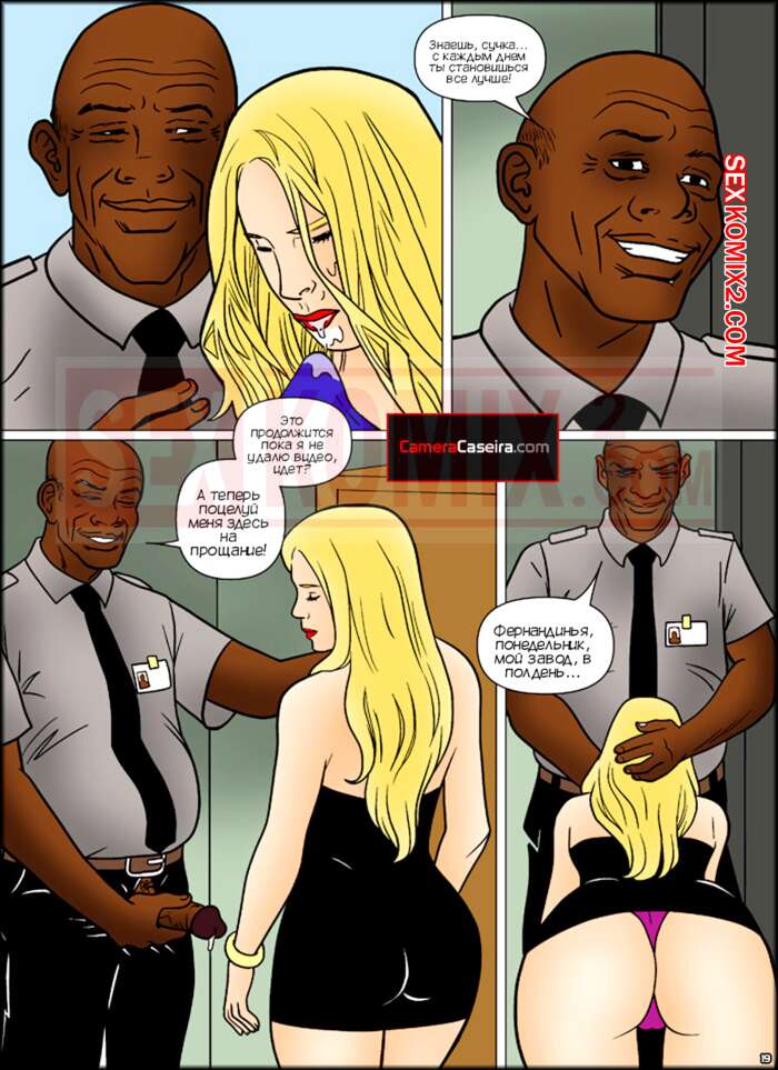Порно комикс Заводные негры. Часть 3. А швейцар не промах. Эпизод 2. Патрисия вернулась домой после вечеринки, она одета как шлюха. От ее наряда возбудился чернокожий швейцар, и захотел трахнуть красотку.