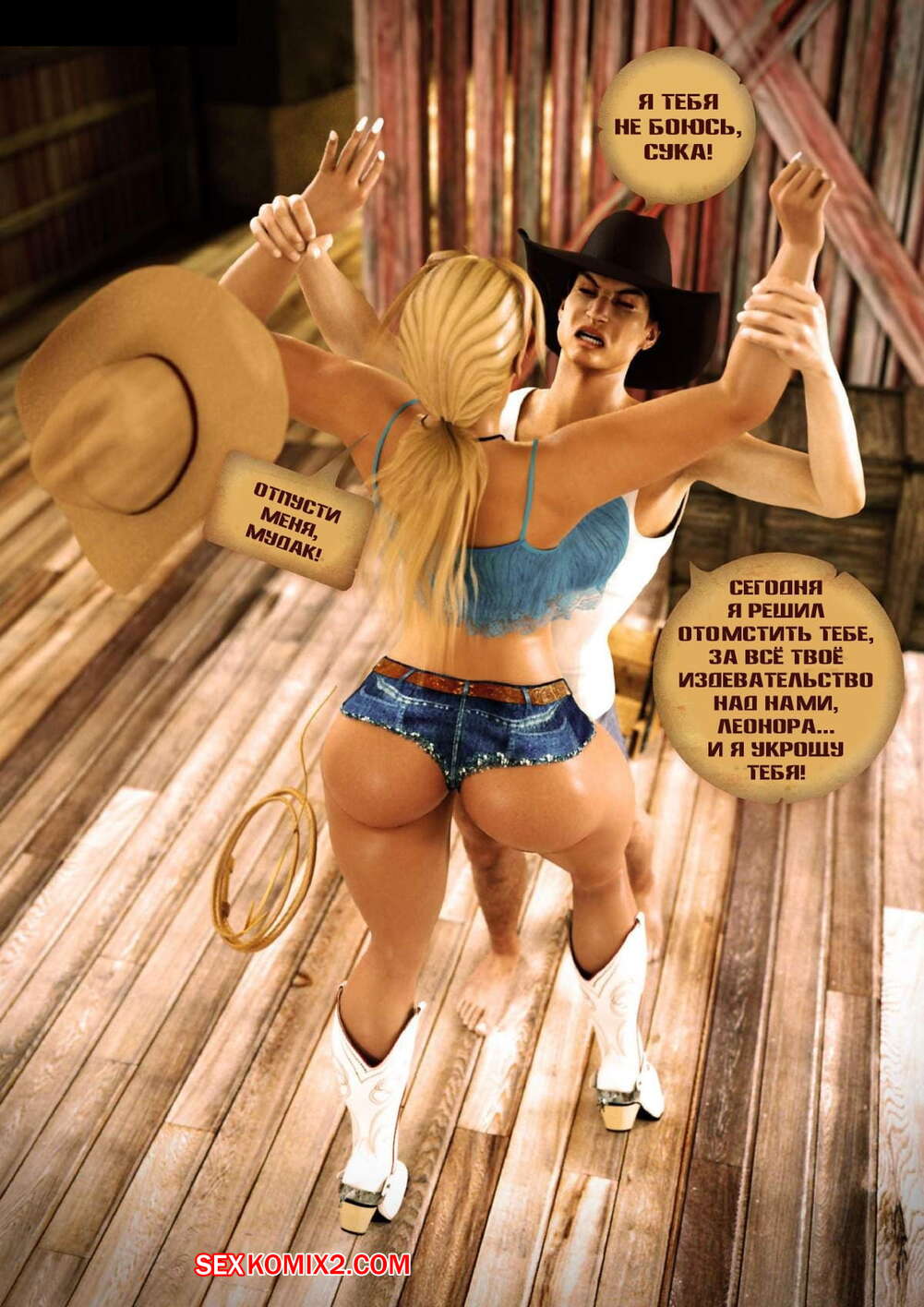 Порно комикс Укрощение Леоноры Мужику надоело, что сисястая хозяйка ранчо постоянно им командует. Он схватил сучку и лишил ее способности двигаться. Затем парень раздел красотку полностью до гола и начал хорошенько ебать своим большим хуем, преподавая ей уроки воспитания.
