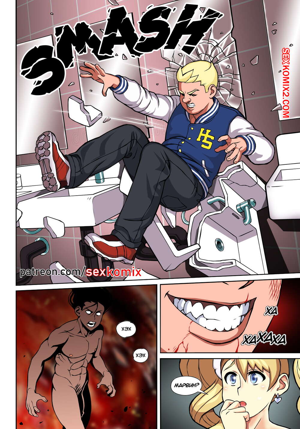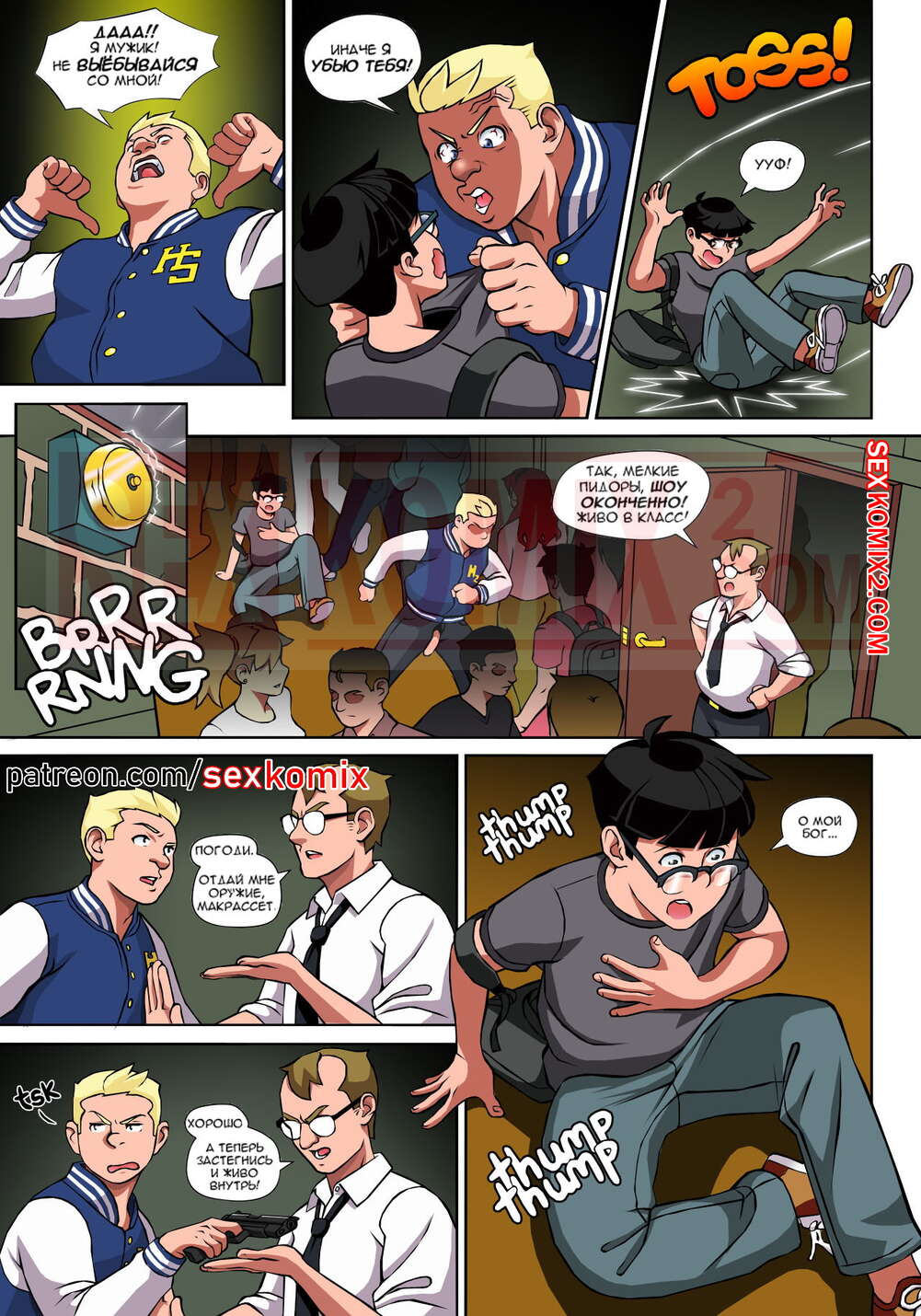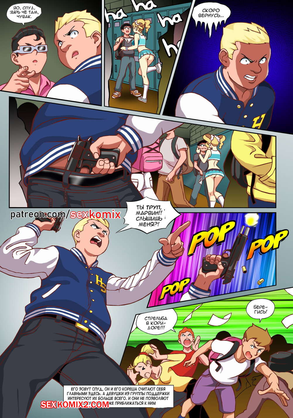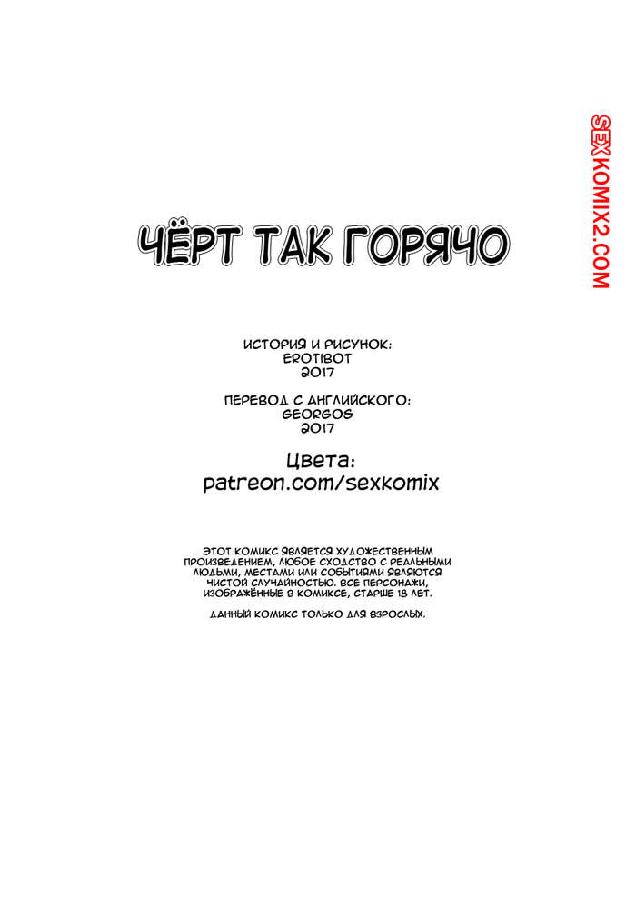 Порно комикс Чёрт так горячо. Часть 1. В цвете. Hot Shit High. Erotibot. В самой блядской школе в мире появился новенький, он и есть главный герой этой истории. Парень пришел в первый день с огромным желанием учиться, но что-то мне подсказывает, на его пути будет несколько преград, о которых он не подозревает. Не успел он договорить фразу о том, что ему нужно учиться. В его лицо прилетели трусики сомой сексуальной девушки в школе. Самый круто парень в школе увидел что какой-то лузер говорит с его подружкой и достал ствол, чтобы проучить его.