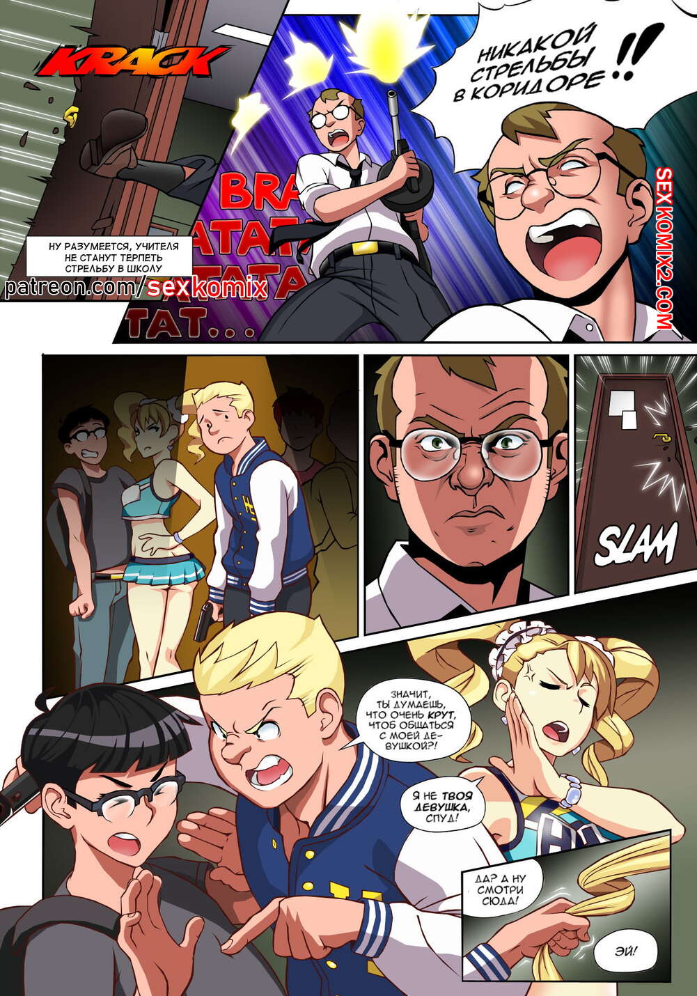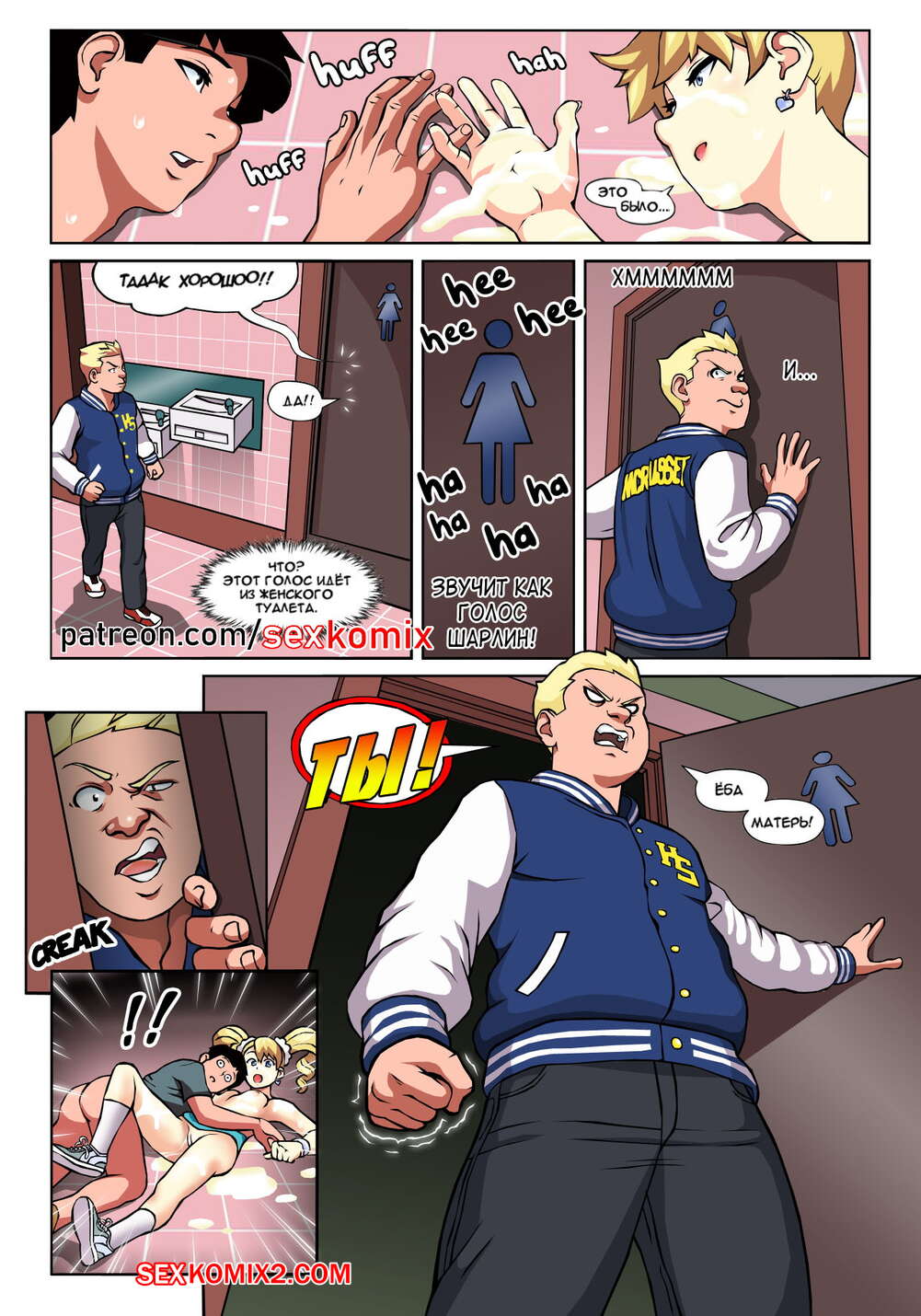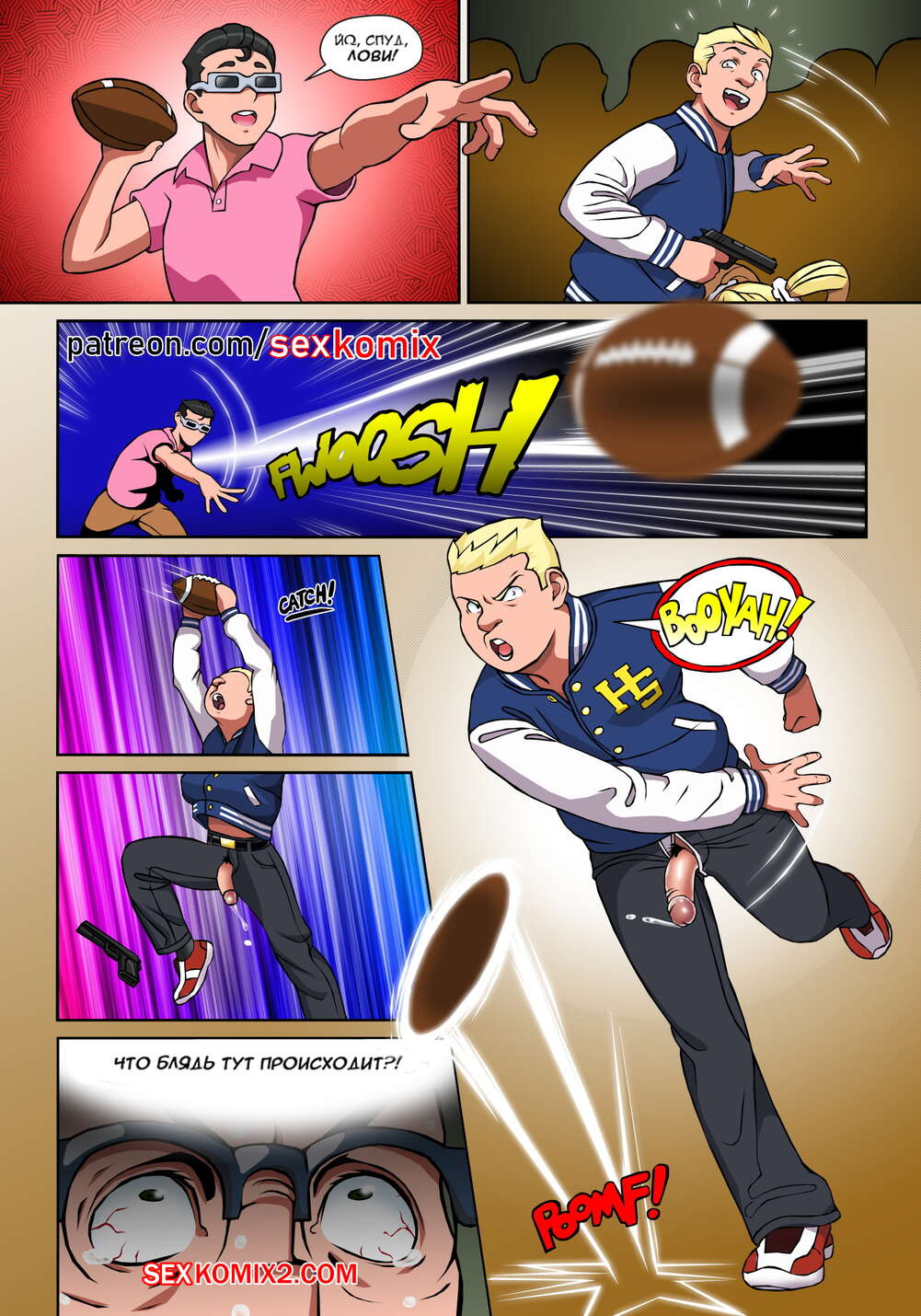 Порно комикс Чёрт так горячо. Часть 1. В цвете. Hot Shit High. Erotibot. В самой блядской школе в мире появился новенький, он и есть главный герой этой истории. Парень пришел в первый день с огромным желанием учиться, но что-то мне подсказывает, на его пути будет несколько преград, о которых он не подозревает. Не успел он договорить фразу о том, что ему нужно учиться. В его лицо прилетели трусики сомой сексуальной девушки в школе. Самый круто парень в школе увидел что какой-то лузер говорит с его подружкой и достал ствол, чтобы проучить его.
