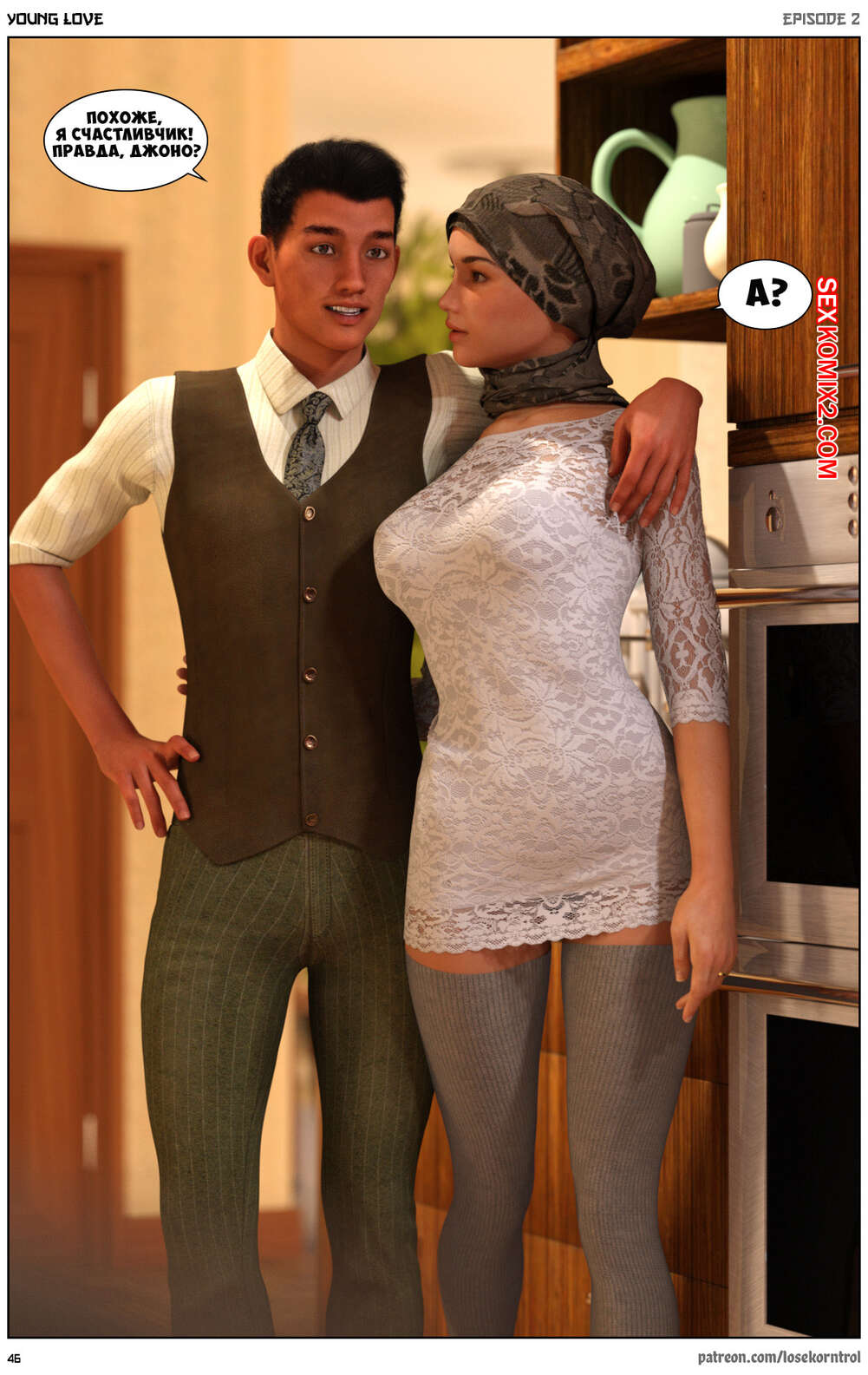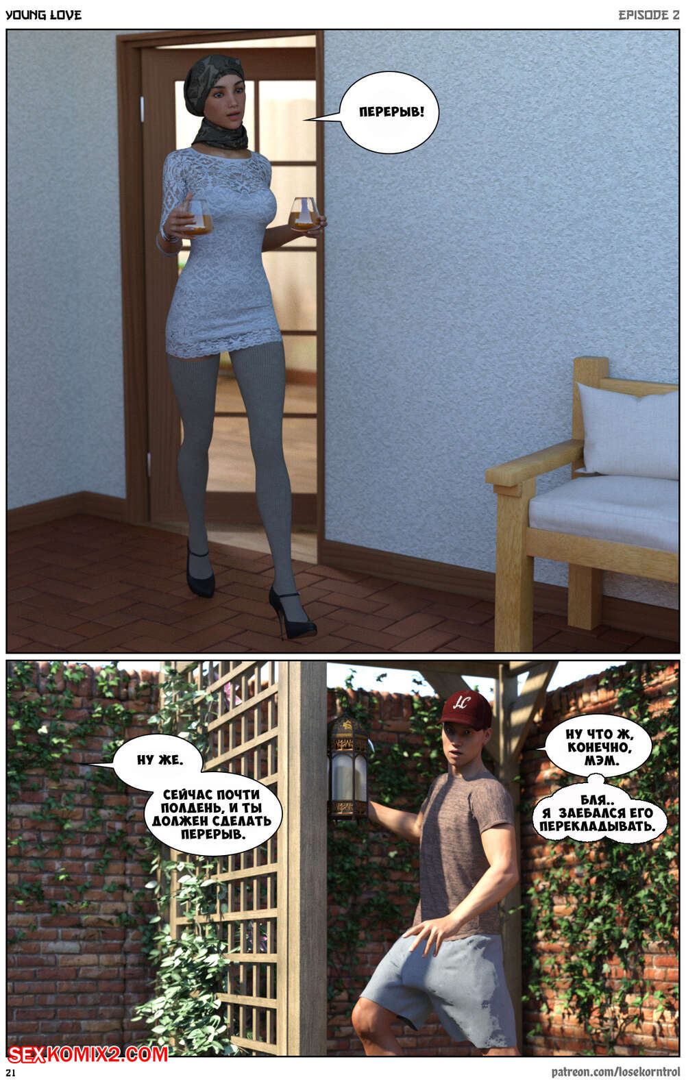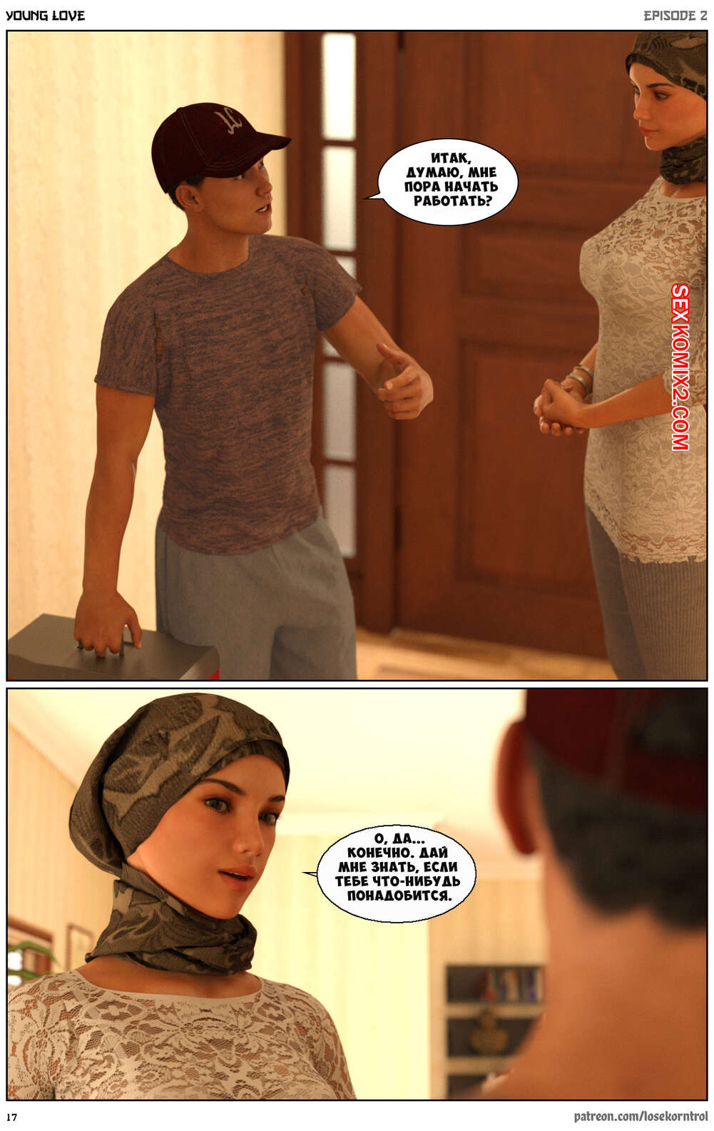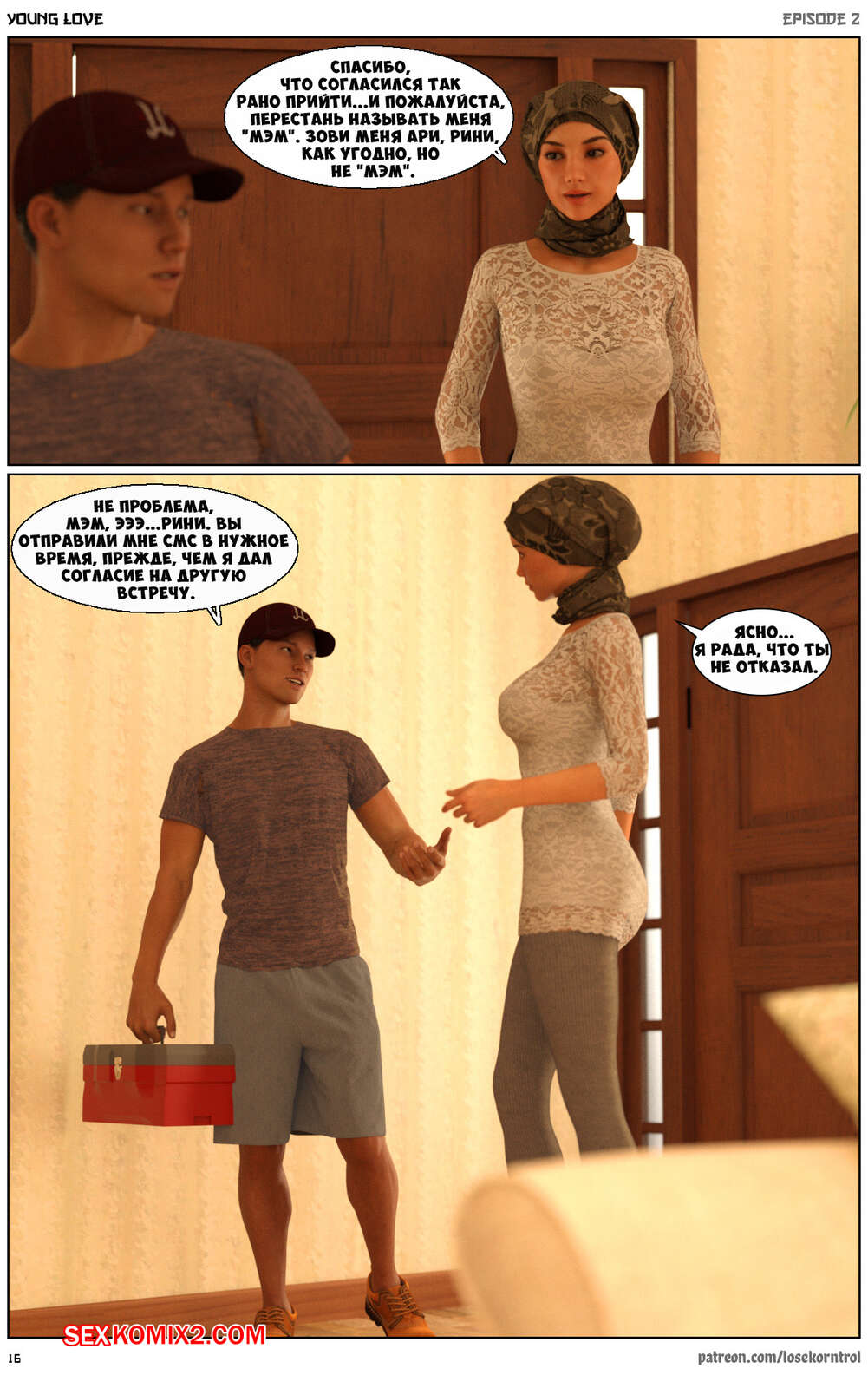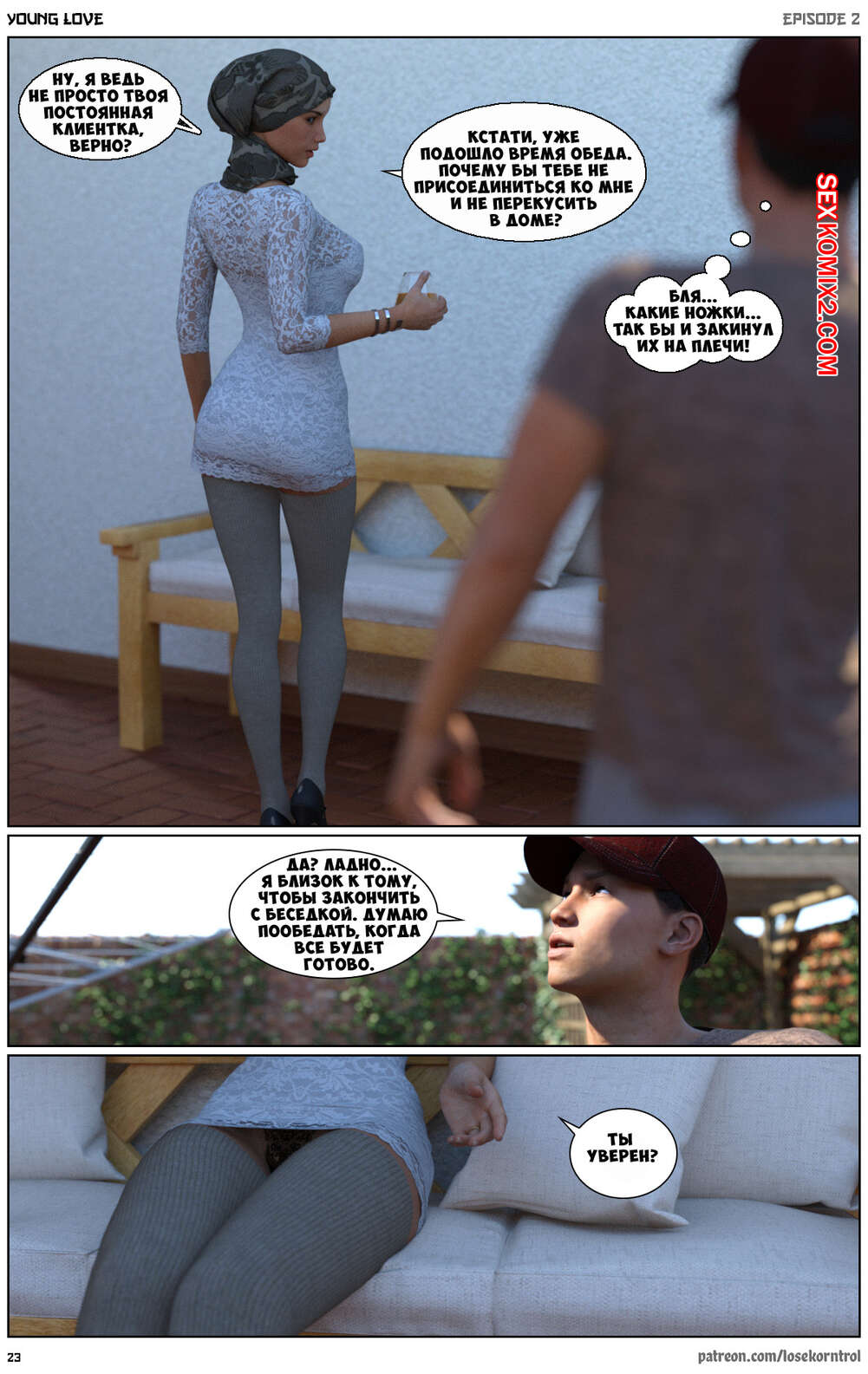 Порно комикс Любовная история. Часть 2. Юная любовь. Young love. Losekorntrol Горячая красотка брюнетка снова воспользовалась тем, что ее муж уехал из дома. Когда к ней пришел молодой паренек для работы, она стала его соблазнять и начала сосать большой хуй парня, а затем дала ему себя выебать.