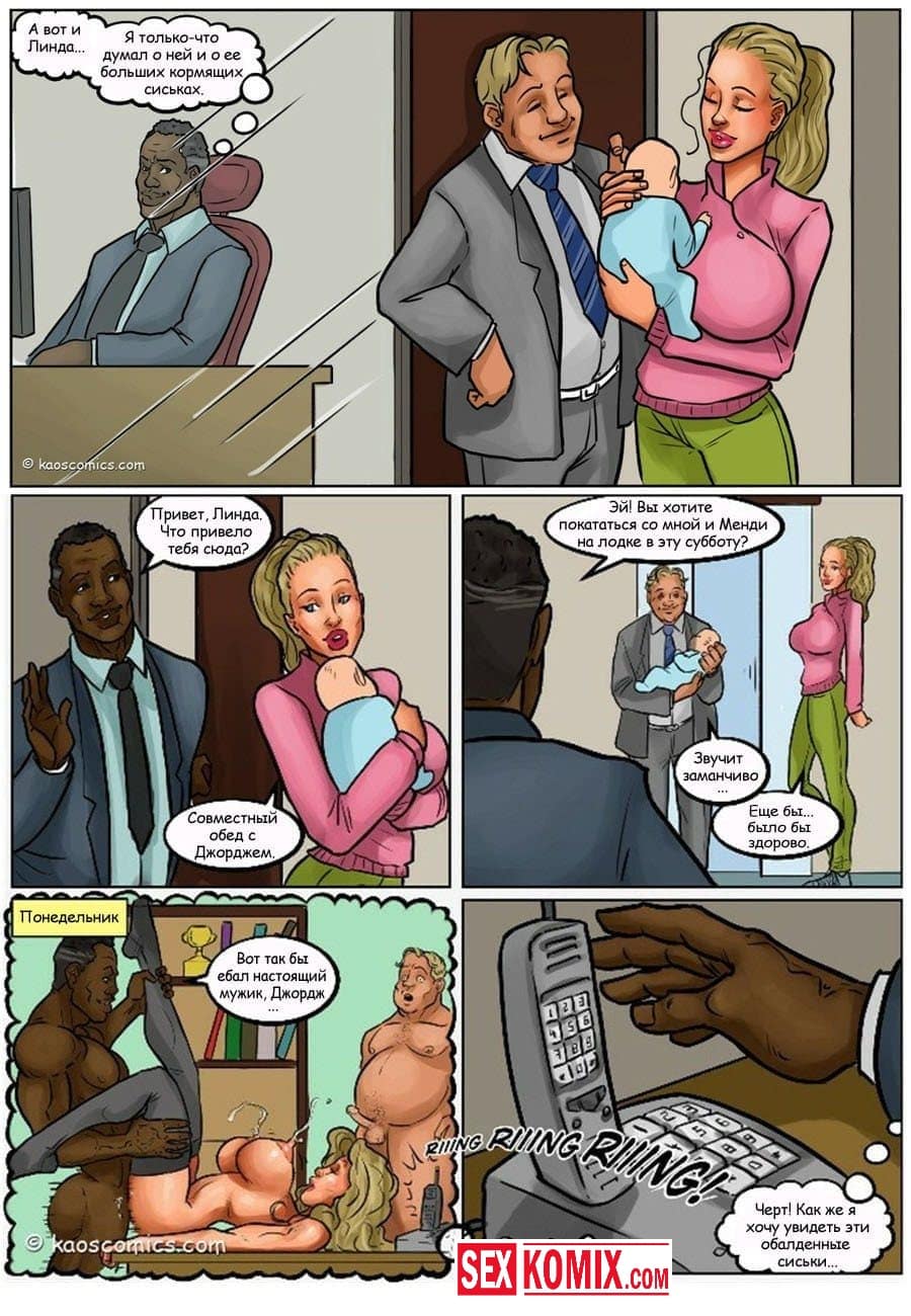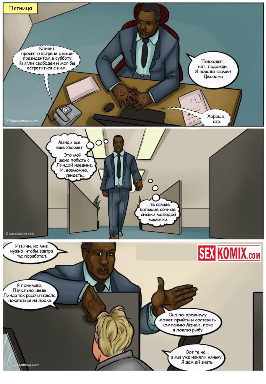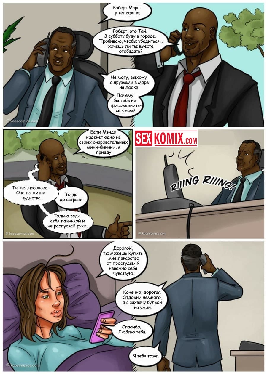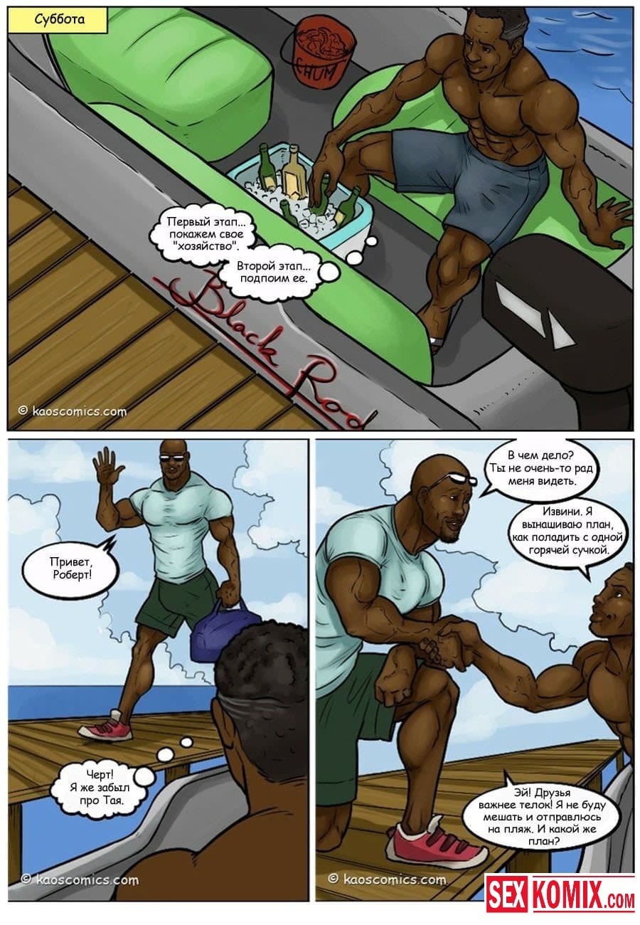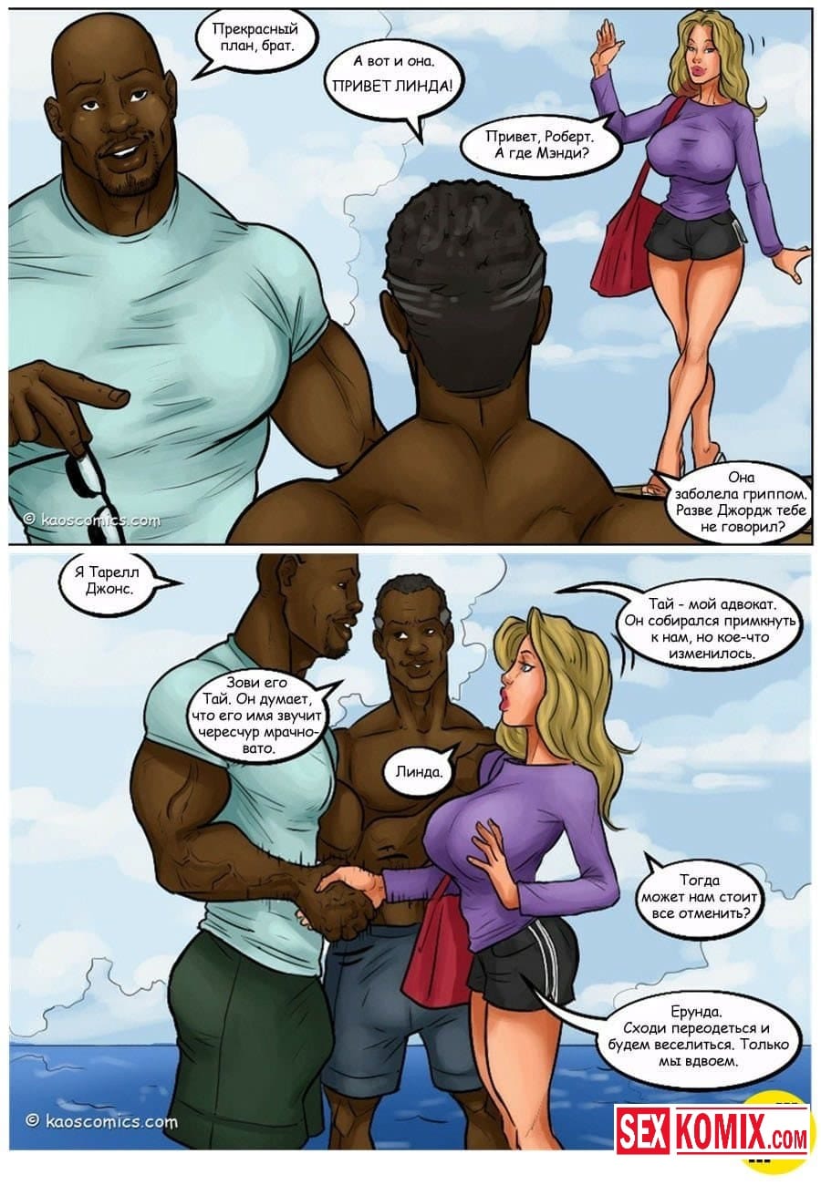 Порно комикс Сговор против бикини. Два чернокожих парня пригласили на свою яхту очень сексуальную девушку с большими сиськами и стройной фигурой. Она загорала на солнышке, парни специально обрызгали её водорослями. Девушка пошла мыться в воде, пока она мылась ей пришлось раздеться догола, и все и нижнее белье унесла вода. Когда она вернулась на яхту, эти парни уже ждали ее со стоящими членами, и начался настоящий разврат.