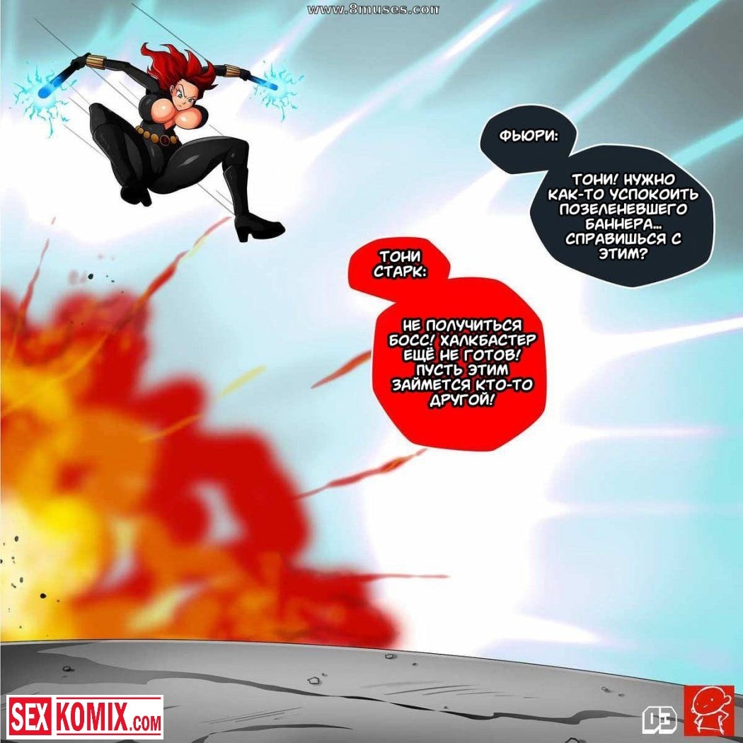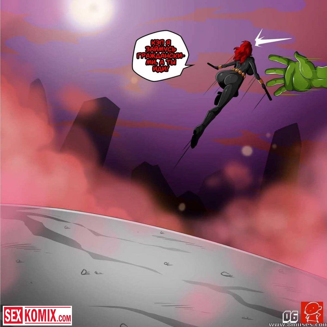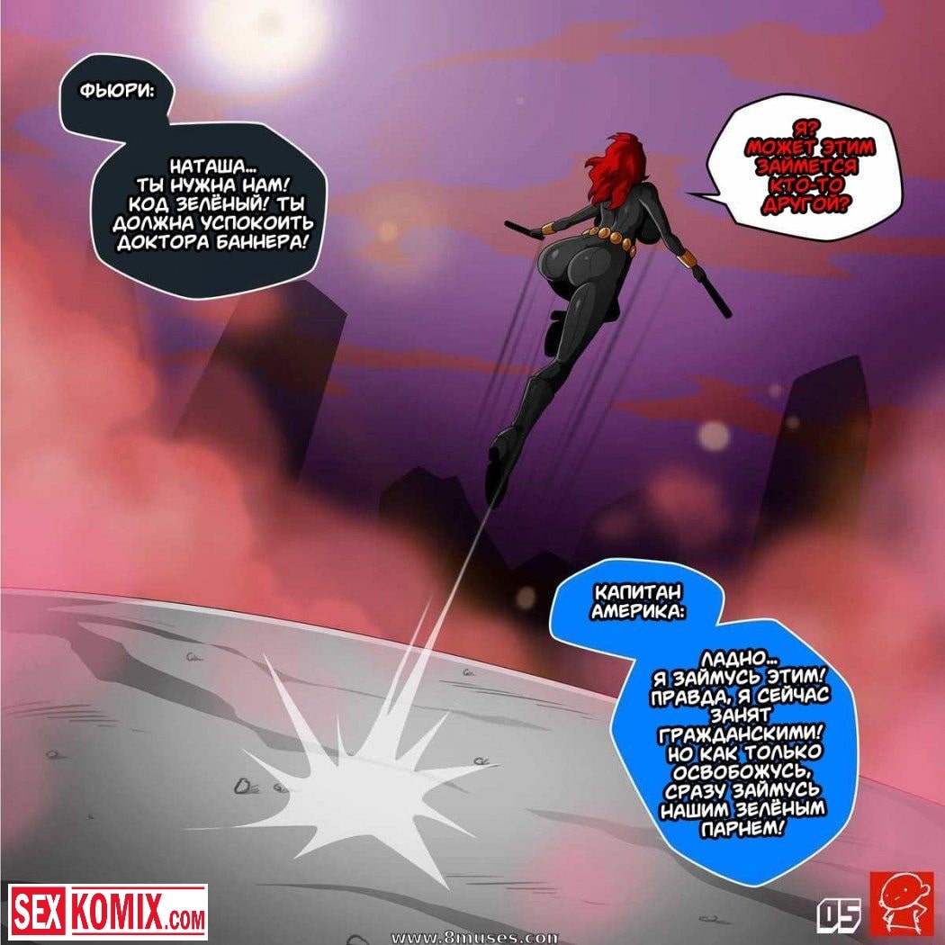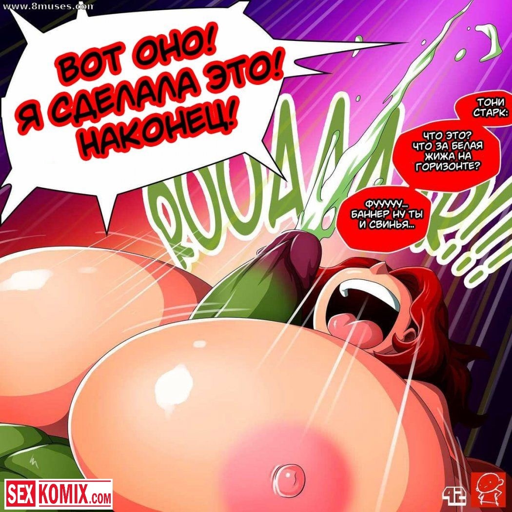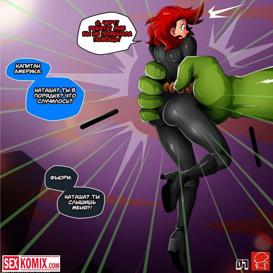 Порно комикс Черная Вдова и Халк. После очередной миссии по спасению мира, команда Мстители возвращалась на базу. Черная вдова никак не могла успокоить Халка, чтобы тот обратно превратился в человека. Она пыталась от него увернуться, но здоровяк оказался проворнее. Он схватил сексуальную красотку, содрал с нее одежду и оголил ее большие сиськи наружу. Когда и киска оказалась голой, Халк достал свой огромный зеленый член, и вонзил его черную вдову.