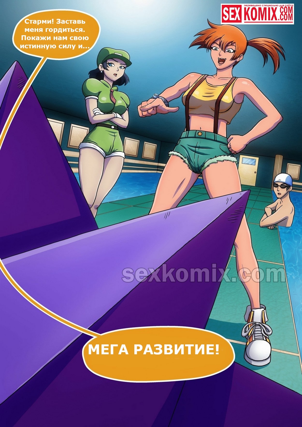 Порно комикс Покемоны. Представление Мисти. Очень сексуальная тренер покемонов по имени Мисти занимается тренировкой своего самого сильного бойца. Они уже готовятся к тому, чтобы та перешла на следующий уровень эволюции. Но тренер не ожидала, что когда ее звезда перейдет на следующий уровень, она превратится в очень сексуальную девушку с большой грудью. И захочет заняться сексом со своим тренером, они начинаю трахаться в бассейне.
