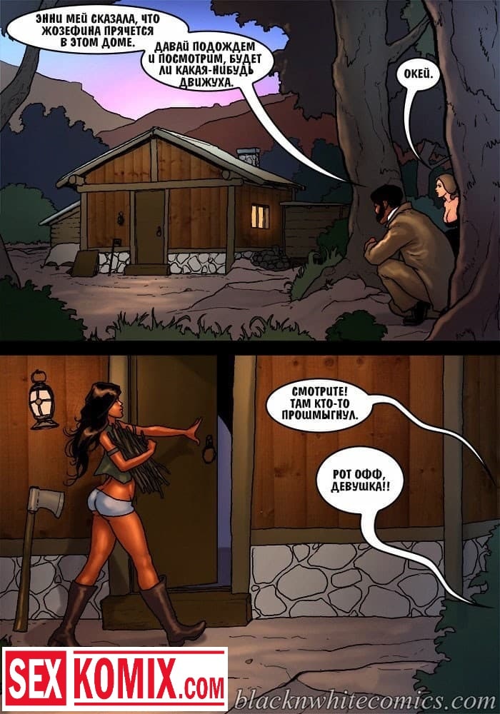 Порно комикс Честный коп. Часть 4. Ковбой с дикого запада со своей сексуальной напарницей, пришли к убежищу известной преступницы. Он оставил свою подругу на подстраховке, а сам пошел в хижину, чтобы схватить бандитку. Но когда она была у него на мушке, мужчина почувствовал ствол у своего затылка, это была вторая девушка. Они решили наказать копа, и соблазнили его своими сексуальными телами. Мужчина не смог вывернуться из ситуации, ему пришлось трахнуть их.