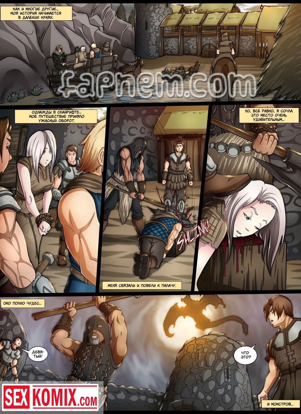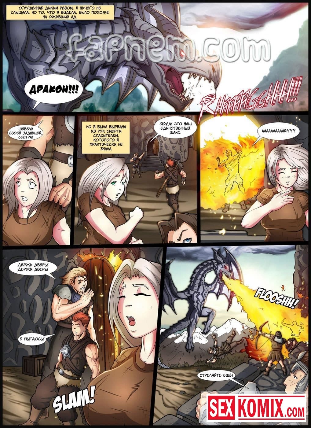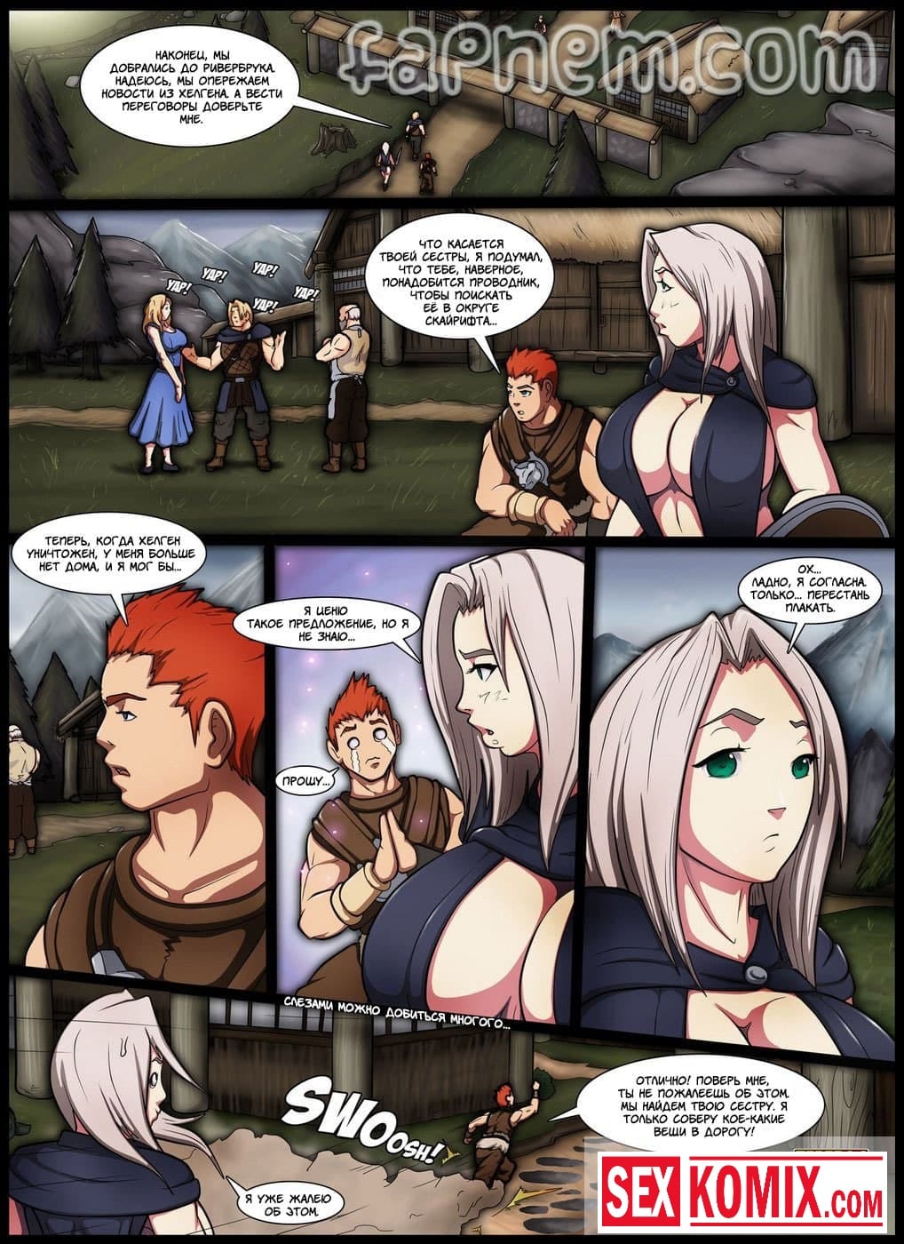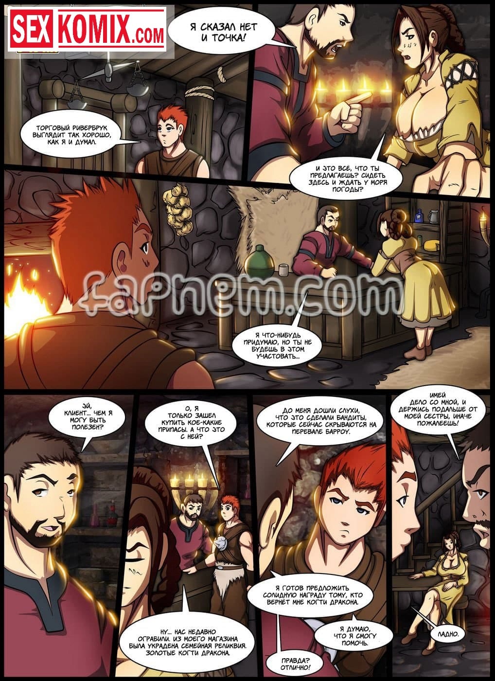 Порно комикс Легенда о Скайрифте. Действие происходит в древние времена. Славный рыцарь сражается в одной команде с пышногрудой красоткой. Они уже много боёв прошли вместе. После сражения с драконом, решив отметить победу она забрели в один из местных трактиров. Греясь у камина он заметил стоячие соски девушки. Она возбудилась от того, что вспомнила, как играли мышцы у её напарника при сражении с врагом. Парень понял что девушка его хочет и не растерялся. Он начал трогать её большие груди, вылизывать её киску, а потом засунул в неё свой большой член.
