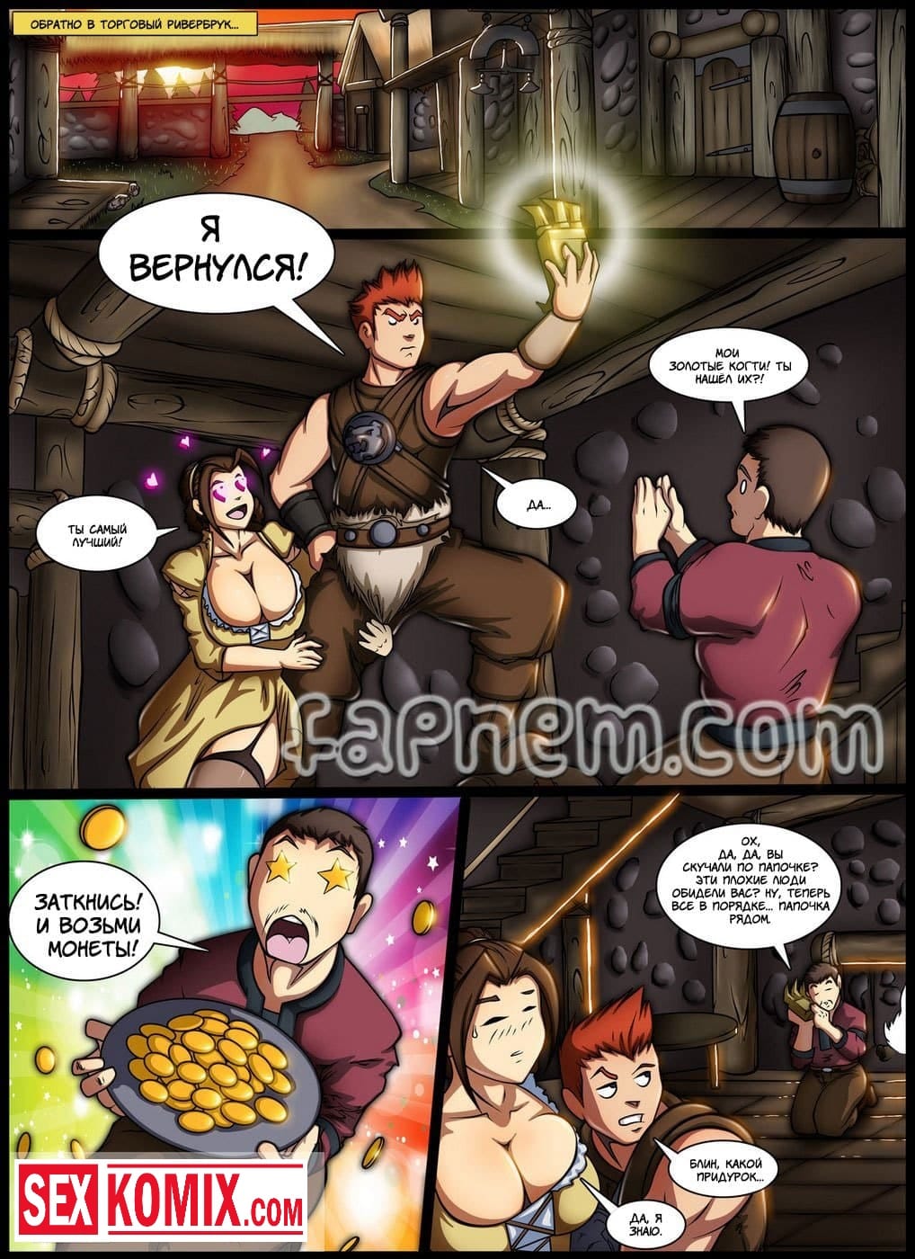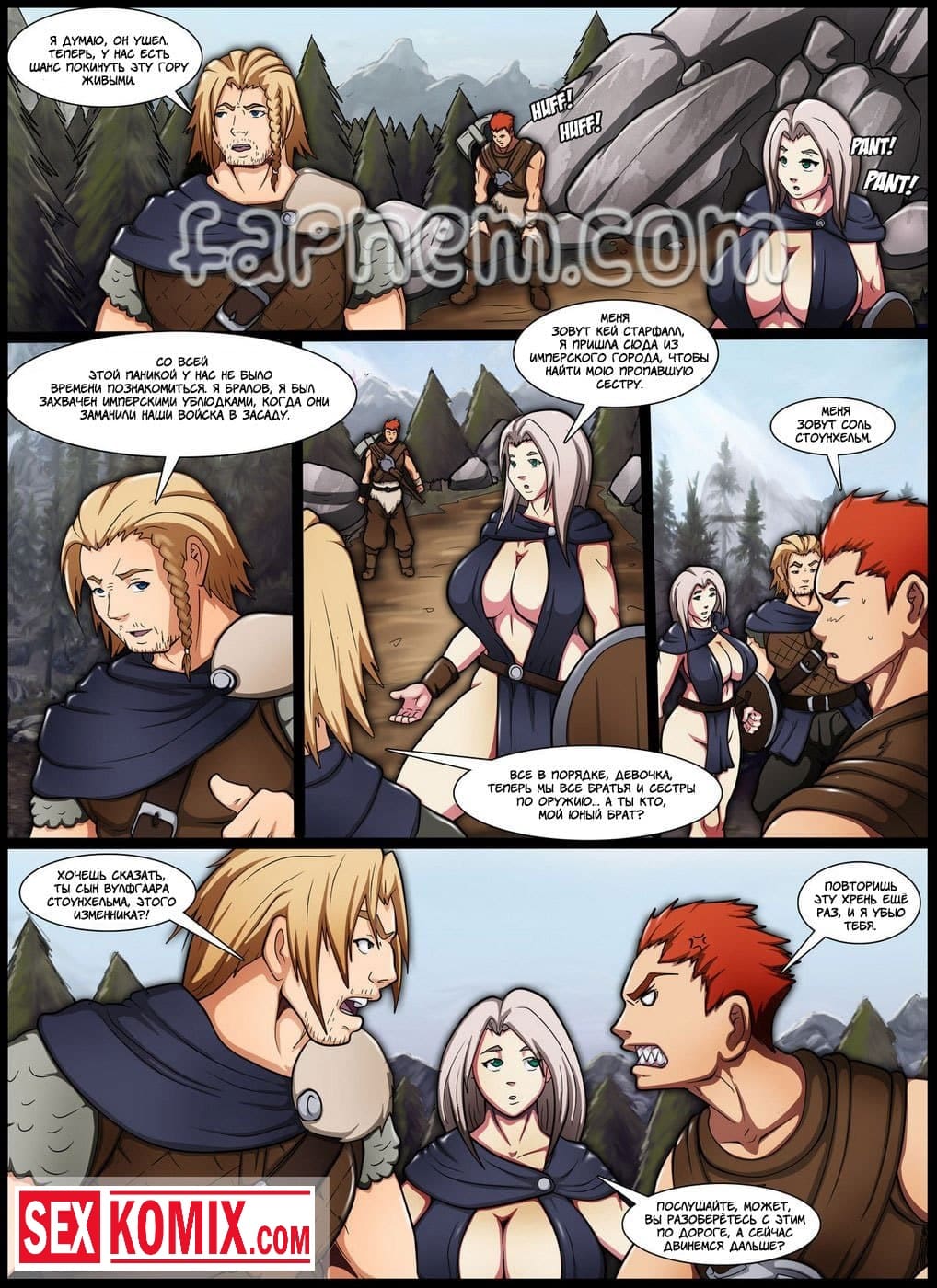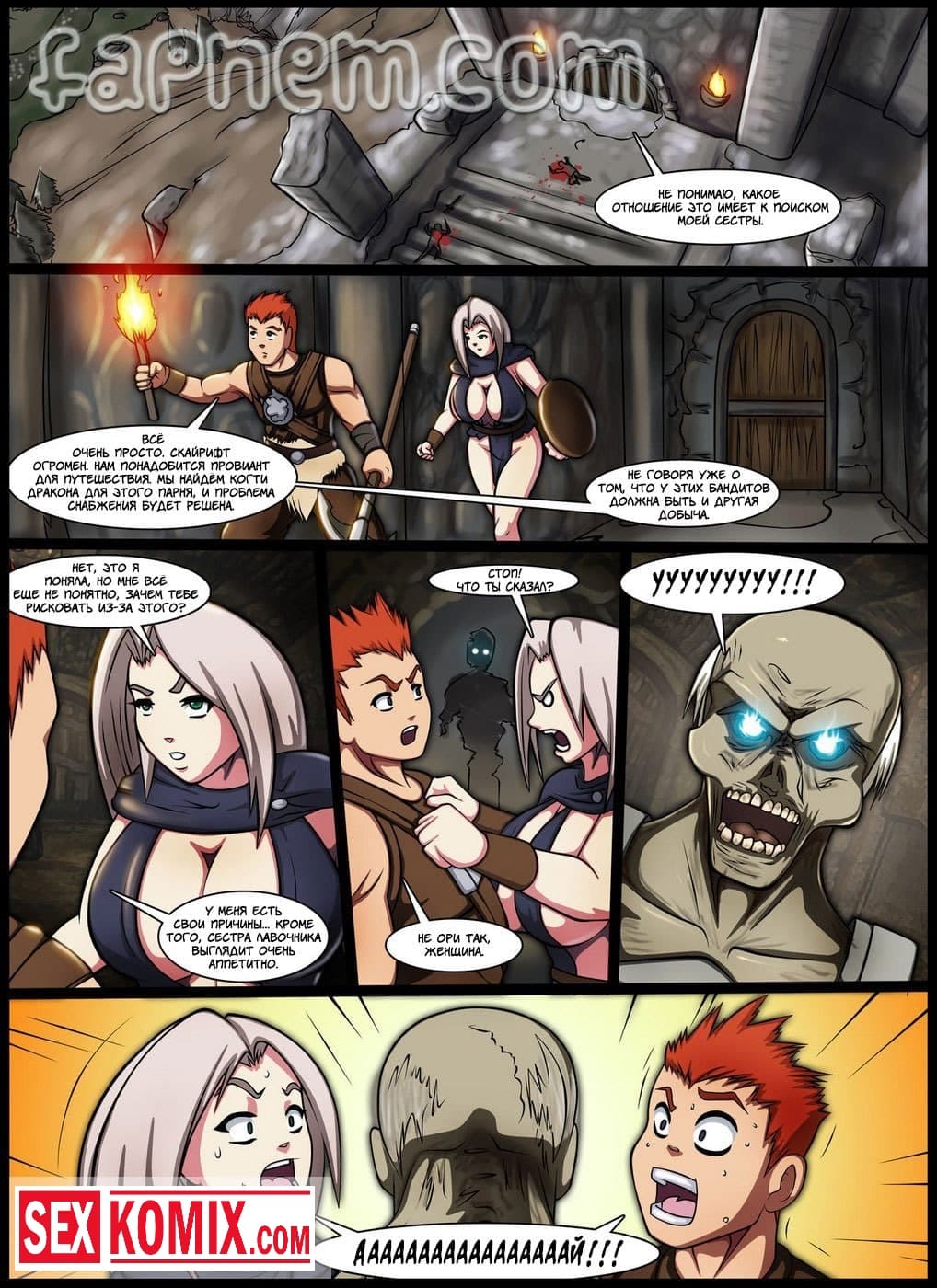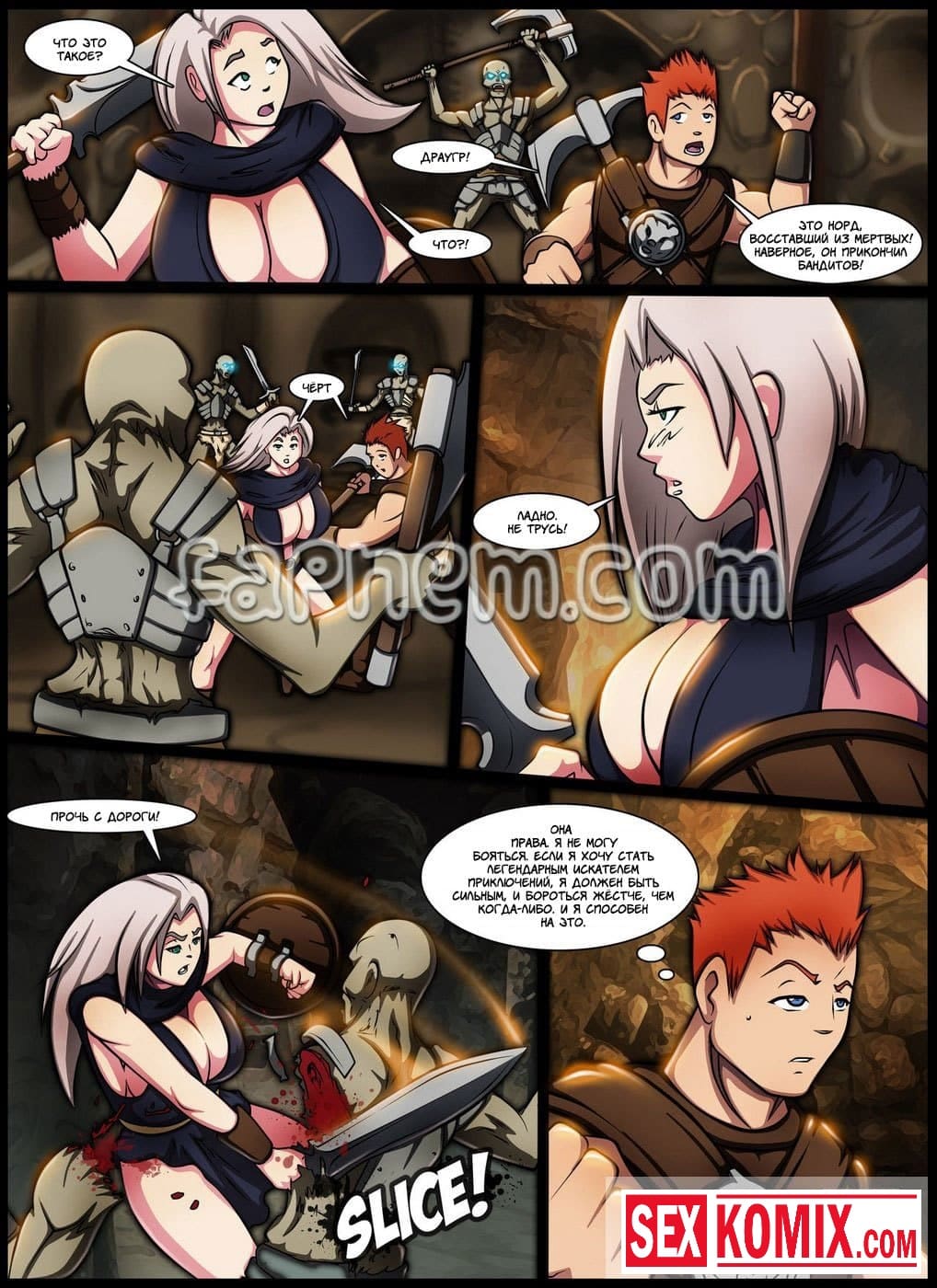 Порно комикс Легенда о Скайрифте. Действие происходит в древние времена. Славный рыцарь сражается в одной команде с пышногрудой красоткой. Они уже много боёв прошли вместе. После сражения с драконом, решив отметить победу она забрели в один из местных трактиров. Греясь у камина он заметил стоячие соски девушки. Она возбудилась от того, что вспомнила, как играли мышцы у её напарника при сражении с врагом. Парень понял что девушка его хочет и не растерялся. Он начал трогать её большие груди, вылизывать её киску, а потом засунул в неё свой большой член.