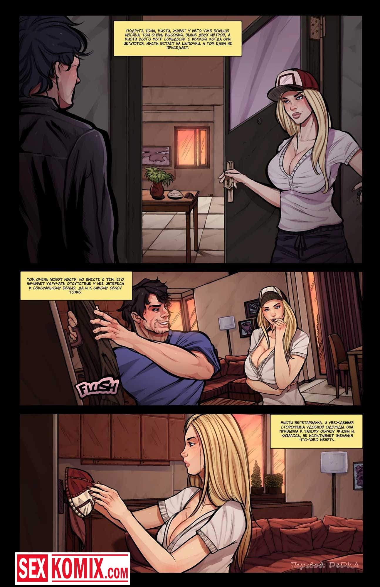 Порно комикс Только не мясо. Часть 1. Парень познакомился через интернет с очень сексуальной девушкой и они пошли на первое свидание в ресторан. Он заказал еду для обоих и девушки принесли мясо. Но парень не знал, что на него у красотки аллергия и после того как она съедает хотя бы кусочек, у неё очень сильно вырастают сиськи. Девушка попробовала несколько кусочков мяса и неожиданно её грудь начала рости. Увидев это, парень отвел её в свою машину хорошенько трахнул.