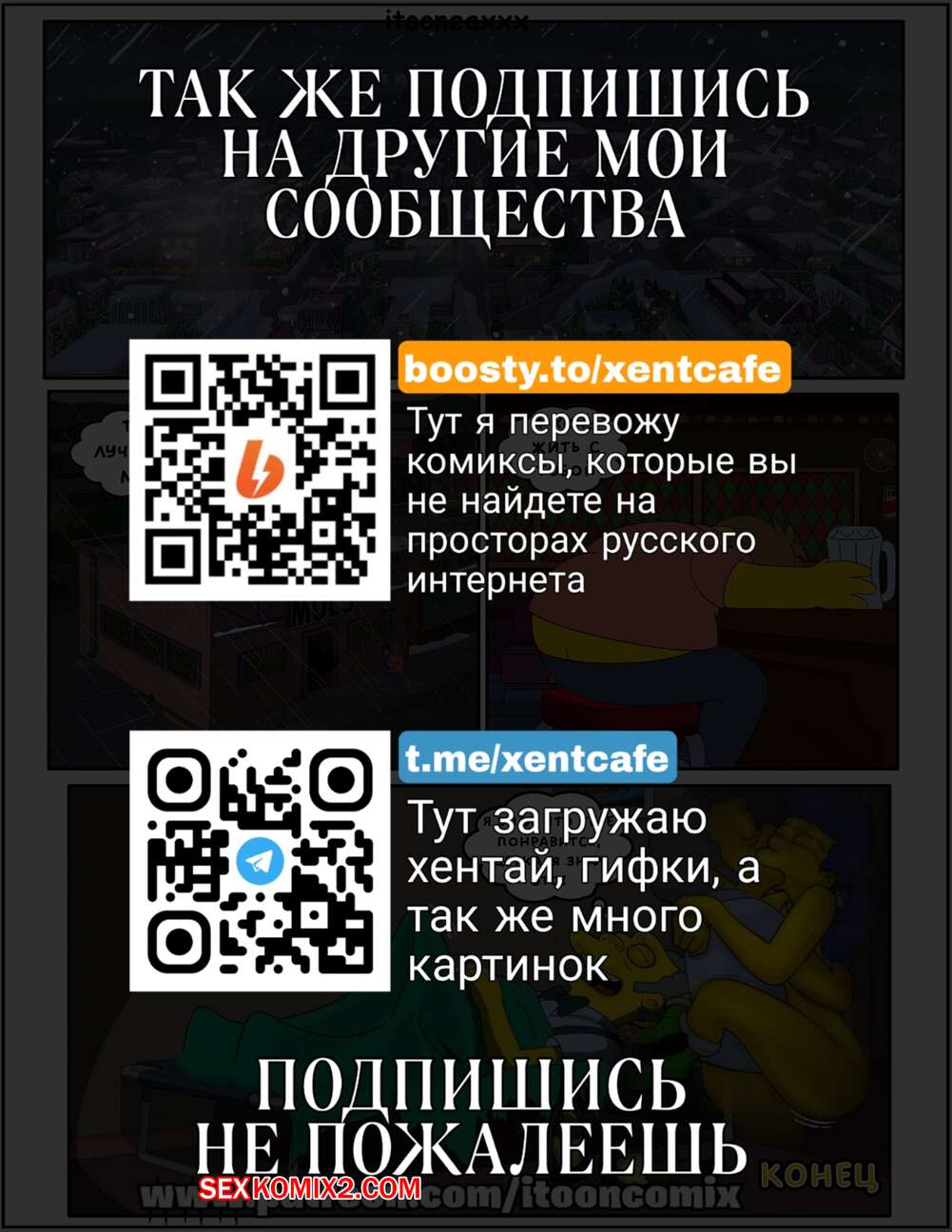 Порно комикс Симпсоны. Часть 8. Сексуальное Рождество. Эпизод 2. IToonEAXXX Сисястая милфа решила продолжить праздновать рождество. Она отправилась на встречу к друзьям своего мужа, чтобы показать им свое шикарное тело, отсосать у них и дать им себя выебать хорошенько.
