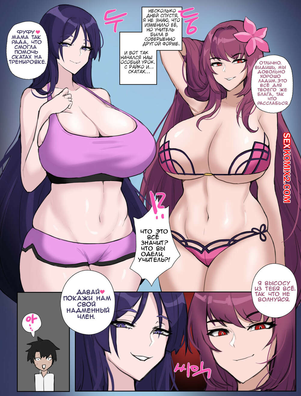 Порно комикс Fate Grand Order. Scathach and Minamoto No Raikou Две горячие сисястые красотки брюнетки решили повеселиться с парнем. Они разделись перед ним и стали сосать его большой хуй, после чего дала ему себя хорошенько выебать.